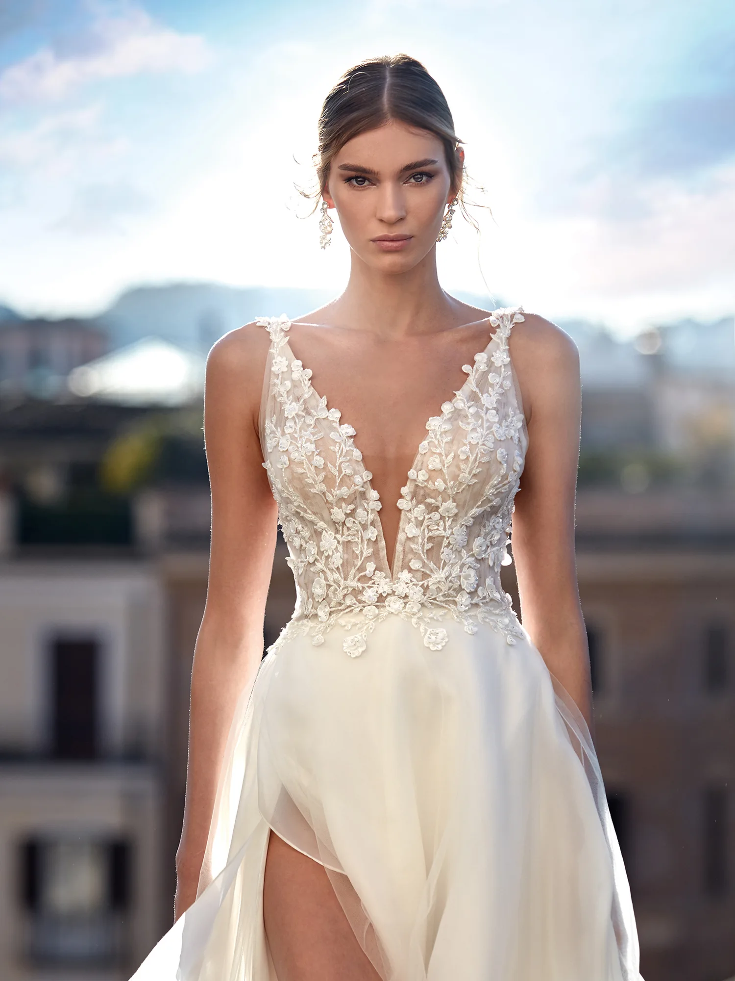 Einen charmanten Hochzeitslook kannst Du leicht mit dem Brautkleid Ashton von Nicole Milano kreieren. Florale Spitze überzieht das Oberteil aus gerafftem Organza und formt zudem die organisch wirkenden Träger. Perlen und Pailletten lassen das Muster glitzern. Ab der Taille fällt der gefütterte Rock mit natürlichem Volumen. Ein Schlitz an der Vorderseite erleichtert das Gehen.