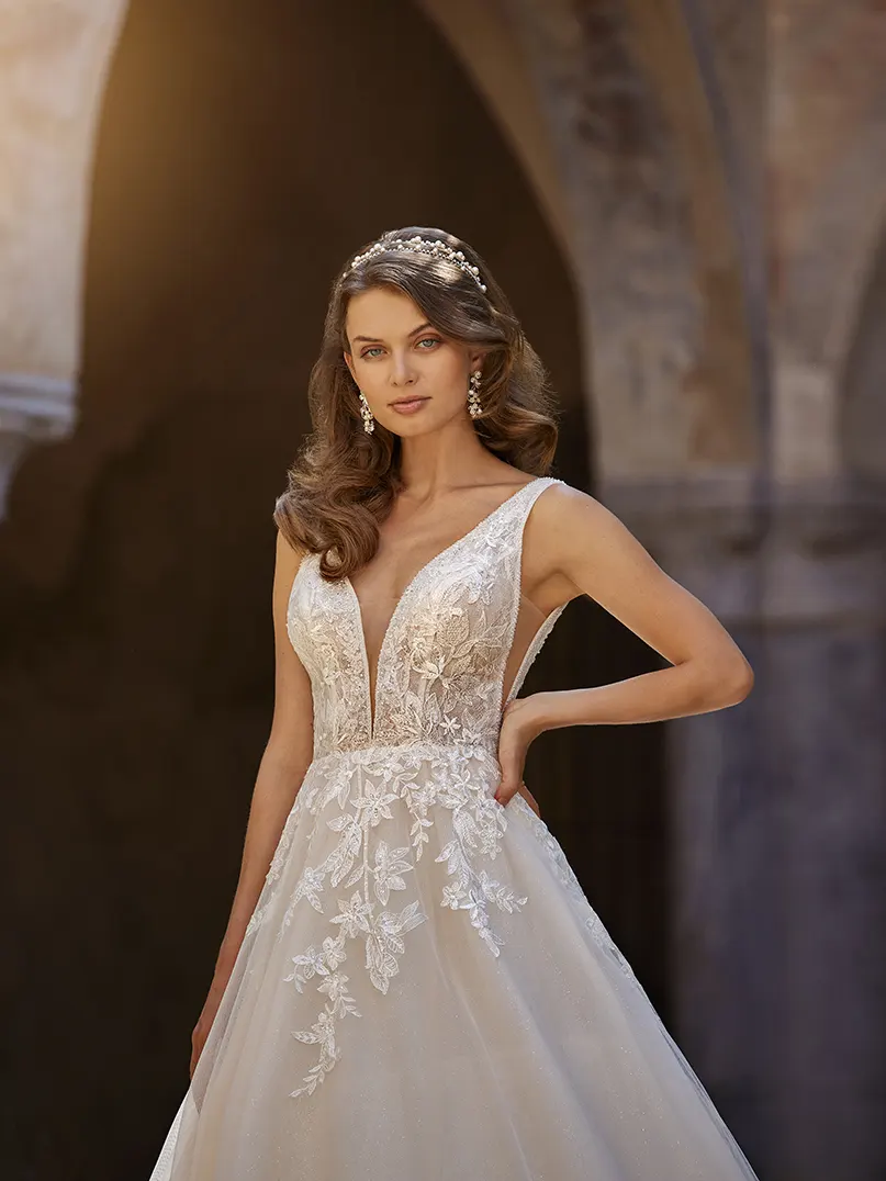 Das Brautkleid Carina von Nicole Milano zeigt glamourösen Glitzertüll in einer ausladenden Silhouette. Der champagnerfarbene Tüll ist am gesamten Oberteil sowie akzentuiert auf dem Rock mit floraler Spitze bedeckt. Perlen und Pailletten verleihen dem Muster zusätzlichen Glanz und Dimension. Seitenschlitze ergänzen die tiefen Ausschnitte. Der voluminöse Tüllrock endet in einer großflächigen Schleppe, die durch am Saum eingearbeitete Crinolborten lebendig anmutet.