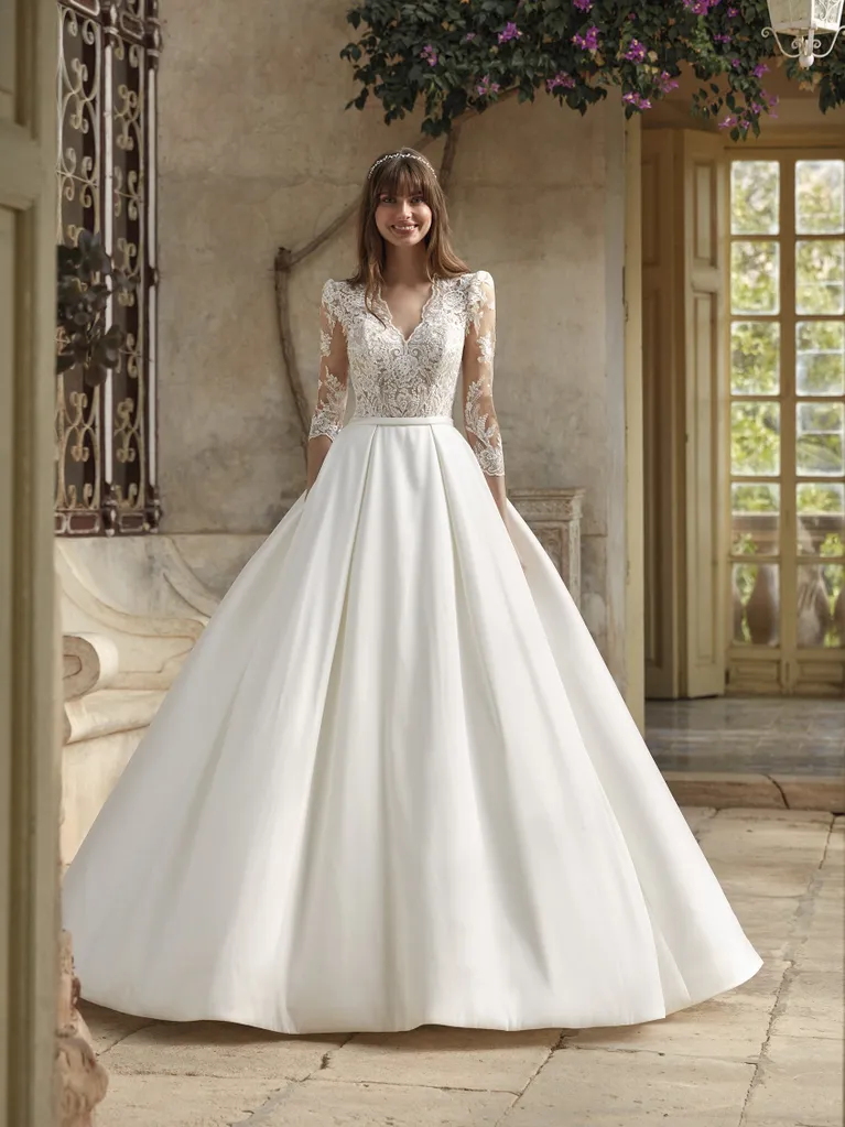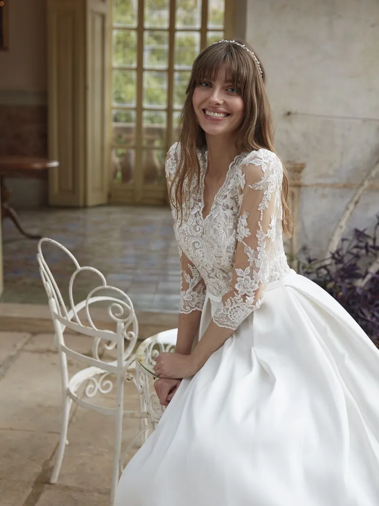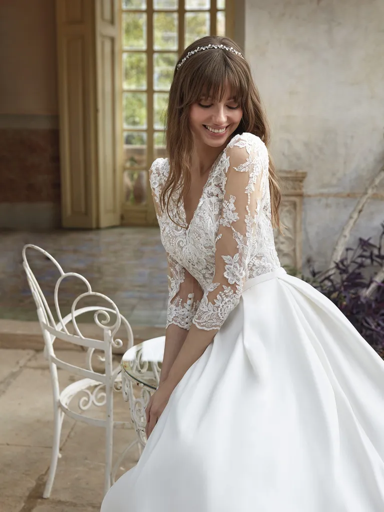 Das Brautkleid Herne von Nicole Milano ist ein royales Prinzessinnen-Brautkleid mit Dreiviertel-Ärmeln aus Spitze und cleanen Mikado-Rock.
