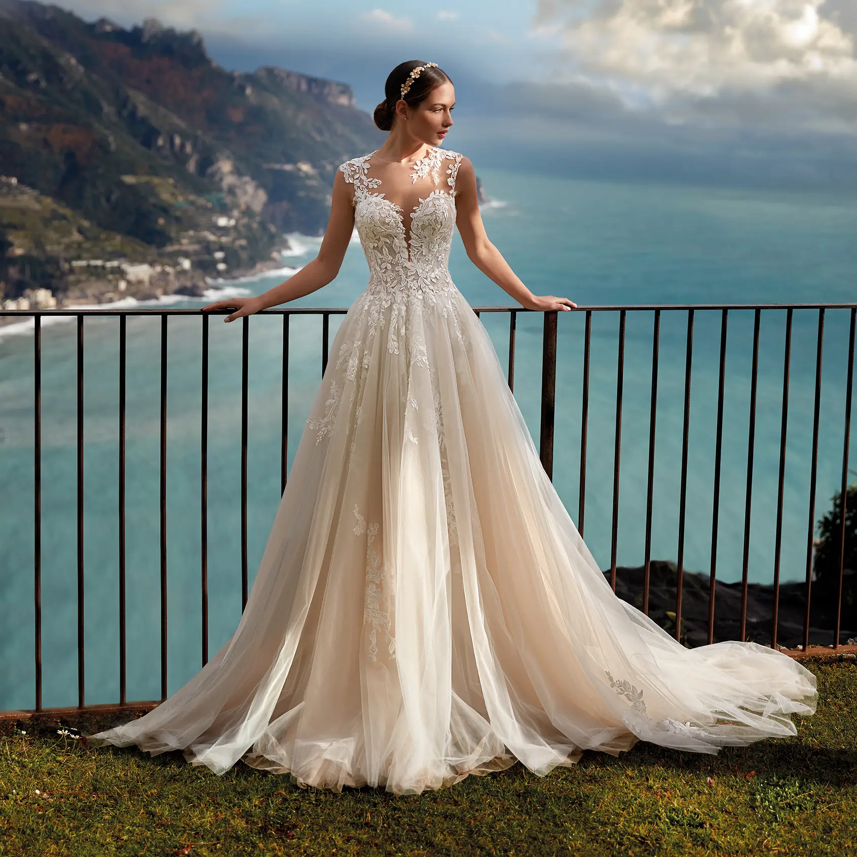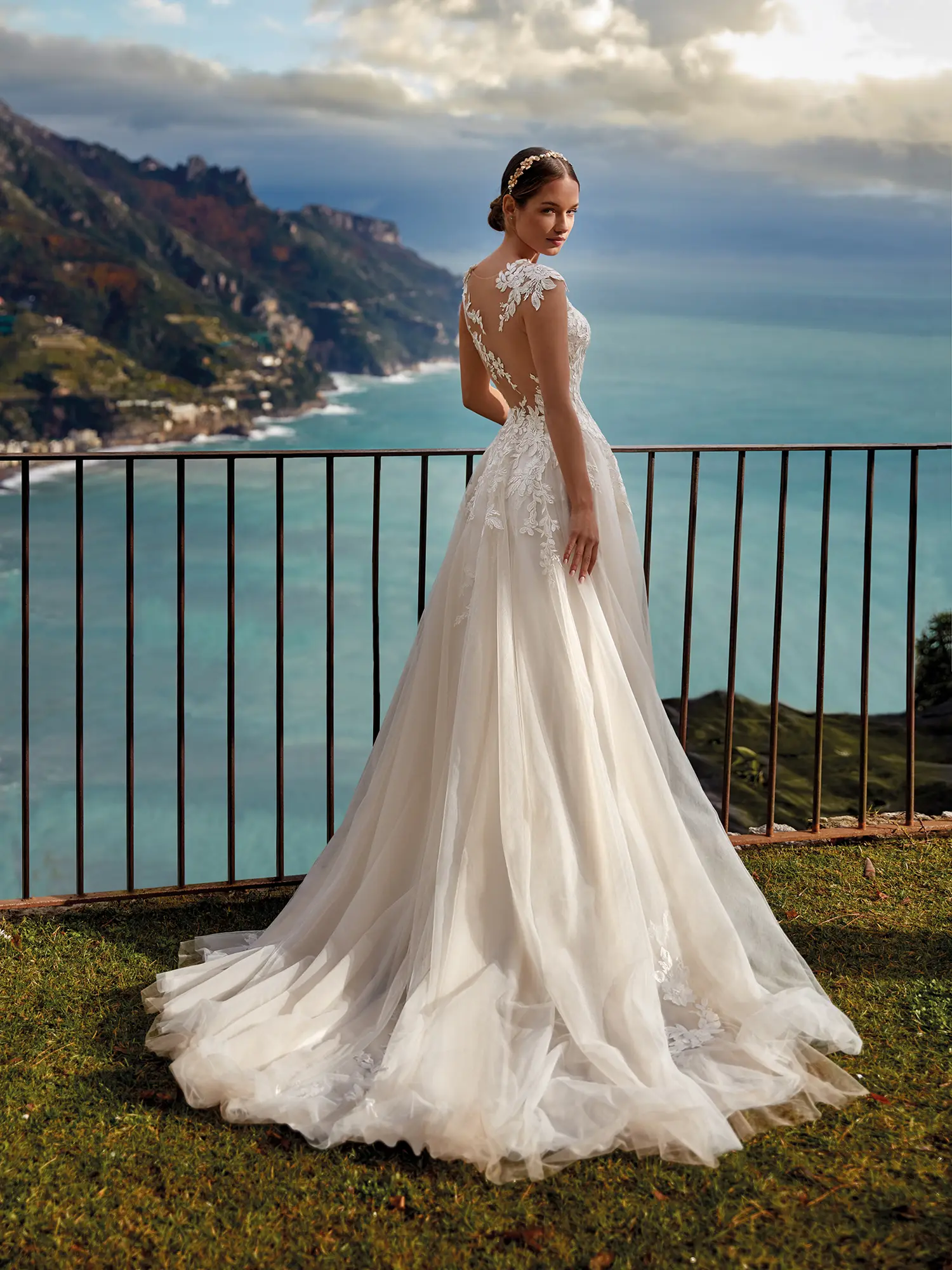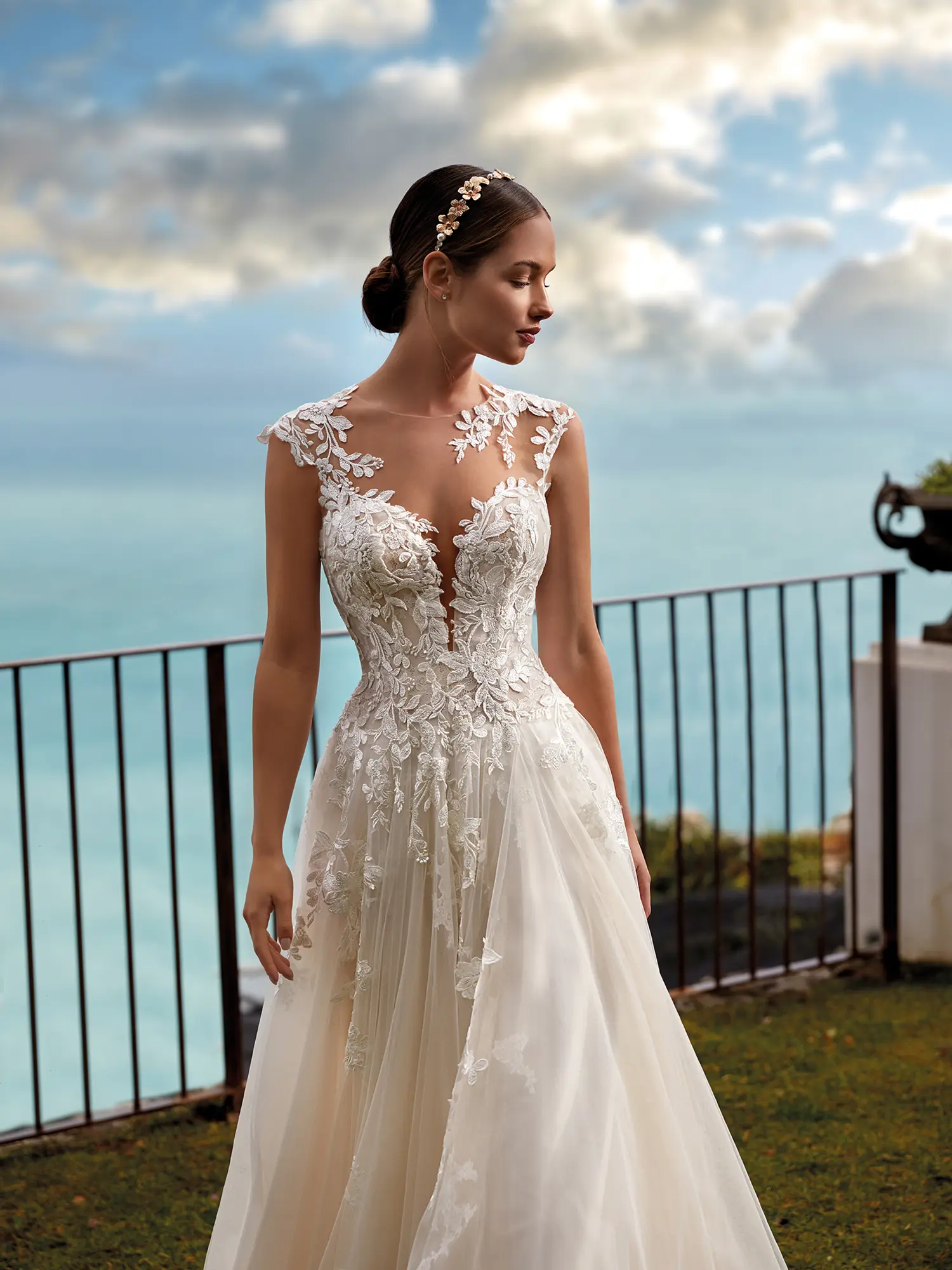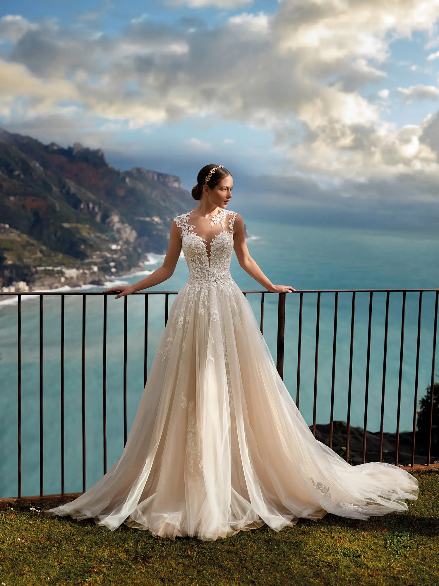Das Brautkleid Isadora von Nicole Milano hüllt Dich in zarte Lagen Spitze und wunderschön geschichtete Spitze. Der Mix aus zarter Chantilly- und floraler Spitze bedeckt das Oberteil und rahmt den nur mit transparentem Netzstoff bedeckten Rücken. An der Vorderseite formt sie einen tiefen Herzausschnitt, wobei der hohe Rundhalsausschnitt aus Netzstoff Stabilität bietet. Der nudefarben gefütterte Tüllrock fällt in zahlreichen kleinen Falten zu Boden, rundum begleitet von der Spitze, die wiederum den Schleppensaum ziert.