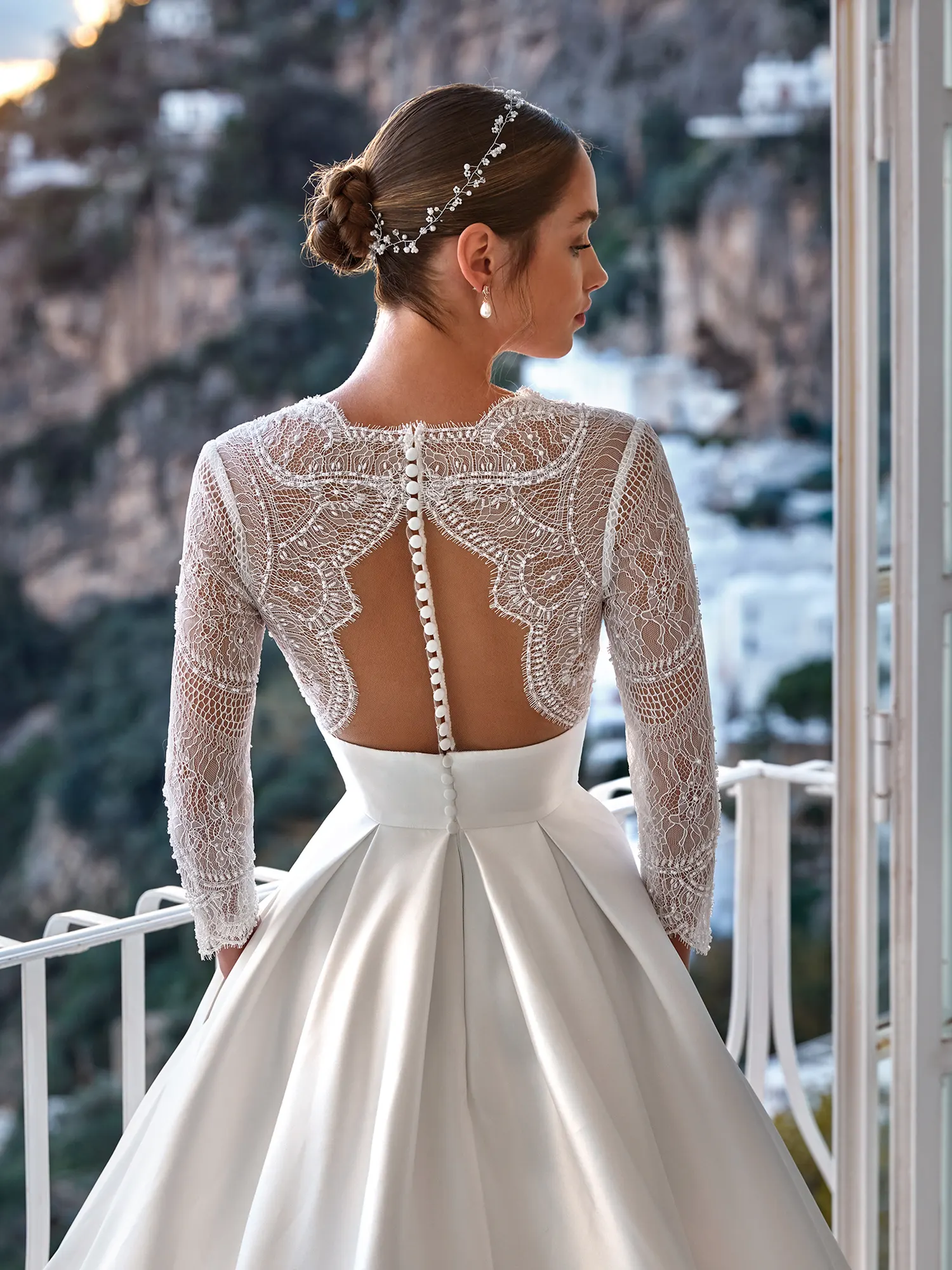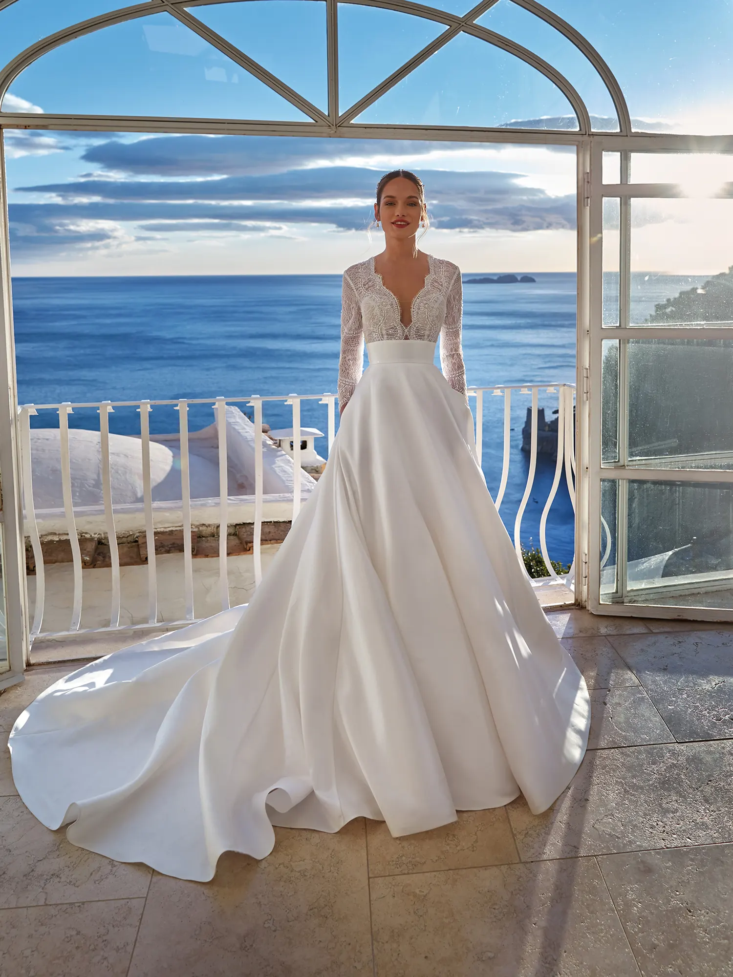 Das Brautkleid Kyra von Nicole Milano zeigt Spitze in modernem Muster und eine betonte Prinzessinnensilhouette. Das kurze Oberteil mit langen Ärmeln aus zarter Chantilly-Spitze ist dezent mit Perlen bestickt. Ein grafischer Ausschnitt im Stil des Art Déco rahmt das Dekolleté. Eine Knopfleiste verläuft vom Kragen über die transparente Rückenpartie bis zum Rockansatz. Unter einem Kummerbund fächert sich der Rock aus Mikado in großen Kellerfalten auf. Den Abschluss bildet eine schlichte, großflächige Schleppe.
