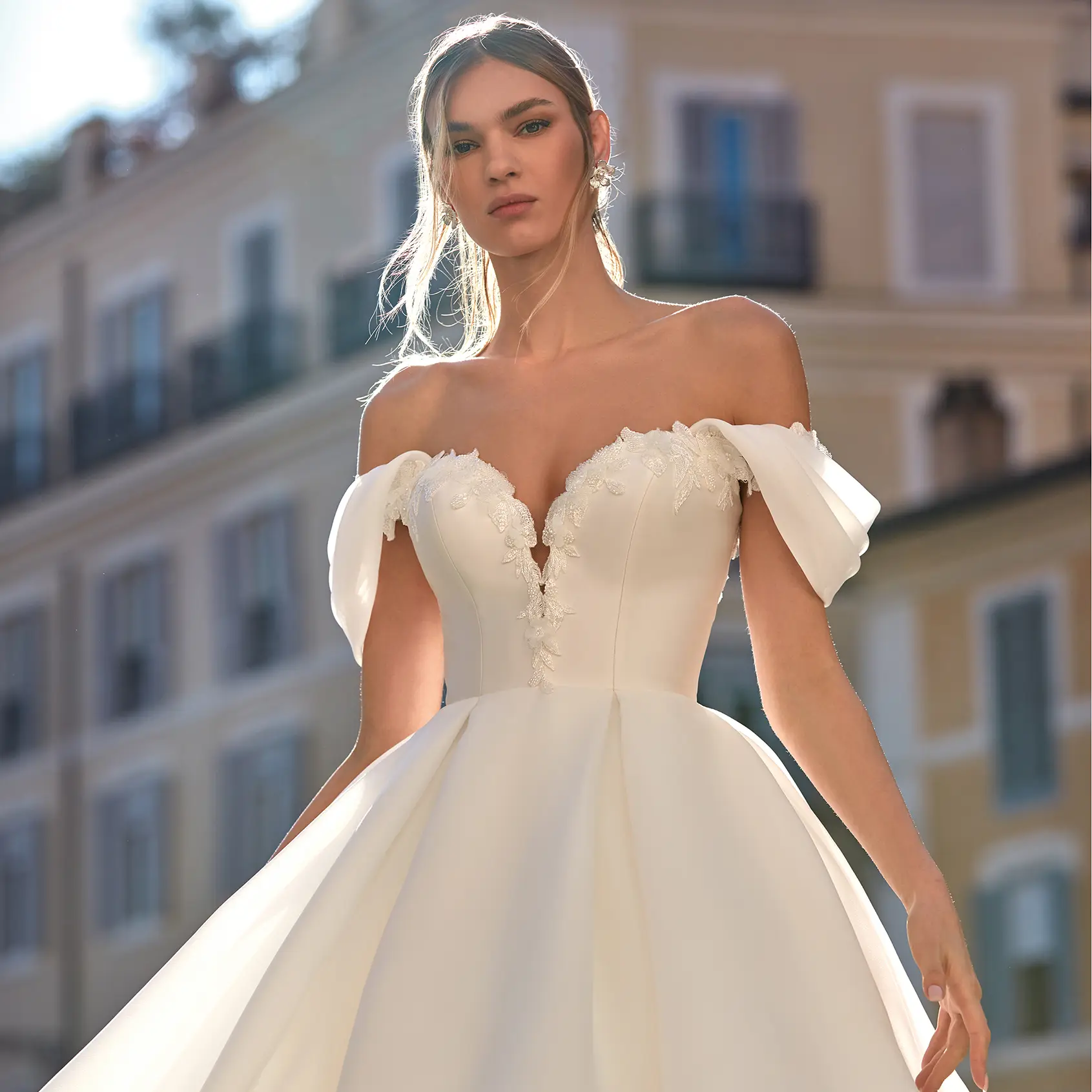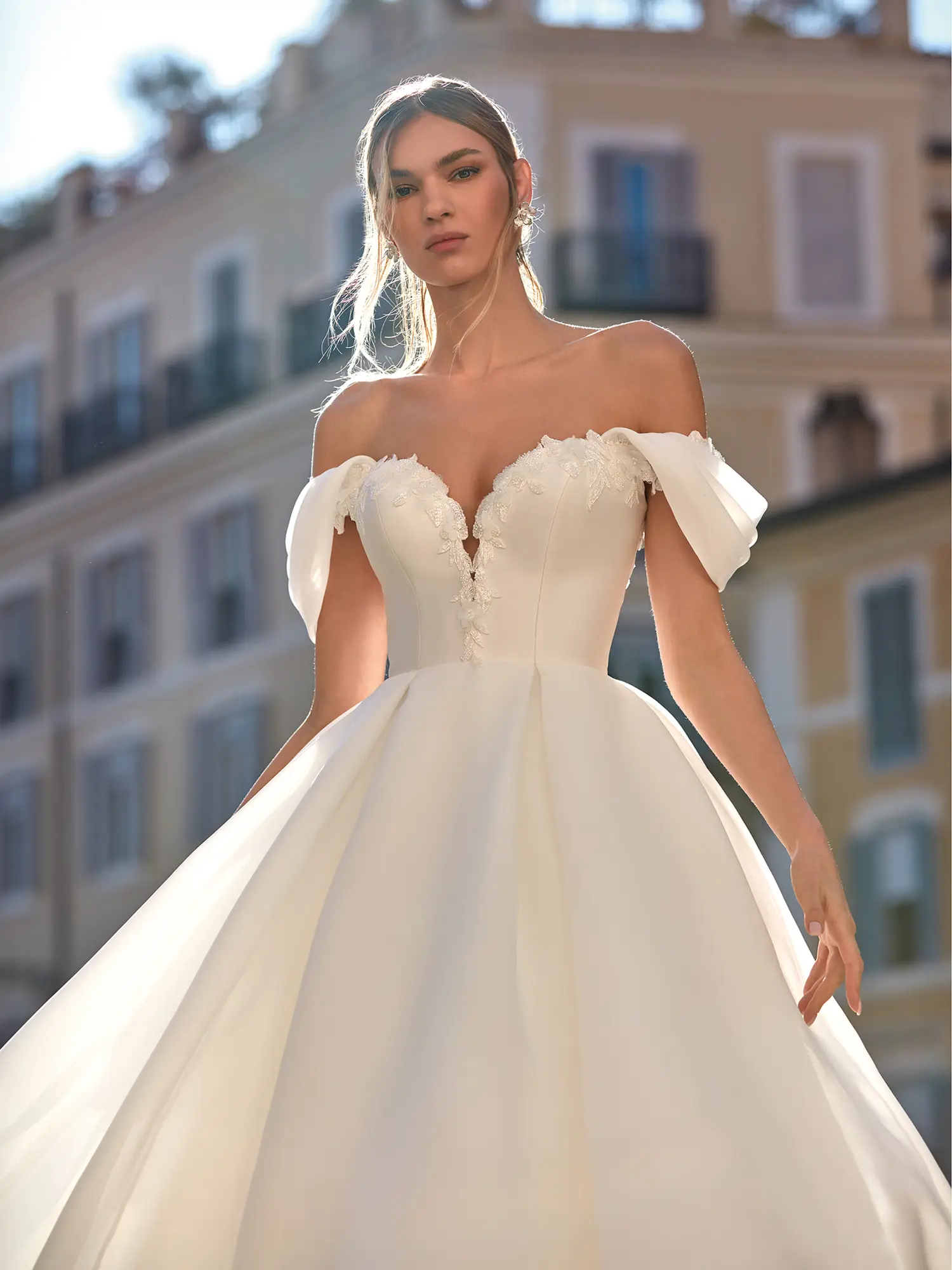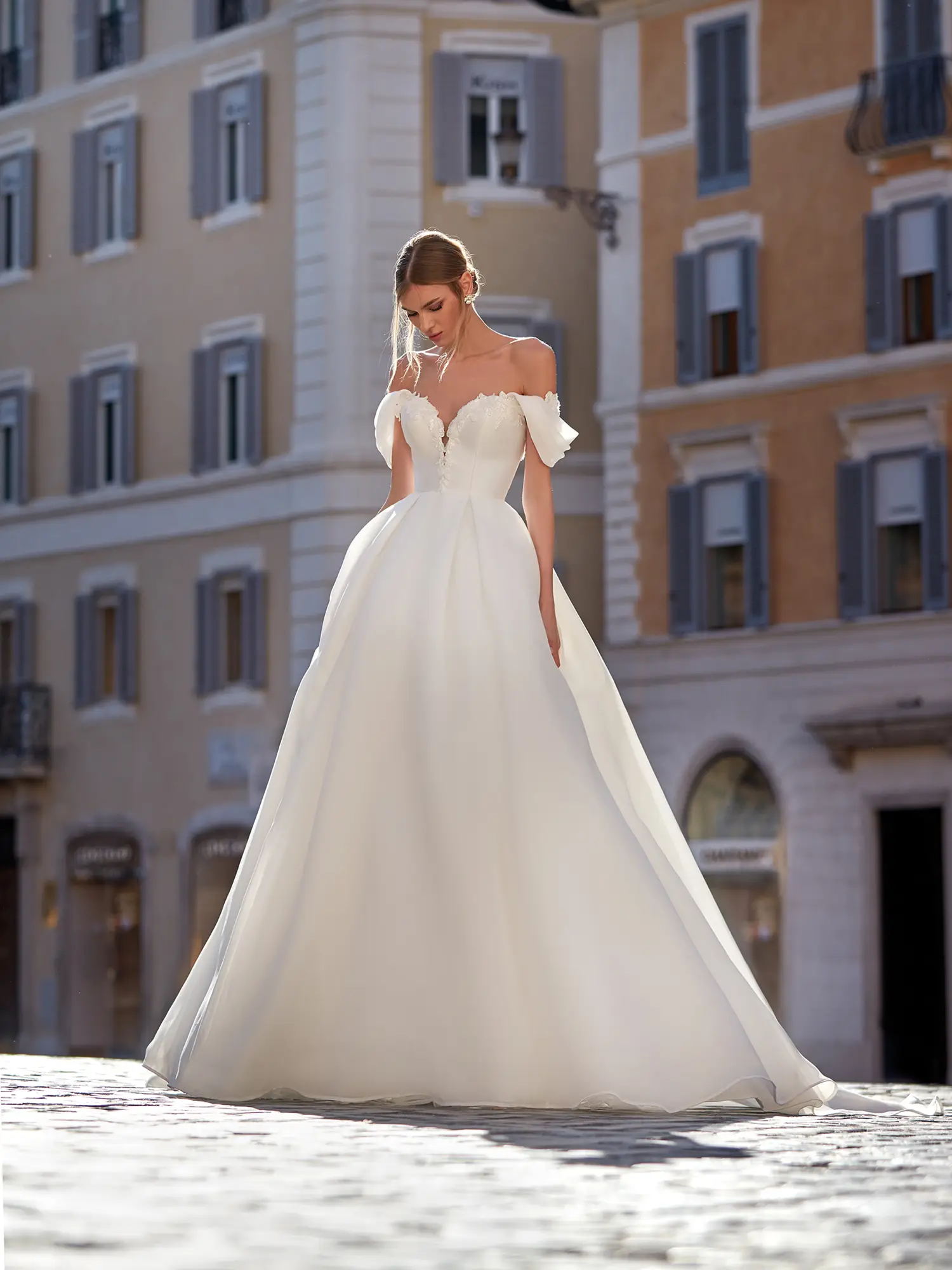 Das Brautkleid Laurie von Nicole Milano begeistert mit seiner ausgeprägten Silhouette und detaillierter Verzierung. Der aus Organza gefertigte Entwurf ist am tiefen Dekolleté mit Spitze aus glänzenden Fäden, 3D-Blütenapplikationen und Perlen verziert. Seitlich ansetzende, gefaltete Träger erzeugen einen Carmen-Ausschnitt. Eine Knopfleiste durchzieht die transparente Rückenpartie. Darunter bauscht sich der schlichte Rock durch weite Kellerfalten und geht über in eine glatte Schleppe.