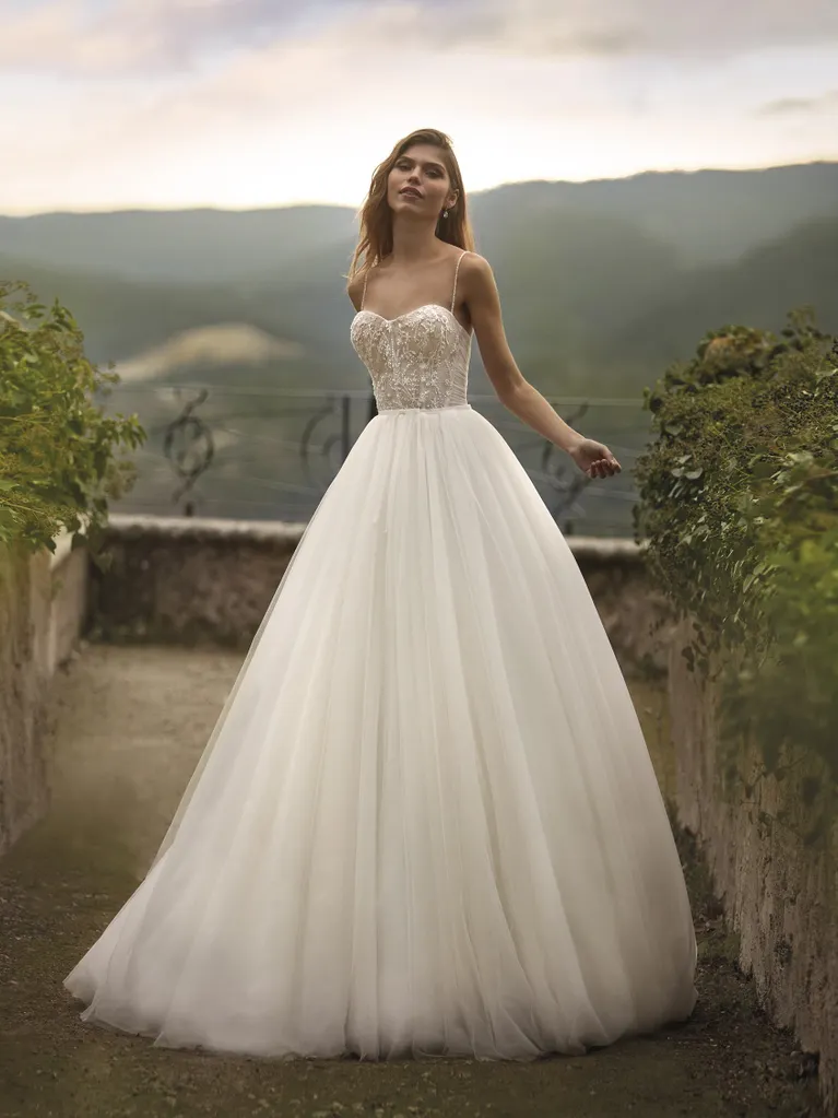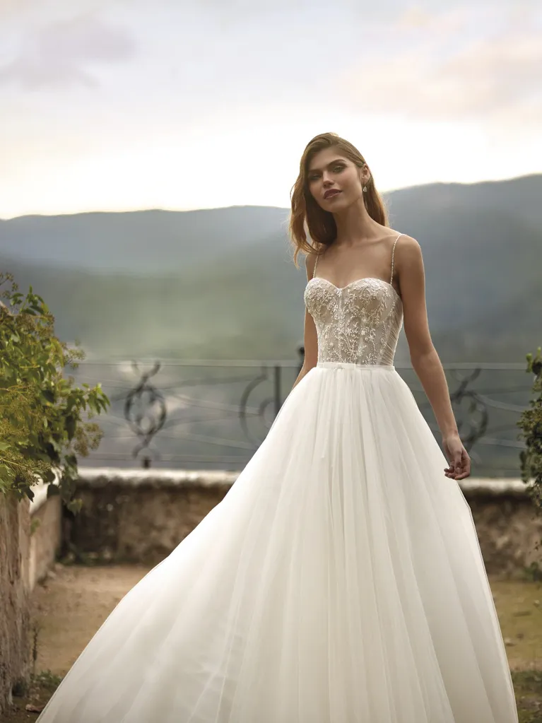 Das Brautkleid Lija von Nicole Milano ist ein ausladendes A-Linien-Brautkleid, das auch mit Reifrock als Prinzessin getragen werden kann.