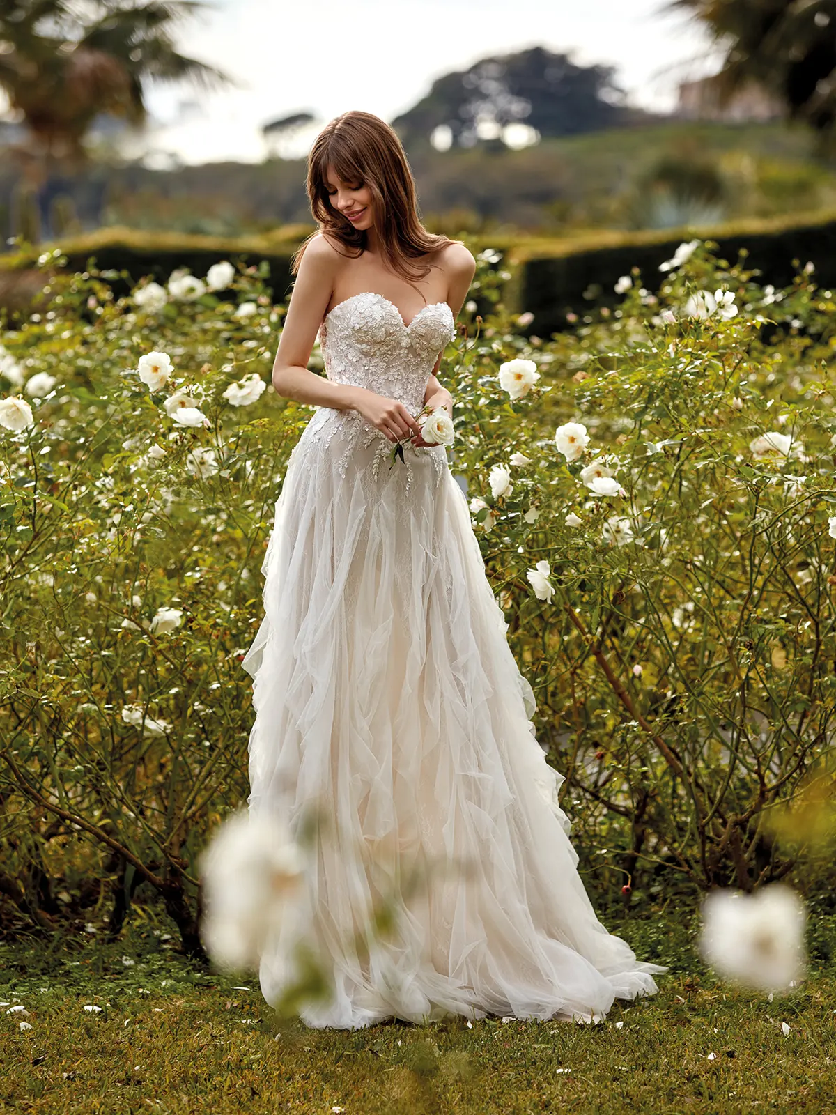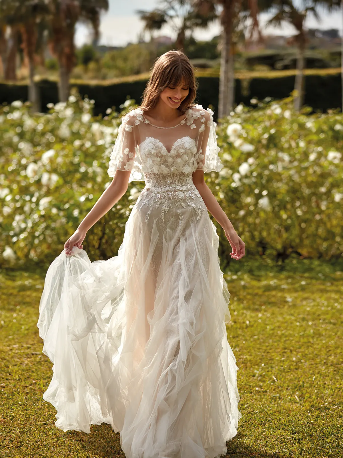 Nicole Milano hat mit dem Brautkleid Magenta einen romantischen Vintage- und Boho-Traum geschaffen. Das Modell aus Tüll ist mit geschichteter Chantilly- und floraler Spitze bedeckt. Am trägerlosen Mieder sind zudem unzählige Perlen und Pailletten in verschiedenen Größen sowie 3D-Blütenapplikationen aufgestickt. Der nudefarben gefütterte, lichtdurchlässige Tüllrock fließt in unzähligen kleinen Volants zu Boden. Das kurze, transparente und mit weiteren 3D-Blütenapplikationen bestickte Cape fügt ein charmantes Vintage-Element hinzu.