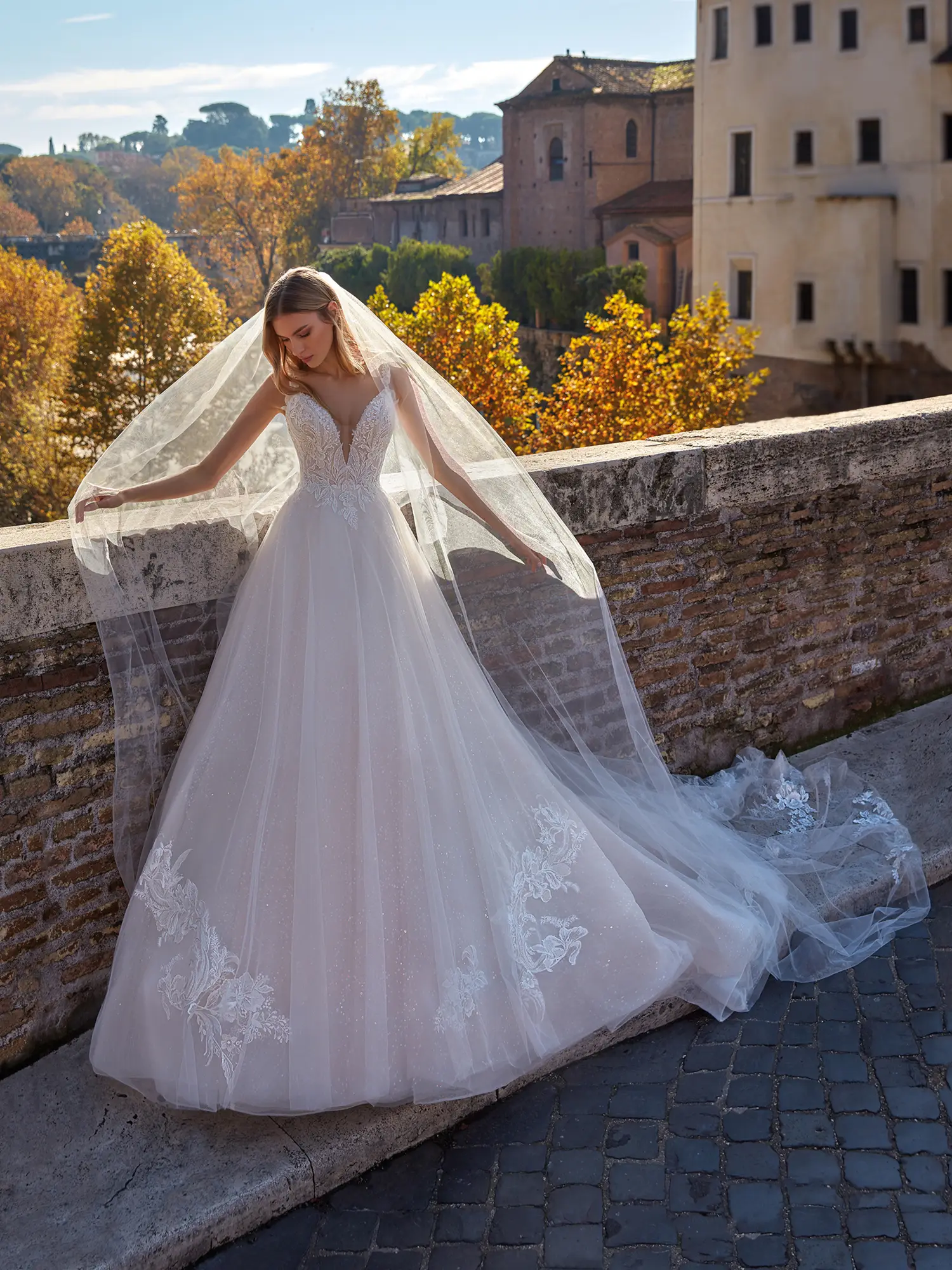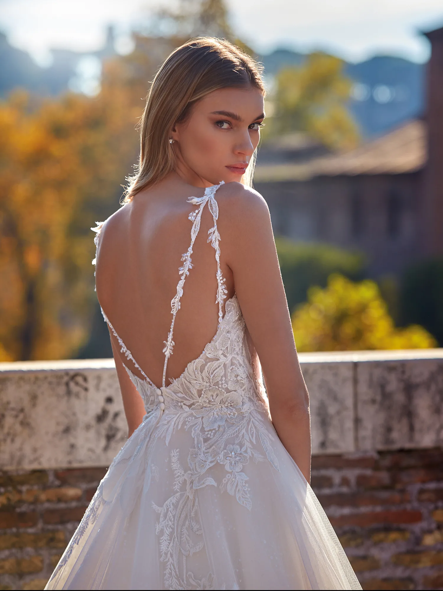 Nola von Nicole Milano ist ein ausgeprägt klassisches Brautkleid mit funkelnden Details. Das semitransparente Oberteil ist mit paillettenbestickter Spitze bedeckt, die außerdem den Rock akzentuiert. Entlang des Ausschnitts verläuft ein Perlenband. Am Rücken teilen sich die mit Spitze, Perlen und Pailletten geschmückten Spaghettiträger auf und betonen dadurch den tiefen Ausschnitt. Der Rock aus Glitzertüll ist weit ausgestellt. Eine Crinolborte verstärkt den Saum, sodass dieser lebendige Falten wirft.