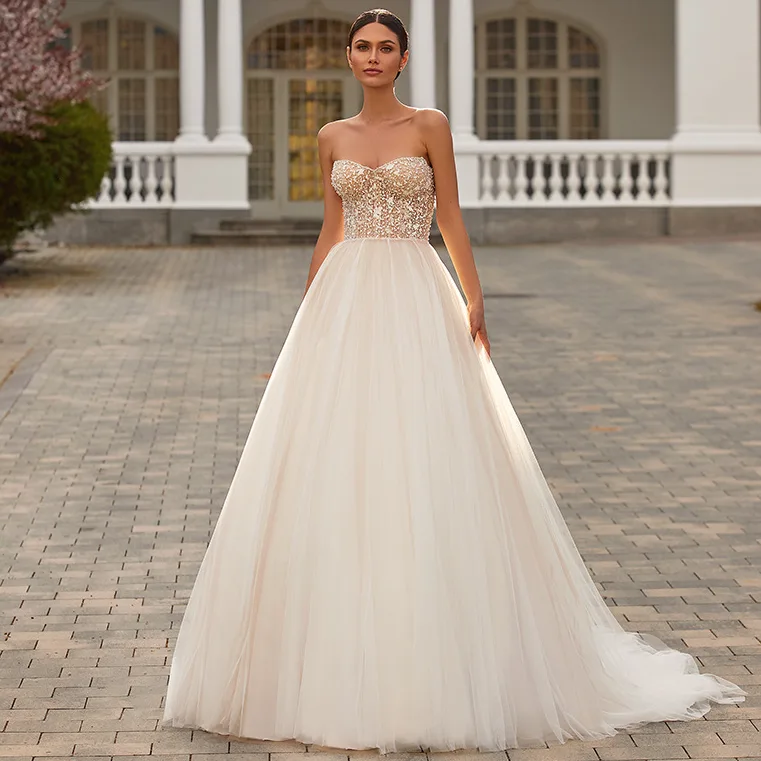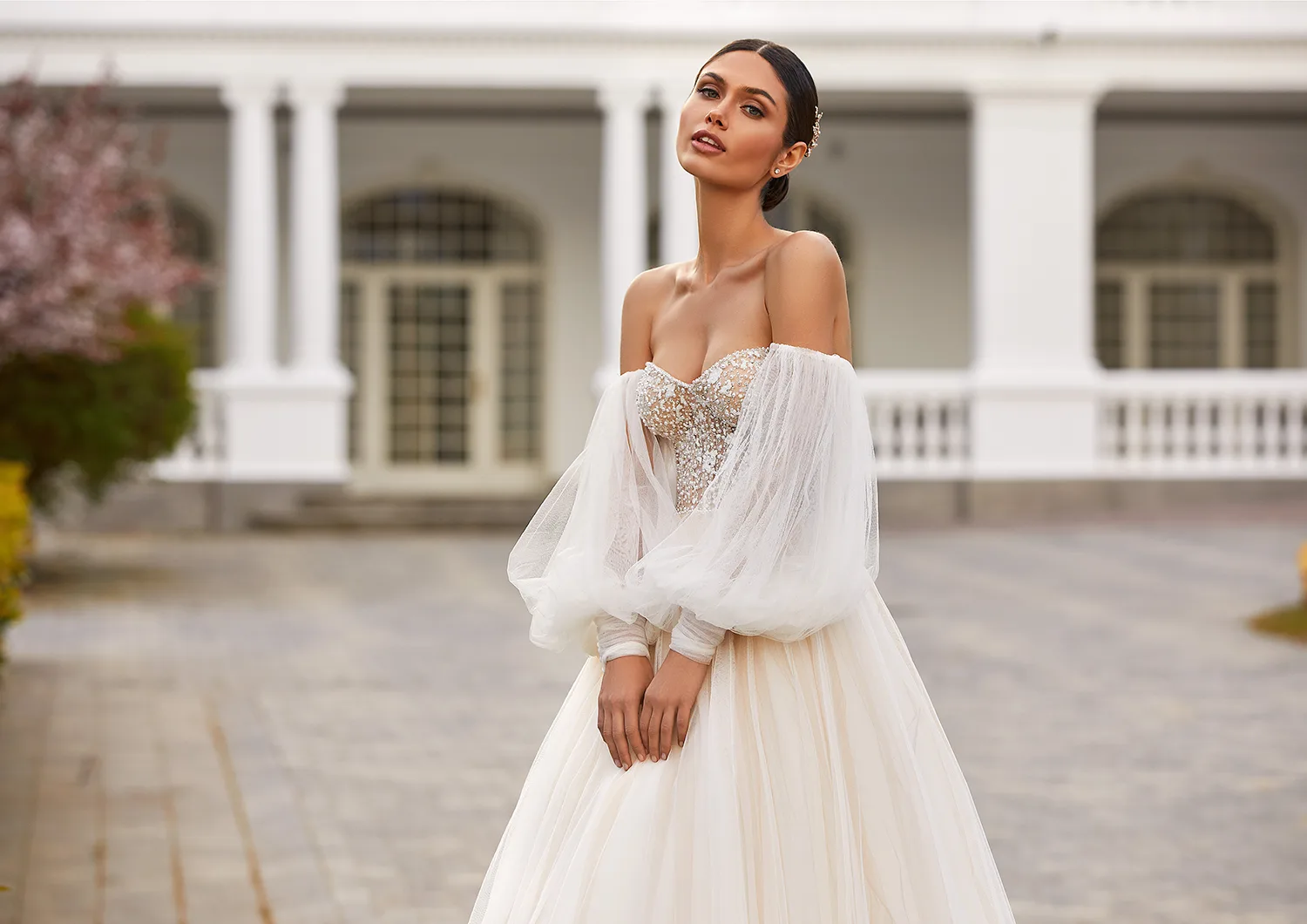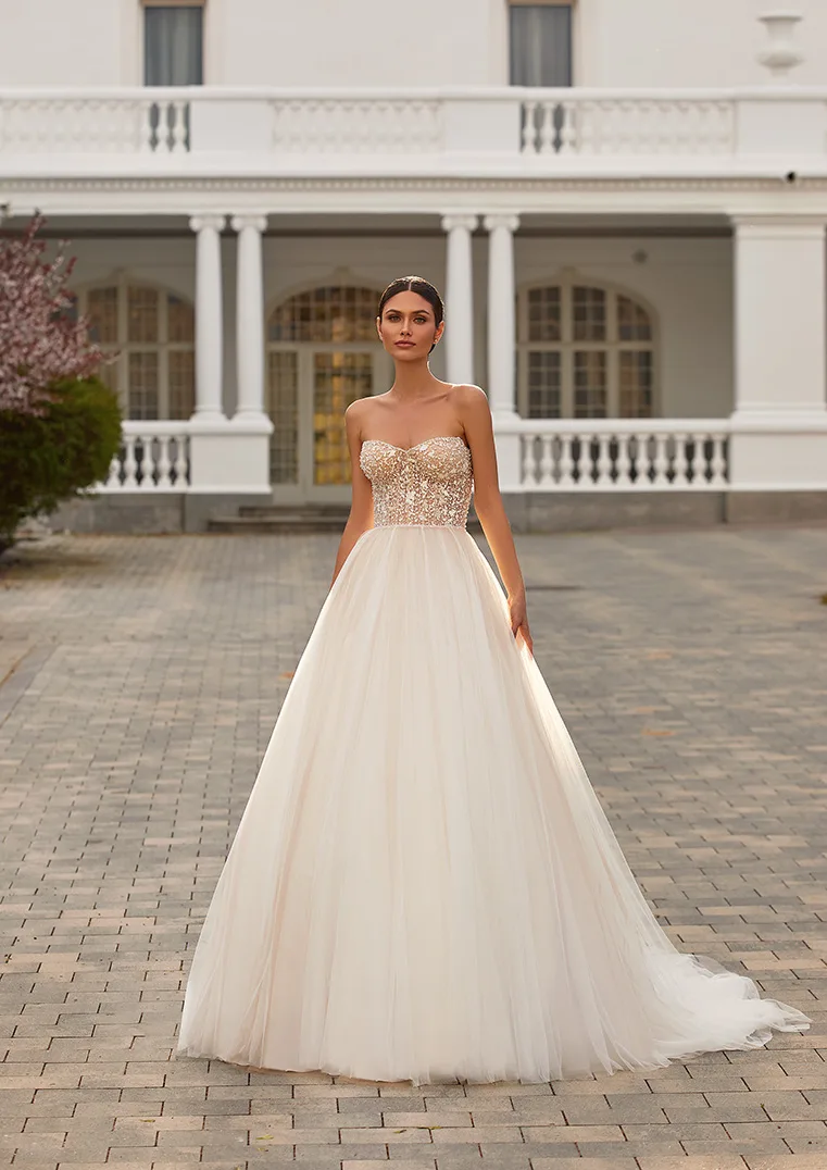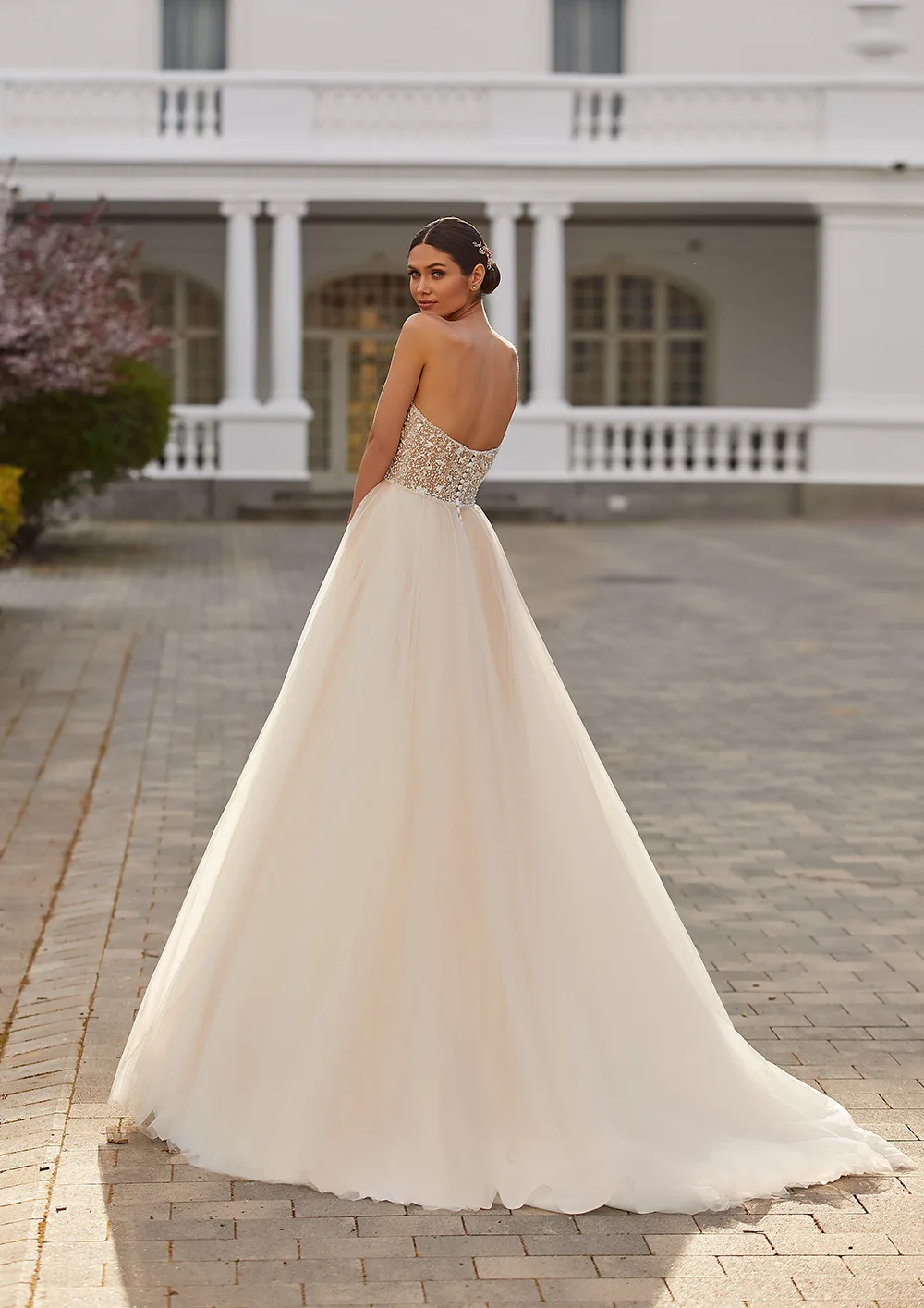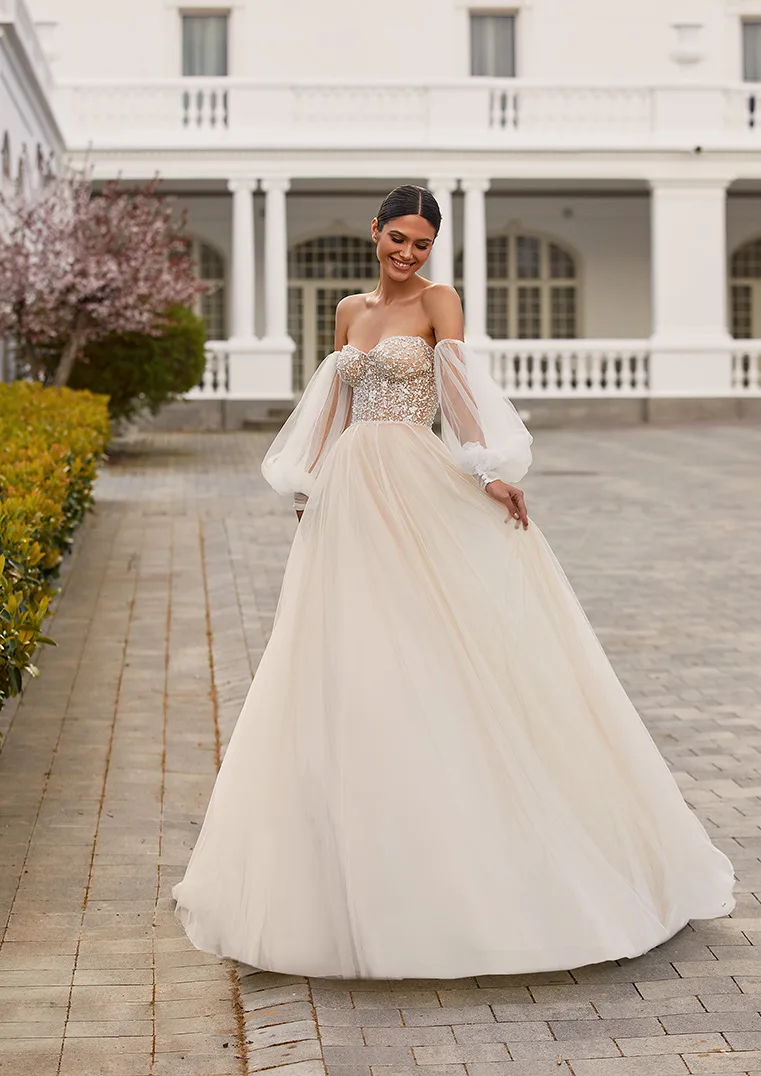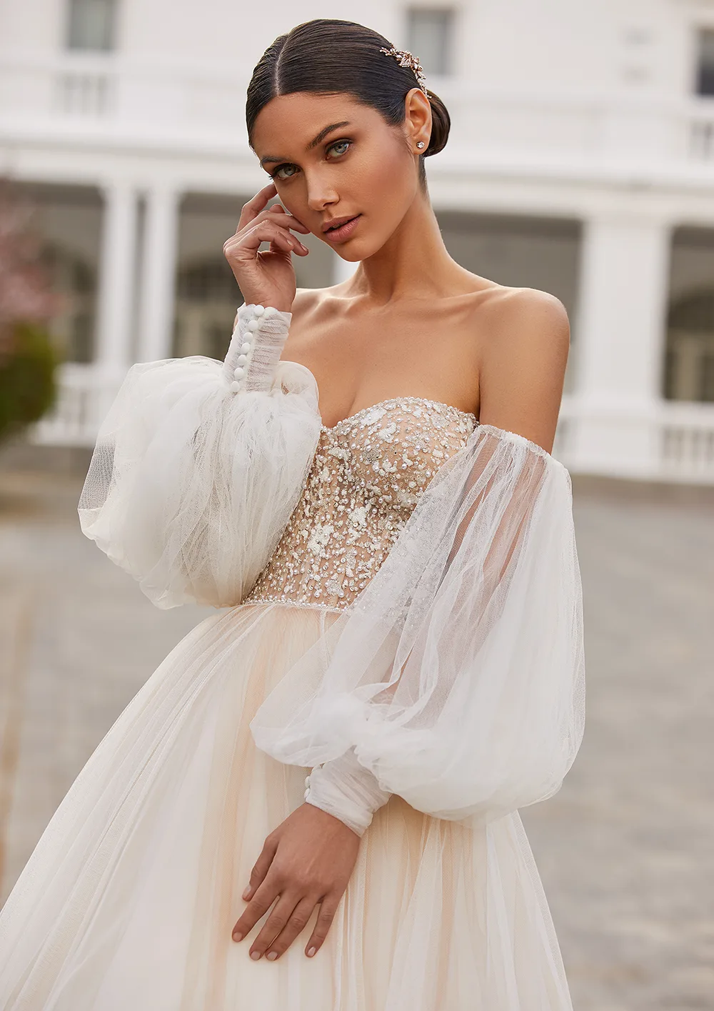 Das Brautkleid Drew von Pronovias hebt mit seiner betonten Silhouette sowie seinem extravaganten Mieder Deine glamouröse Seite hervor. Das trägerlose Oberteil ist transparent mit sichtbaren Stäbchen gearbeitet sowie über und über mit Perlen und Pailletten bestickt. An der Rückseite verläuft eine Knopfleiste. Die separaten Bischofsärmel aus voluminösem Tüll besitzen ebenfalls Bündchen mit Knopfleisten du verleihen dem Ensemble einen Hauch Boho-Chic. Der im Kontrast zum Oberteil schlichte, zart nudefarben unterlegte Tüllrock schwingt weit ausgestellt über den Boden.