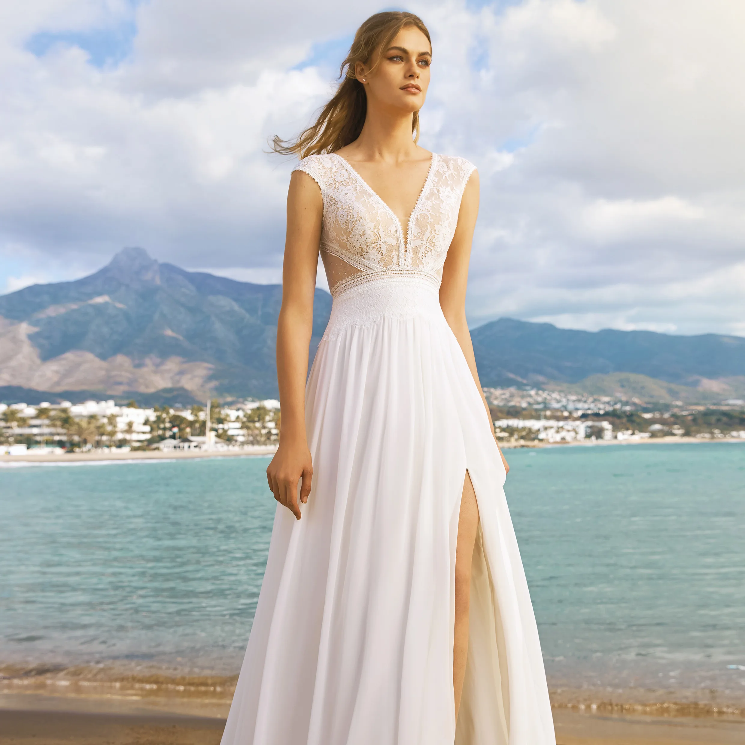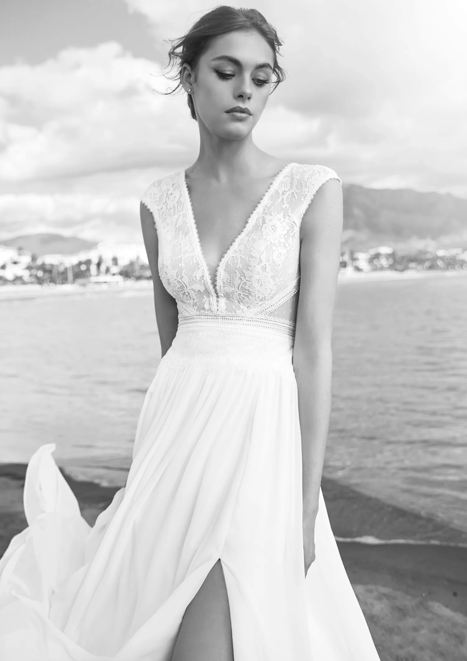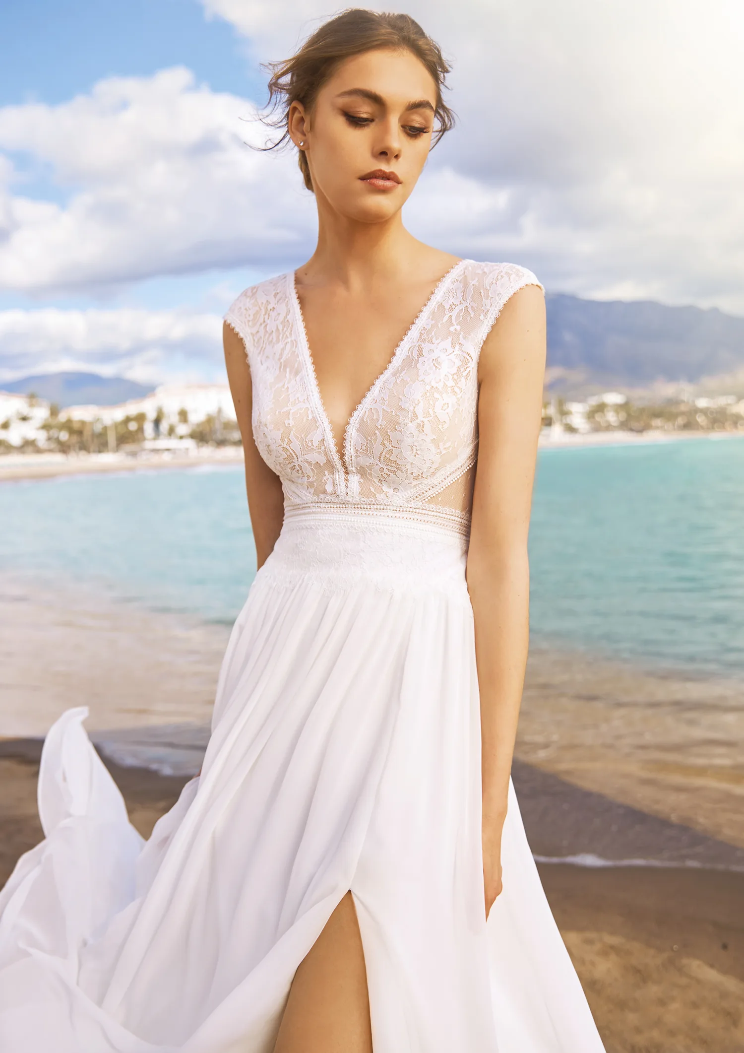 Das Brautkleid Mitzi von Pronovias ist eine wunderbare Mischung beliebter Stilrichtungen. Das Oberteil mit Partien aus Plumetistüll sowie floraler Spitze besitzt am transparenten Rücken eine Perlen-Knopfleiste und erinnert an Vintage-Entwürfe. Unter einem breiten Taillenband fließt ein leichter Chiffonrock zu Boden. Ein Schlitz an der Vorderseite sorgt für Bewegungsfreiheit – ganz im Sinne der Boho-Philosophie.
