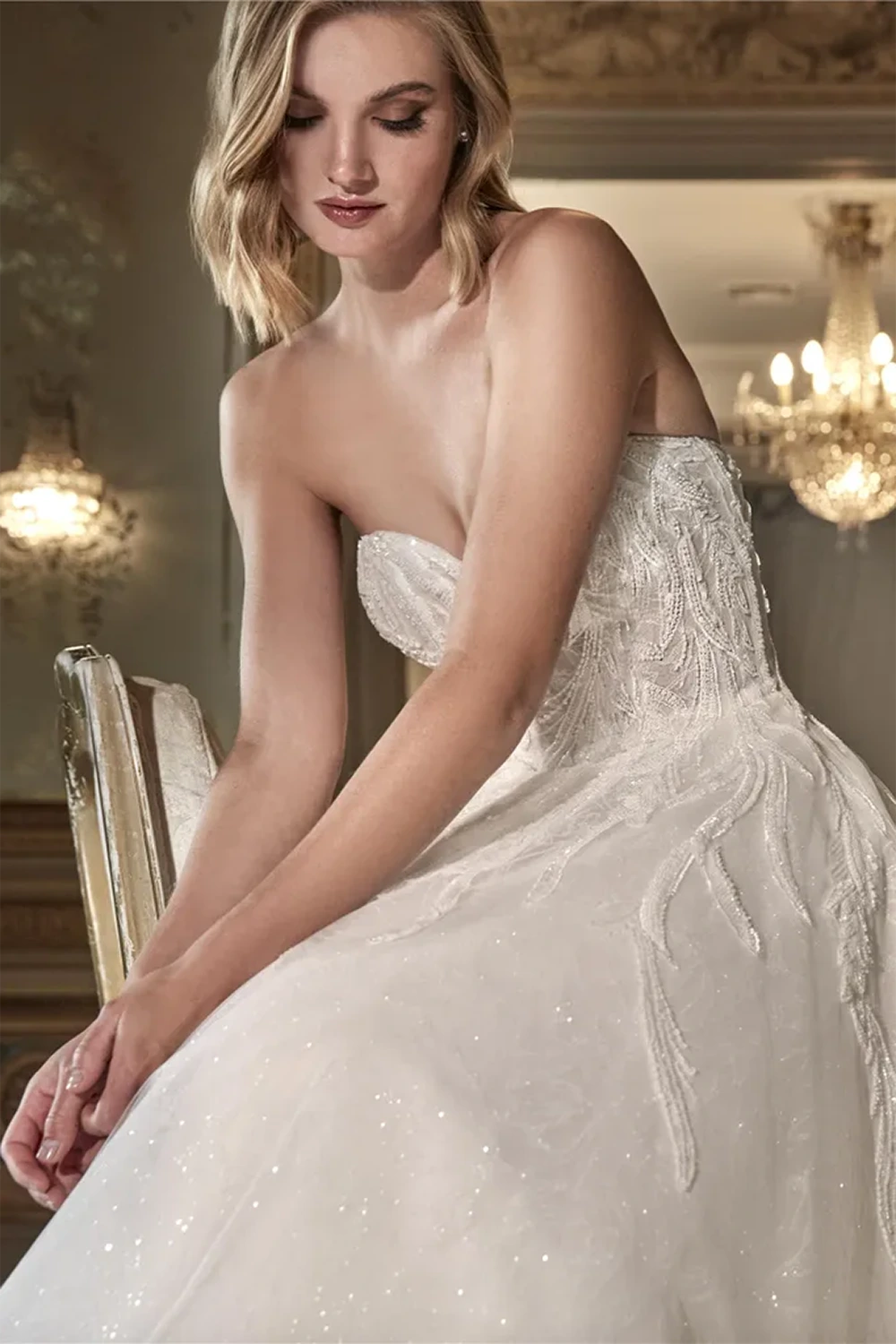 Das Modell Aconita von Pronovias ist ein funkelndes Prinzessinnen-Brautkleid (weite A-Linie) mit romantischem Sweetheart-Ausschnitt, das zarte Spitze, schimmernde Perlen und glitzernde Details vereint.