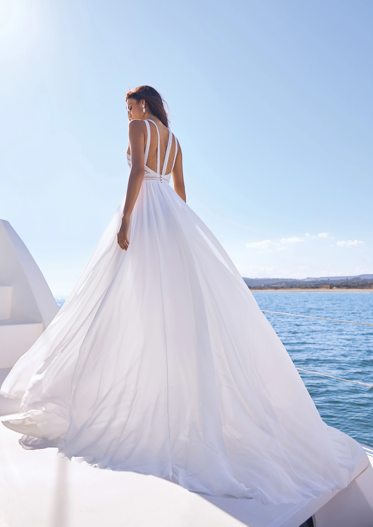 Pronovias hat mit Frida ein Brautkleid geschaffen, das den Boho-Look frei interpretiert. Florale Spitze bedeckt das transparente Oberteil. Zudem verlaufen gezackte Borten in grafischer Linienführung an der Vorderseite, die sich an der Rückseite zu Trägern aufteilen. Unter dem genköpften Taillenband fließt ein weit schwingender, da leichter Chiffonrock zu Boden. Zum Ausgleich der weiten Schleppe erleichtert ein Schlitz an der Vorderseite die Bewegung.