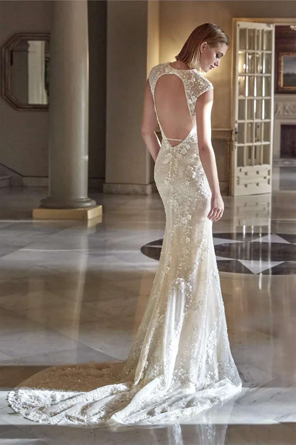 Das Modell Gessami von Pronovias ist ein modernes Fit und Flare Brautkleid mit leicht überschnittenen Ärmeln, floralen Applikationen und einem tiefen V-Ausschnitt.