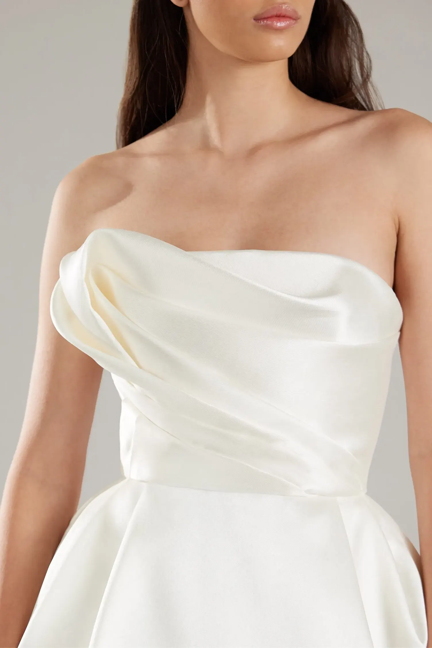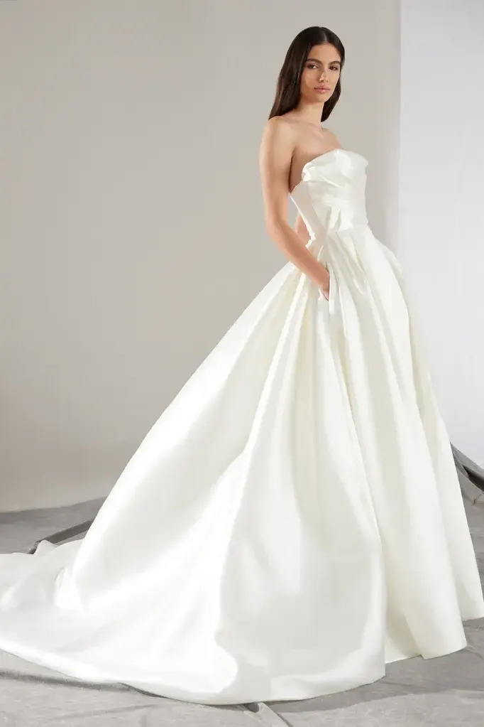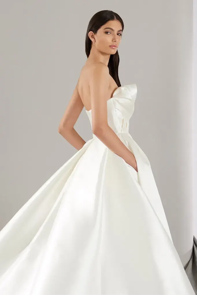 Das Brautkleid Khloe von Pronovias ist ein Prinzessinnen Brautkleid aus Mikado. Der Rock ist mit Taschen und einer Kathedralenschleppe versehen.