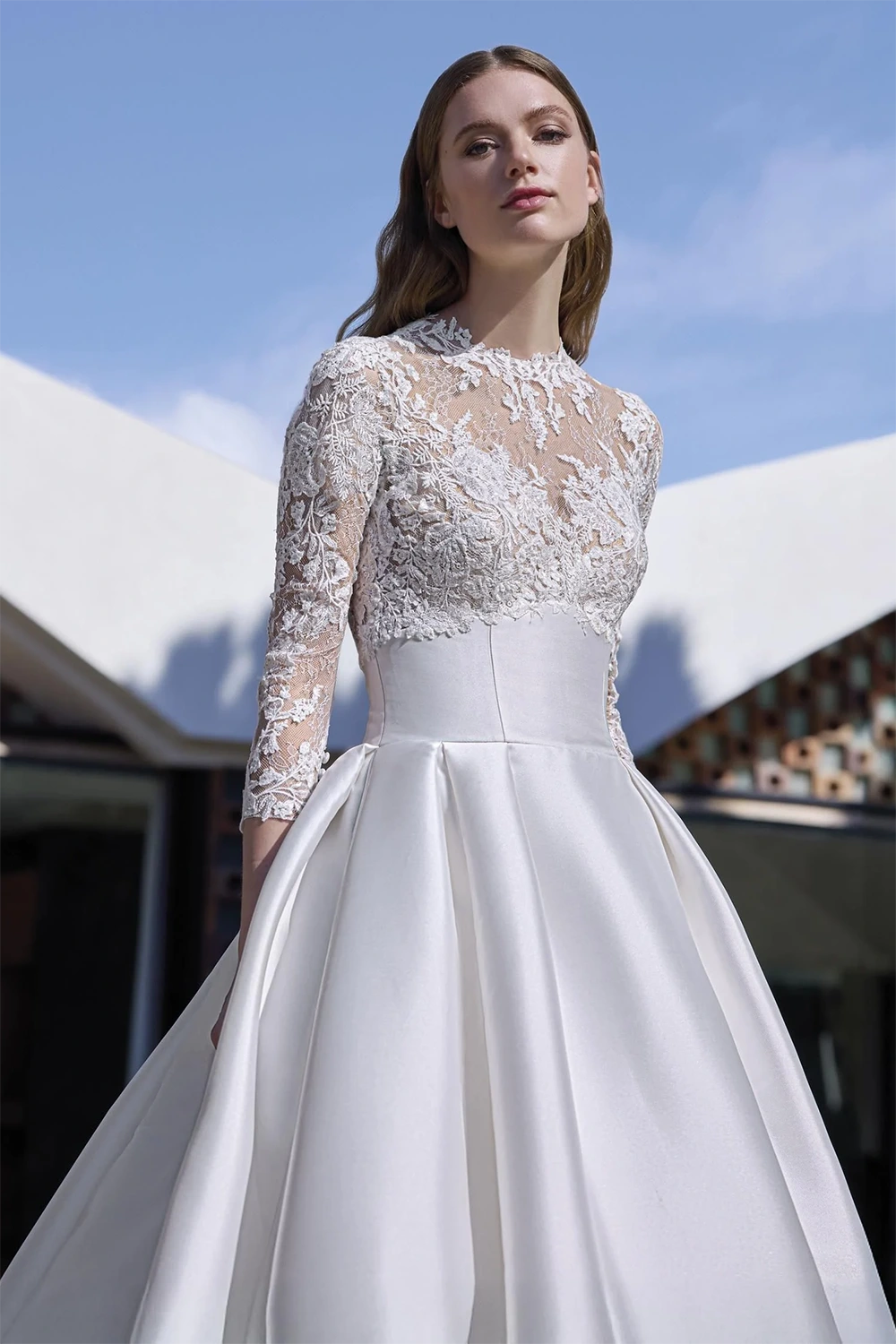 Das Modell Lilar von Pronovias ist ein Prinzessinnenkleid mit langen Ärmeln und rundem Ausschnitt besticht durch ein halbtransparentes Spitzenoberteil und einen Rock aus weichem Mikado. Perlen sorgen für subtilen Glanz und formen eine majestätische, feminine Silhouette mit modernem Charakter.