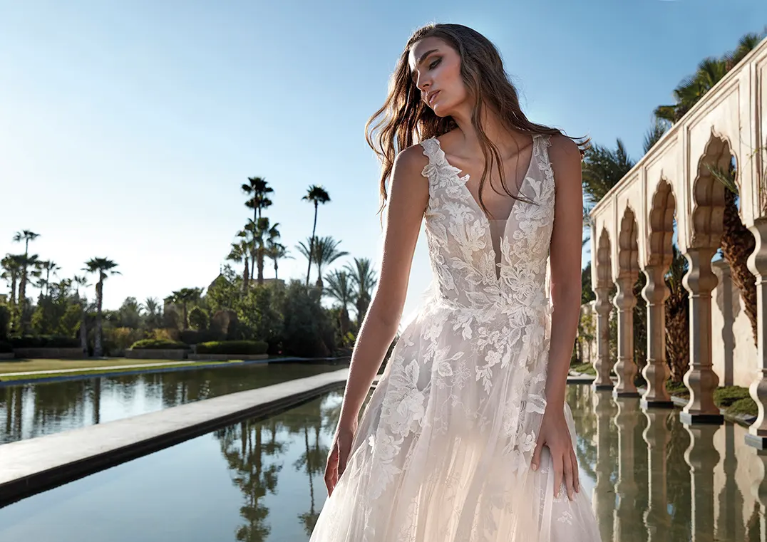 Das Brautkleid Visayas von Pronovias ist ein klassisches, romantisches A-Linien Brautkleid mit großblättriger Blütenspitze.