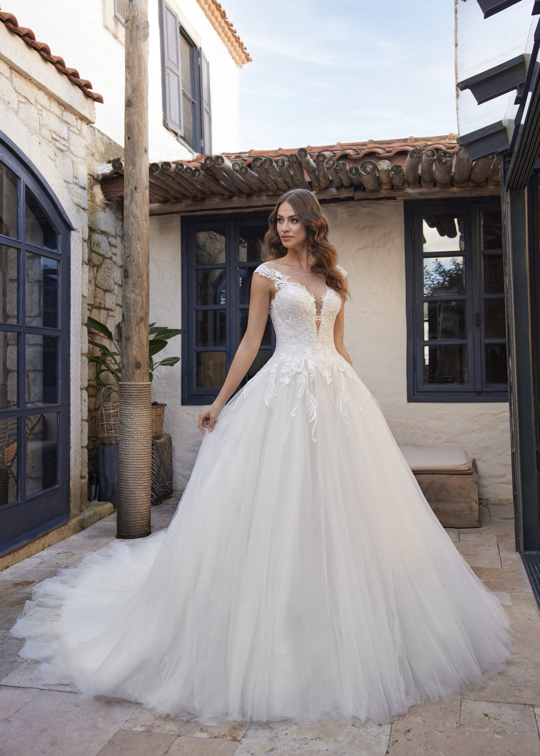 Neben seiner Silhouette begeistert das Brautkleid Cherie von Randy Fenoli vor allem durch sein aufwändig gearbeitetes Oberteil. So entsteht eine fabelhalte Prinzessinnenrobe. Symmetrische Spitze bedeckt das Mieder und rahmt den tiefen Herzausschnitt. Zudem bedeckt eine zarte Lage aus besticktem Netzstoff das Dekolleté und den Rücken. An den Schultern und der Rückenpartie entsteht dadurch ein Tattoo-Effekt. Außerdem betonen die zahllosen aufgestickten Pailletten das floral-barocke Muster. Eine lange Knopfleiste reicht auf der Rückseite vom Kragen bis in den Rockansatz. Der besonders weit aufgefächerte, mehrlagige Tüllrock des Modells Cherie von Randy Fenoli formt dazu auf dem Boden eine große, abgerundete Schleppe.