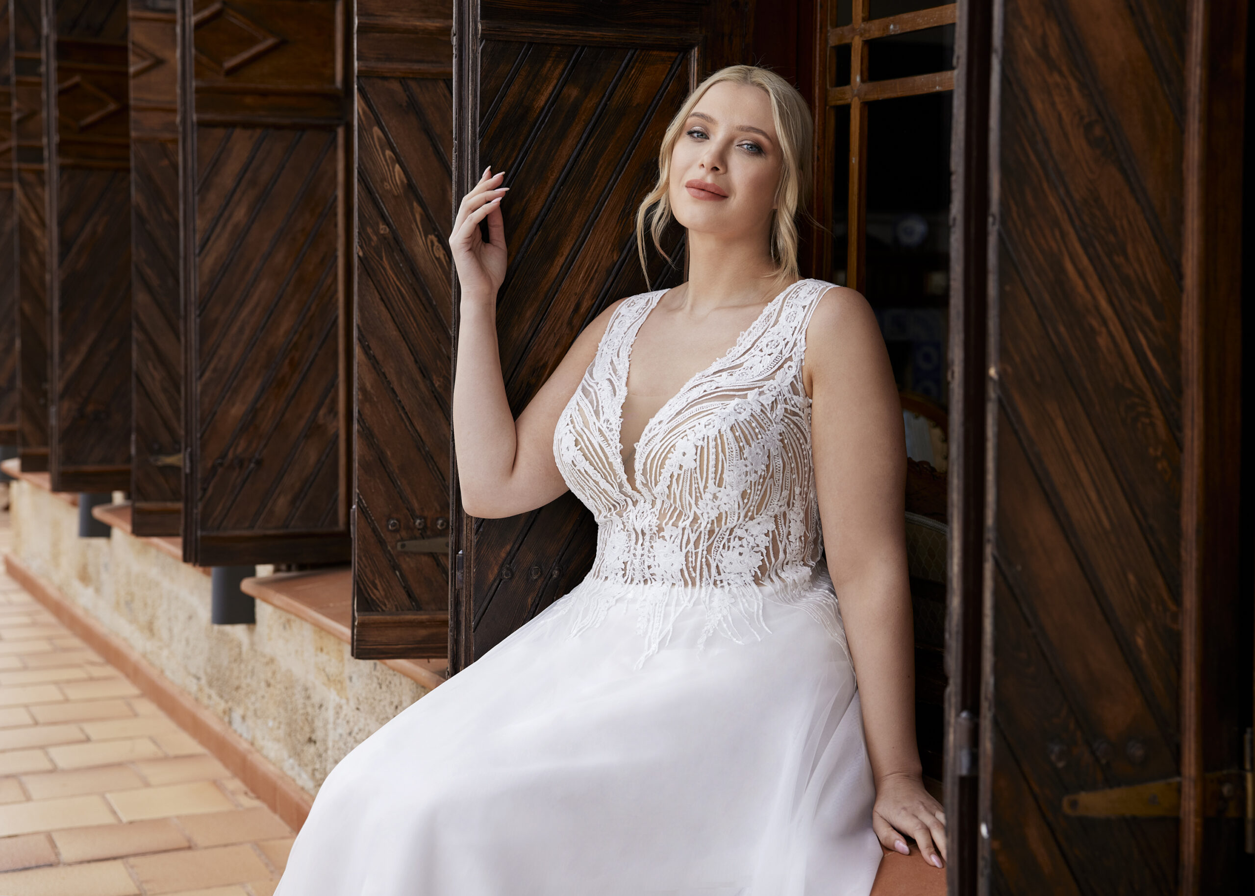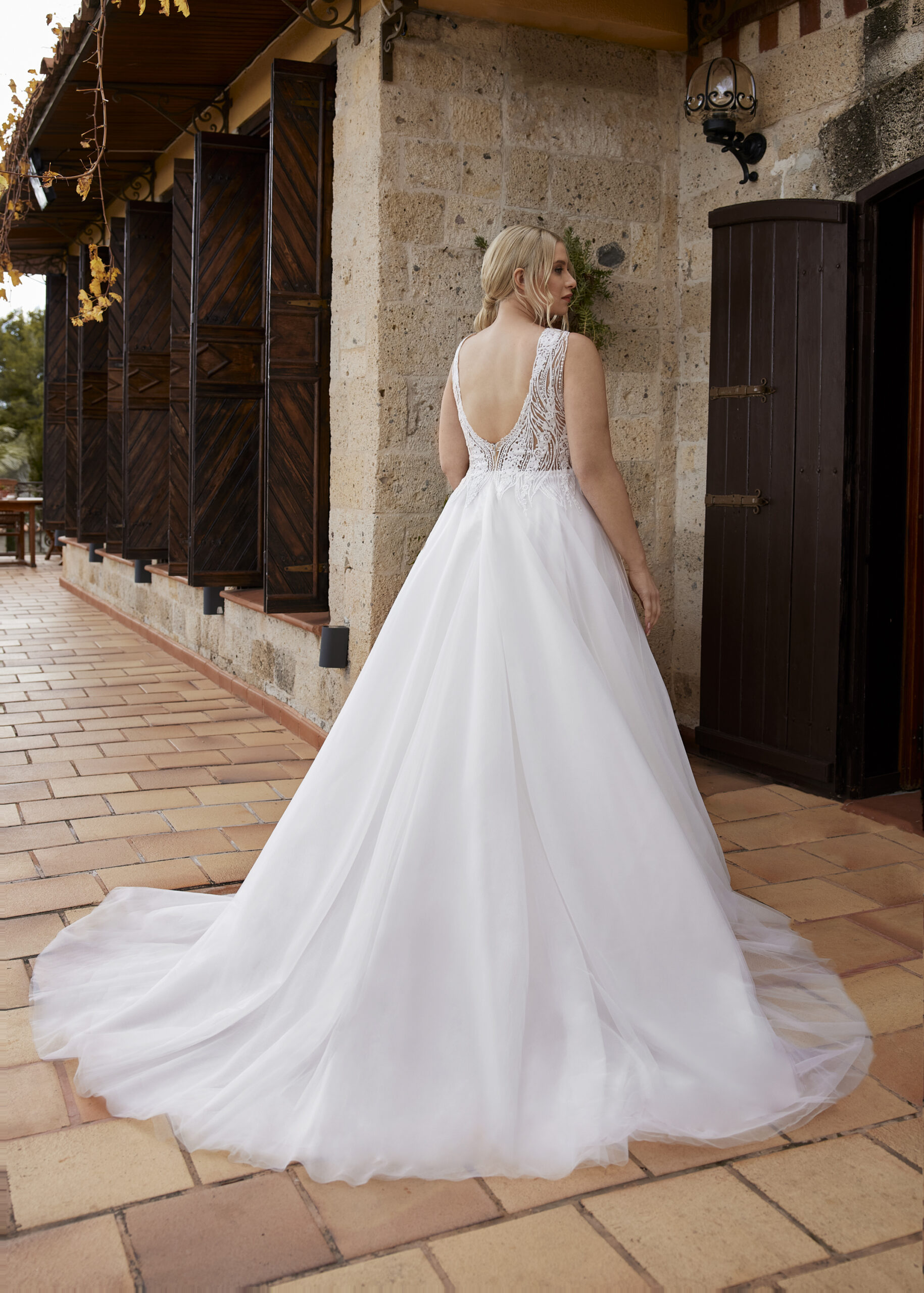 Das Brautkleid Holly Curve von Randy Fenoli besitzt ein mit Spitze in modern-grafischem Muster besticktes, transparentes Oberteil. Während der tiefe V-Ausschnitt vorne von einer zarten Lage Netzstoff verhüllt ist, besitzt die Rückenpartie einen tiefen U-förmigen Ausschnitt. Zusätzlich bedeckt das Spitzenmuster in gezackter Form den Übergang in den lichtdurchlässigen, aber blickdichten Rockteil. Dessen mehrere Lagen Tüll sind wunderschön geschichtet und fließen zart zu Boden. Eine transparente Schleppe bildet den Abschluss. Übrigens: Das gleiche Modell gibt es auch in der schmalen Variante!