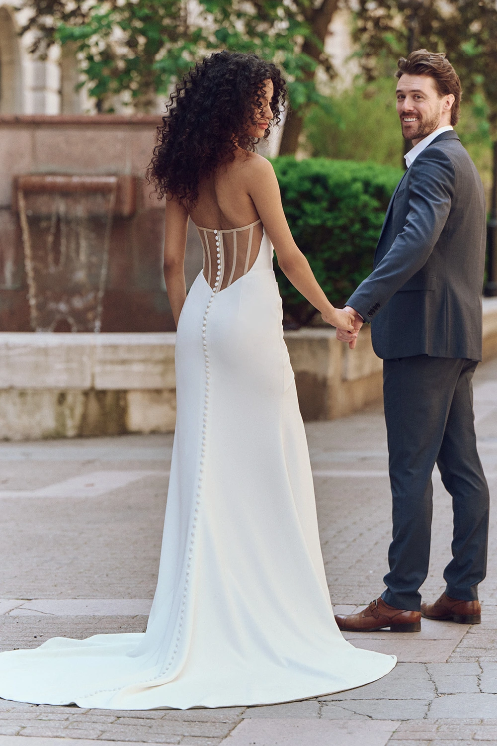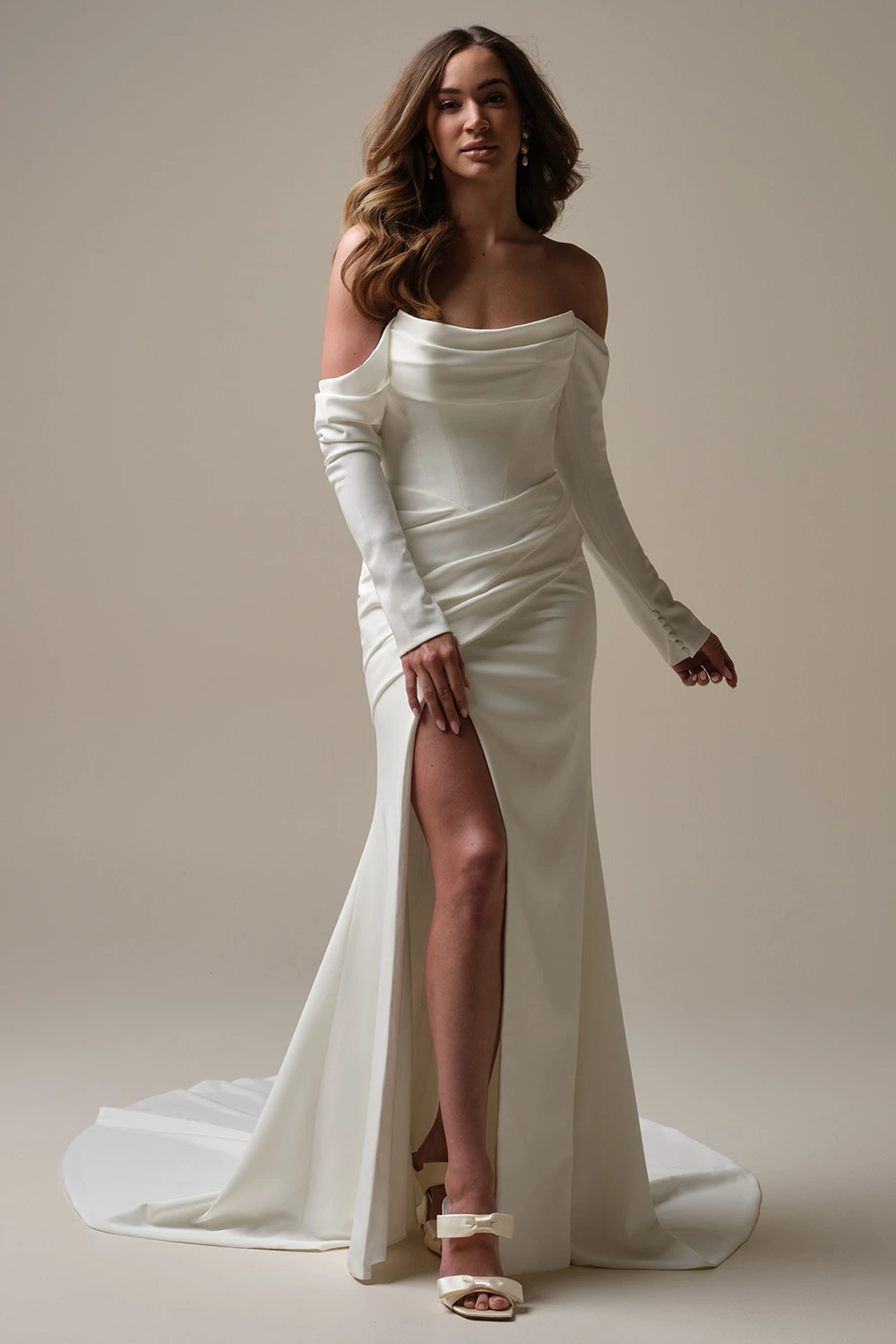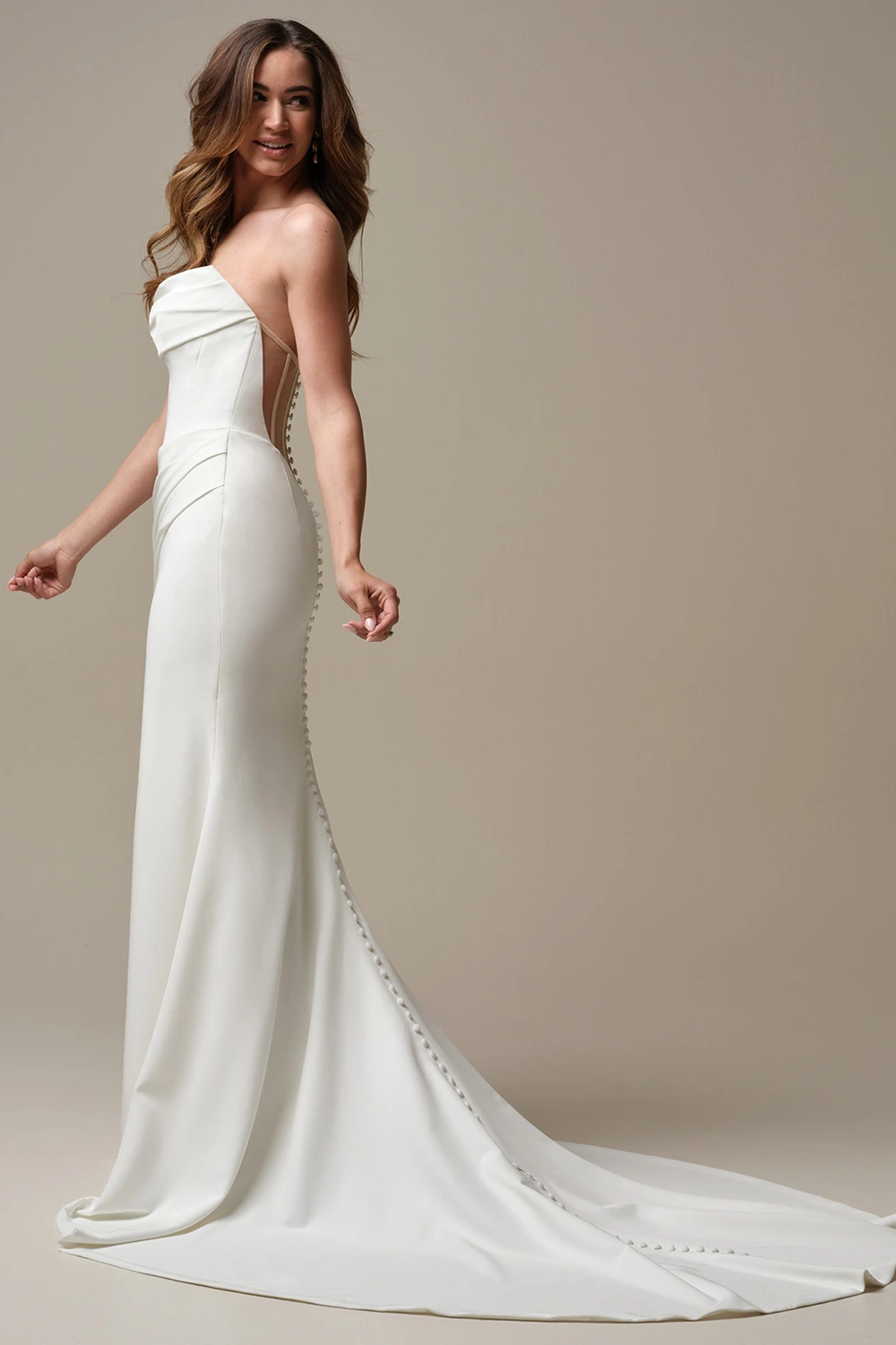 Das Brautkleid Kailani von Rebecca Ingram ist ein modernes Fit-and-Flare Brautkleid im Clean Chic mit abnehmbaren Ärmeln.