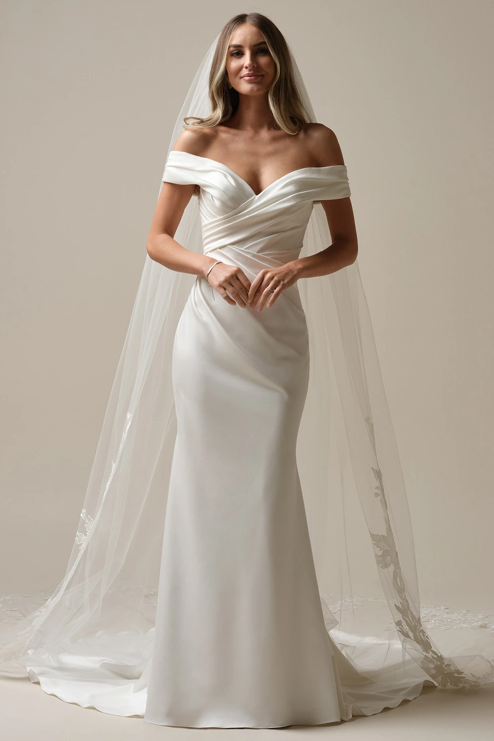 Das Brautkleid Latoya von Rebecca Ingram ist ein modisches Fit-and-Flare Brautkleid, dass den Fokus auf deine Schultern legt.