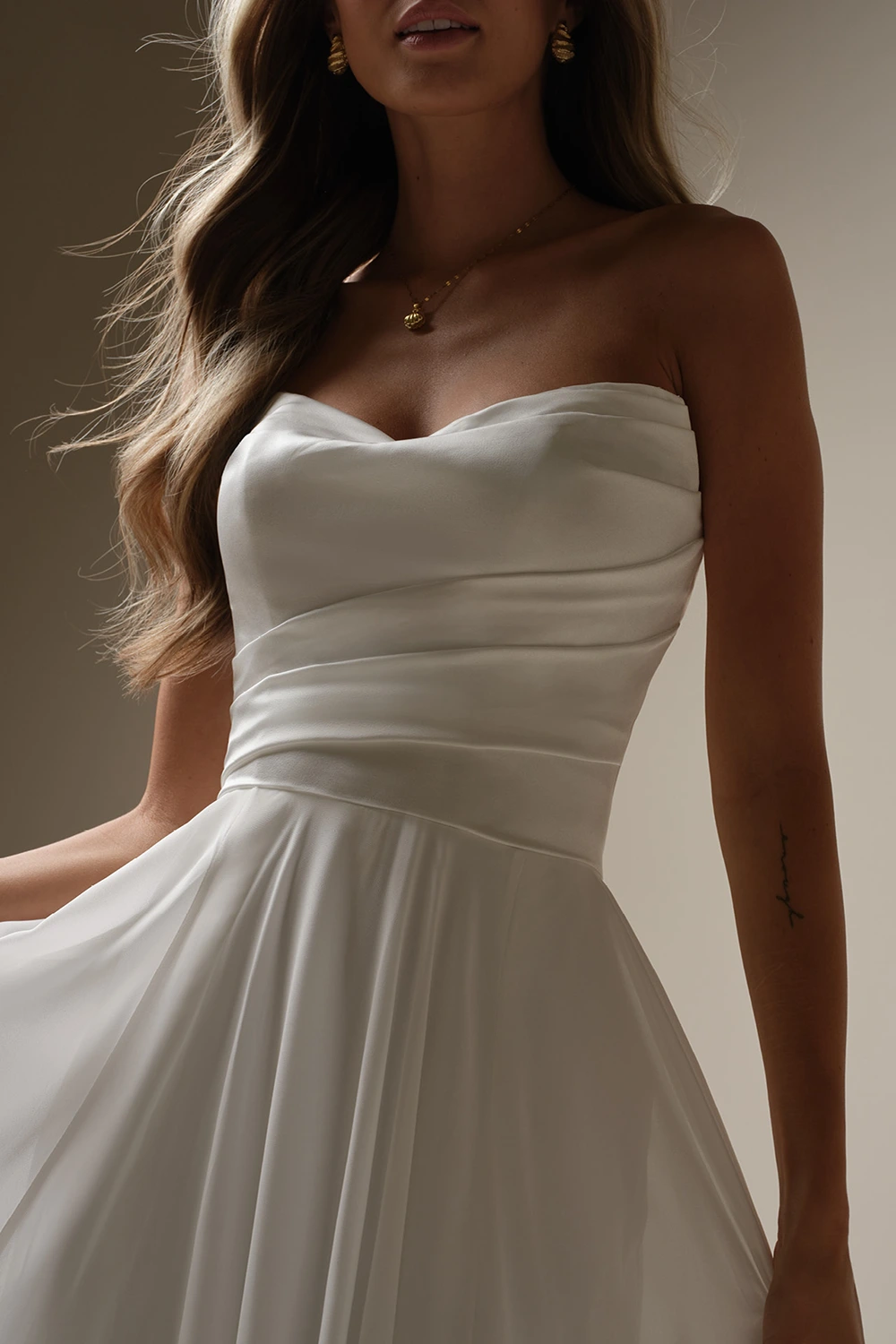 Das Brautkleid Melody von Rebecca Ingram ist ein leichtes A-Linien Brautkleid mit drapierten Faltenwurf.