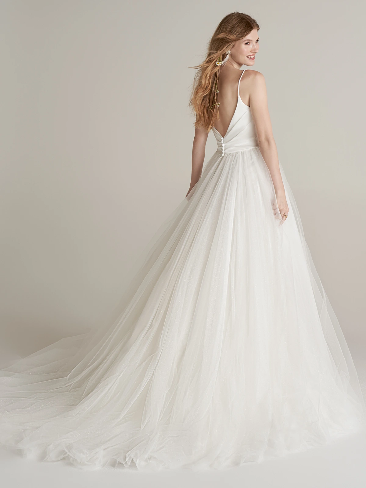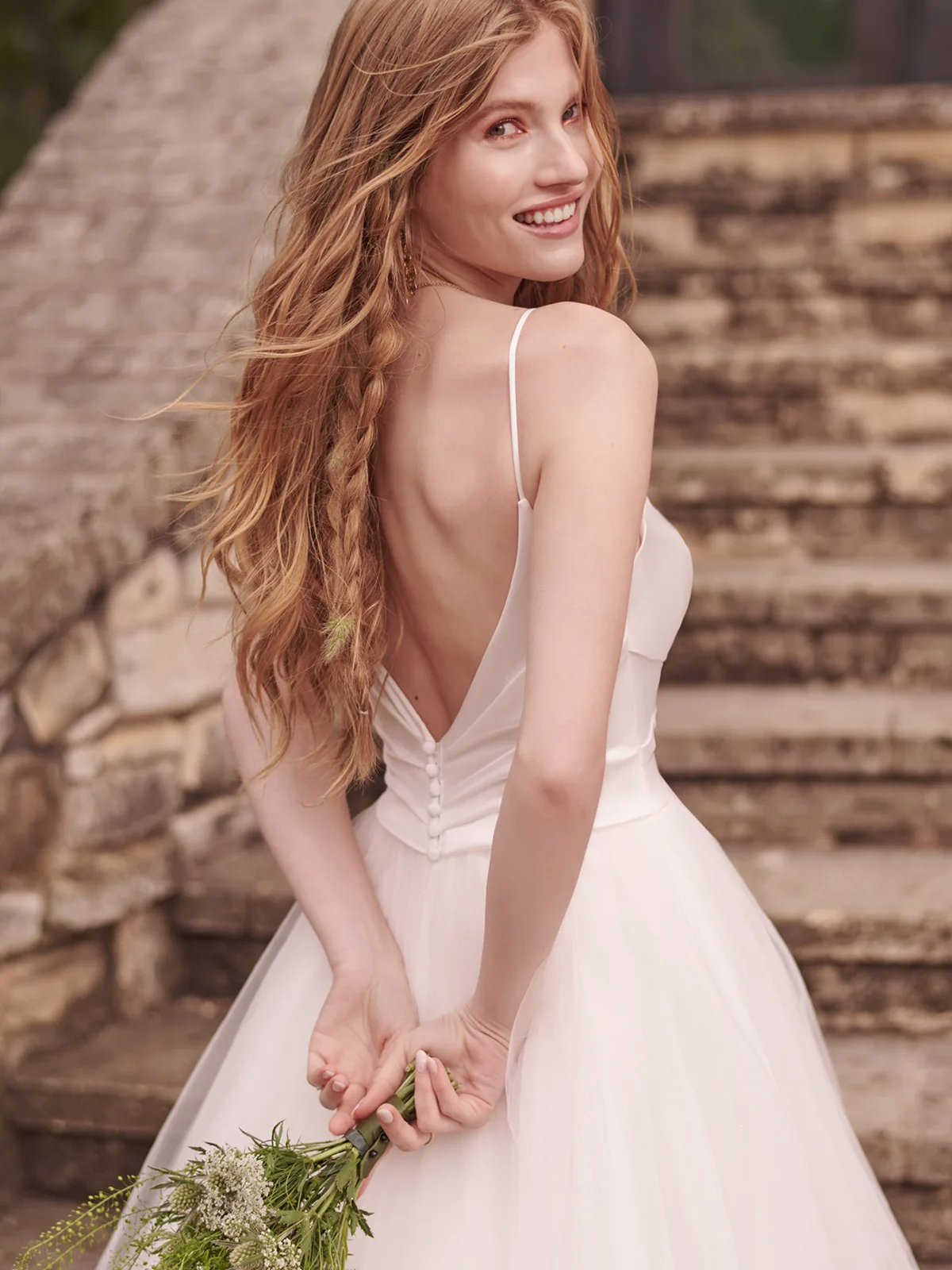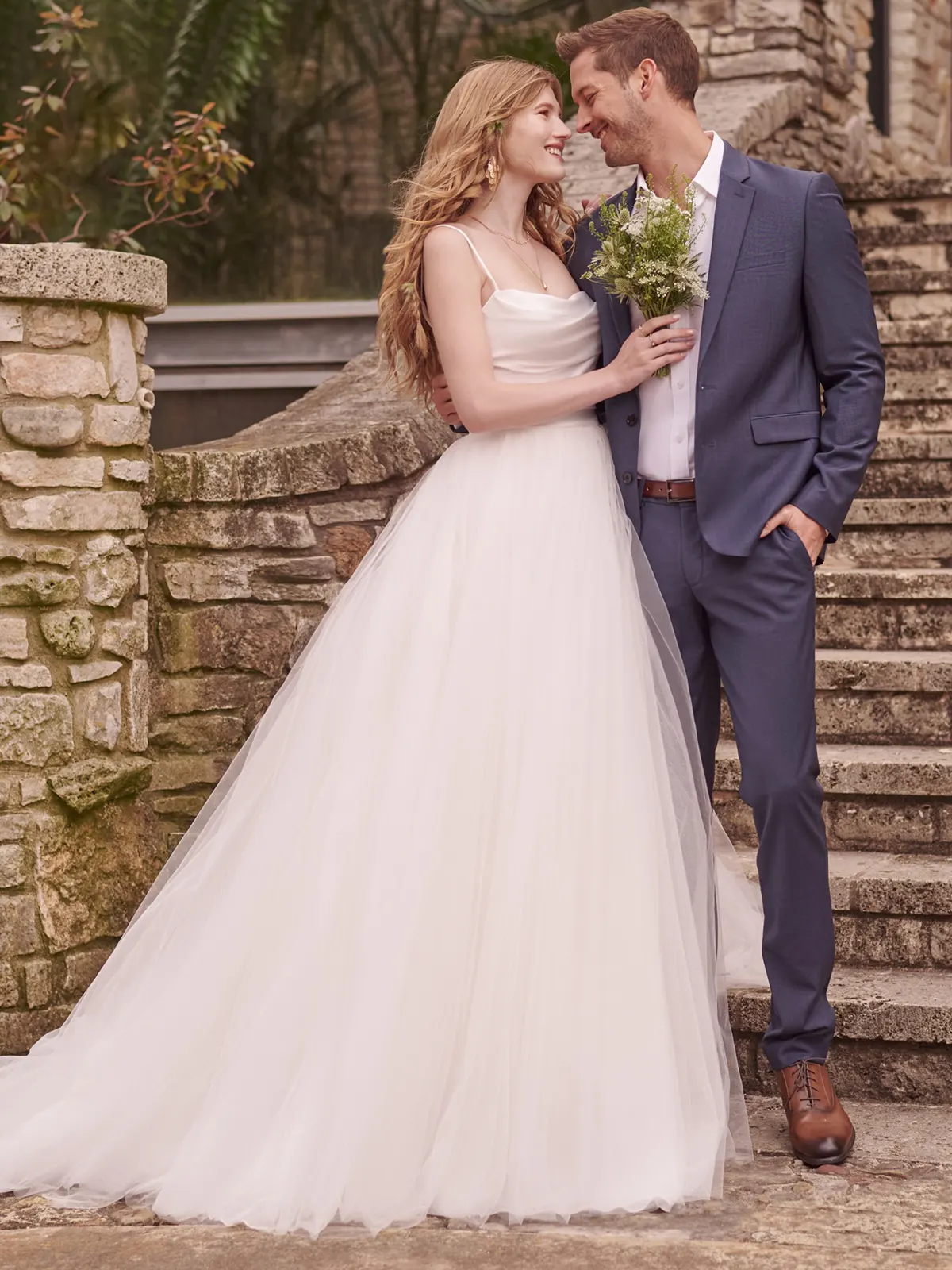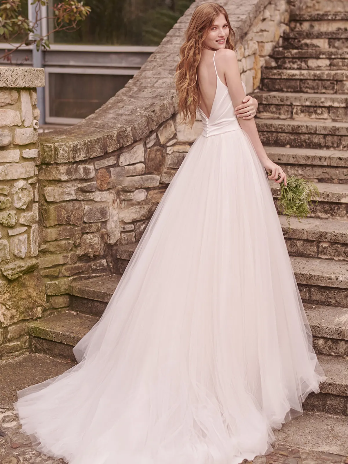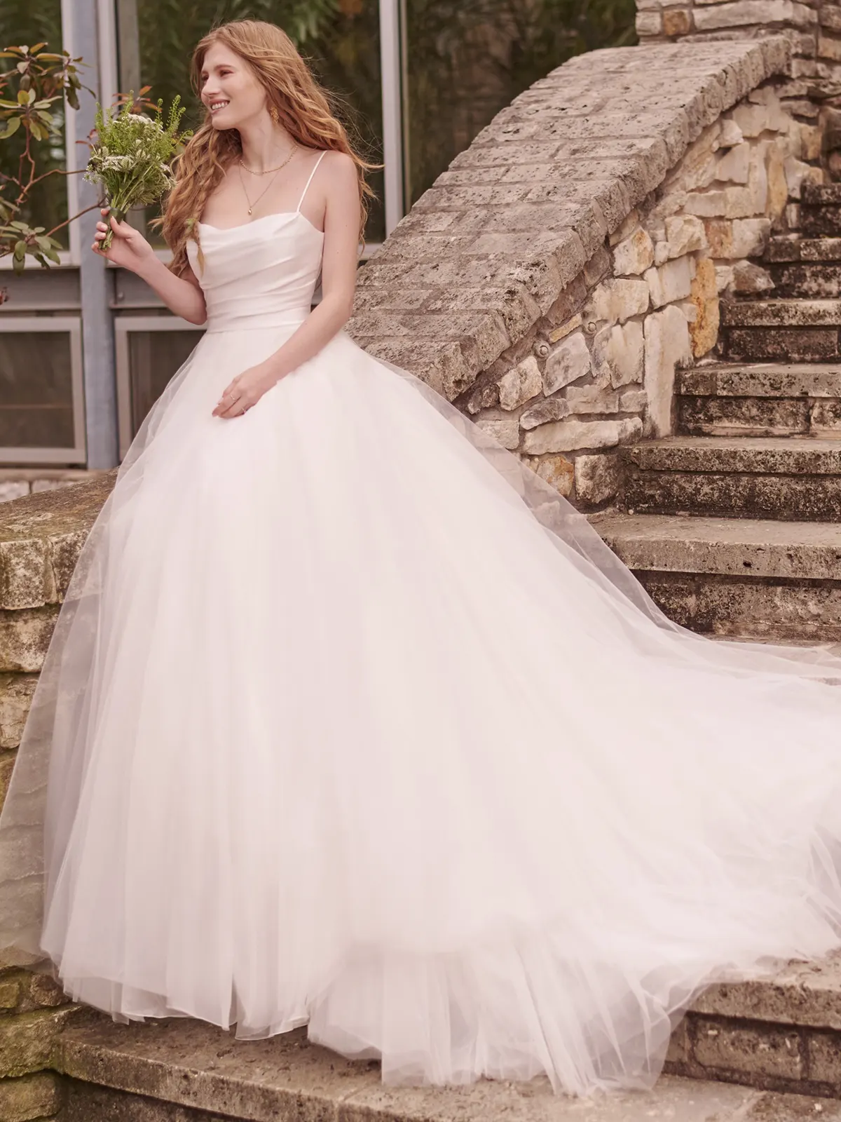 Mit dem Brautkleid Vivien von Rebecca Ingram ist Dir ein moderner und glamouröser Auftritt sicher. Das Top vereint gleich zwei Trends für die Saison 2023: Satin und einen geraden Ausschnitt. Der Satin ist vorne und hinten leicht gerafft. Filigrane Spaghettiträger geben der Schulterlinie viel Raum. Unterhalb des Rückenausschnitts verdeckt zudem eine kurze Knopfleiste den praktischen Reißverschluss. Ab der Taille weitet sich der strahlend weiß gefütterte Rock aus mehreren Lagen Glitzertüll.