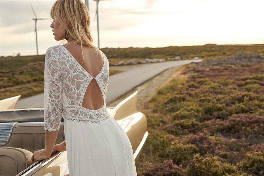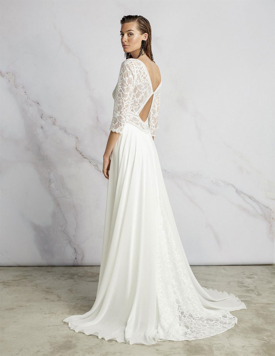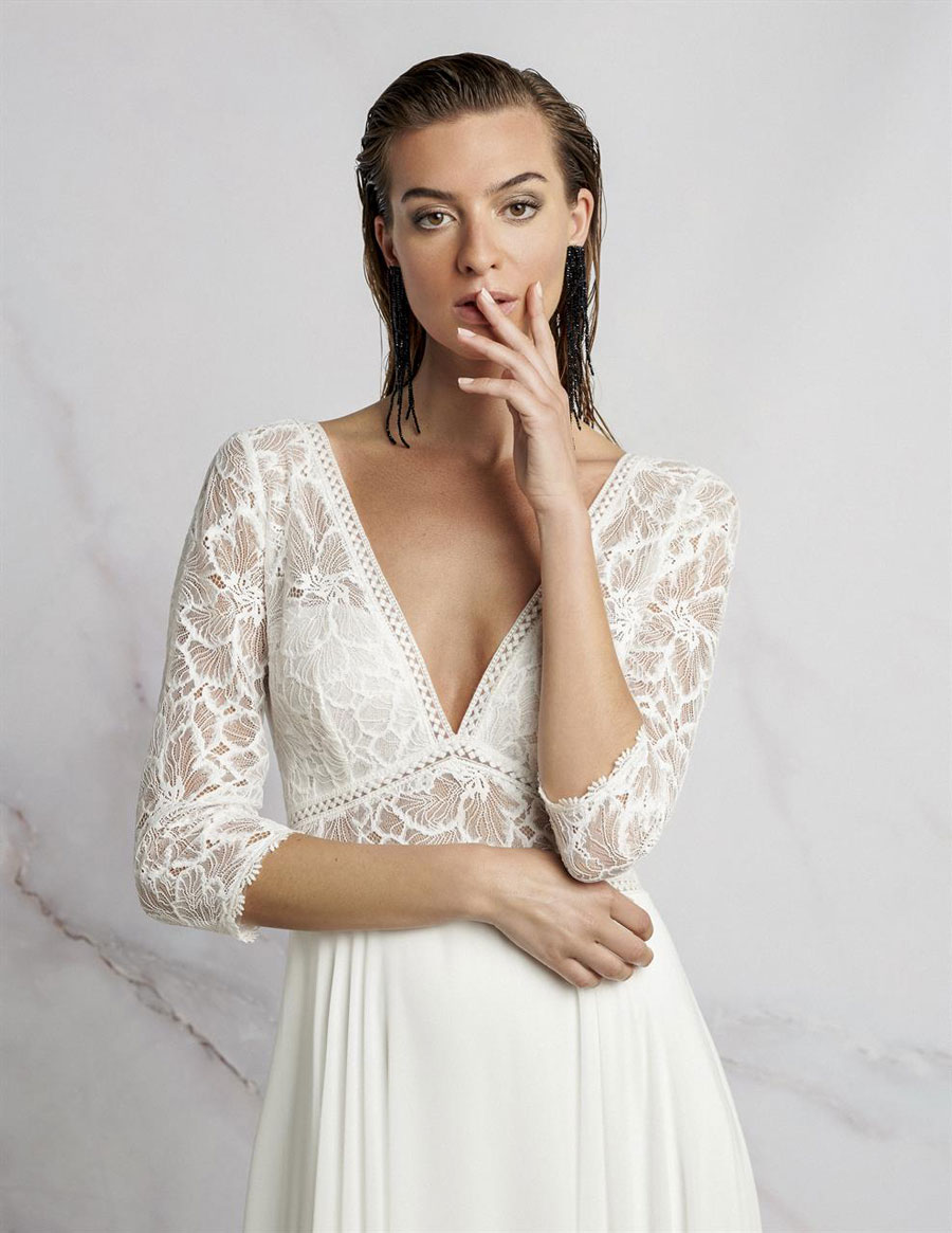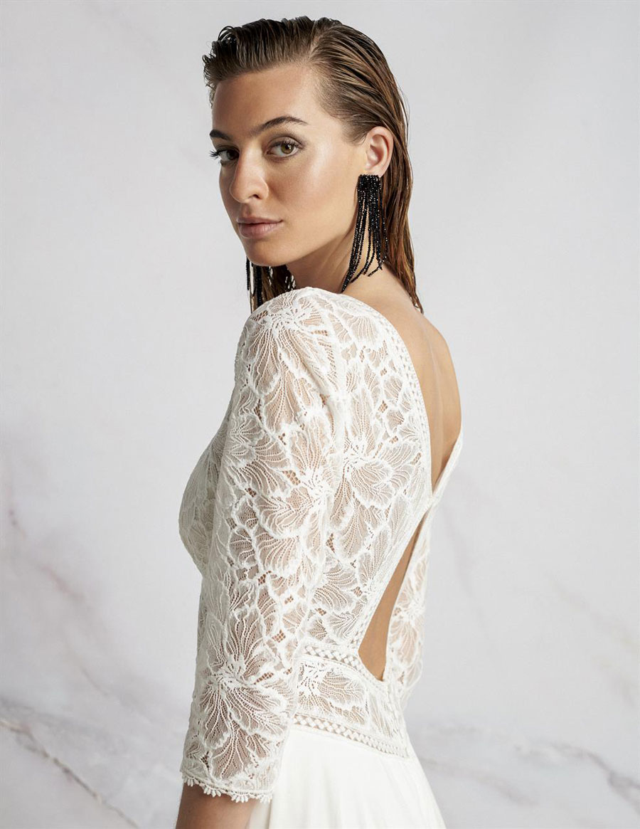 Transparente, großformatige Spitze ist das präsenteste Element des Brautkleids Maya von Rembo Styling. Sein Boho-Blütenmuster formt das gesamte Oberteil mitsamt ¾-Ärmeln. Zierborten fügen eine grafische Struktur hinzu und rahmen die Ausschnitte. Der Rückenausschnitt ist, wie für Rembo Styling typisch, geknöpft und dadurch zweigeteilt. Darunter fließt ein Chiffonrock zart zu Boden und endet dort in einer kleinen Schleppe, die das Spitzenmuster des Oberteils aufgreift.