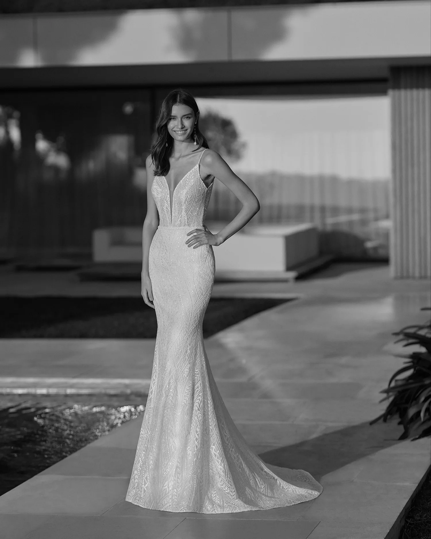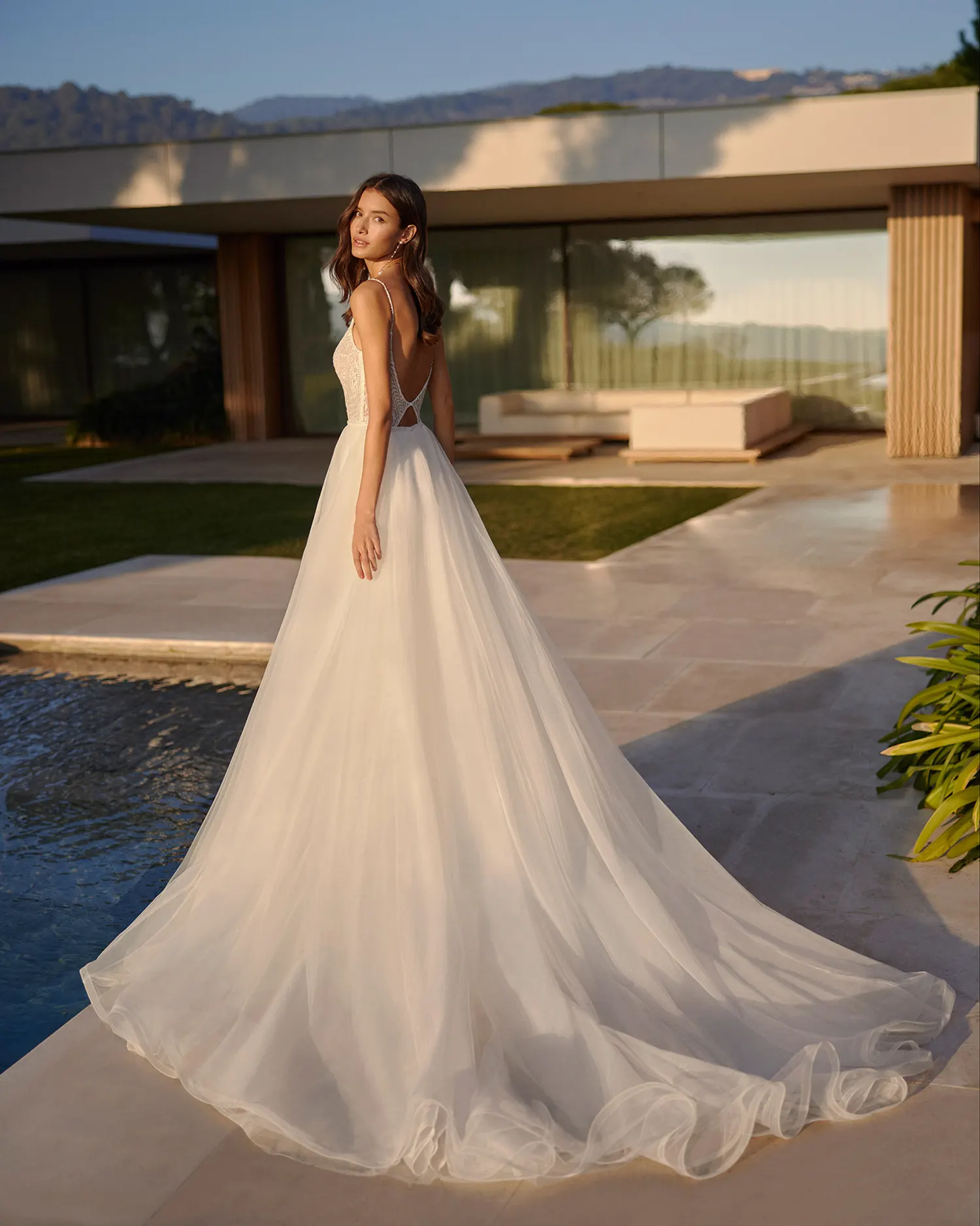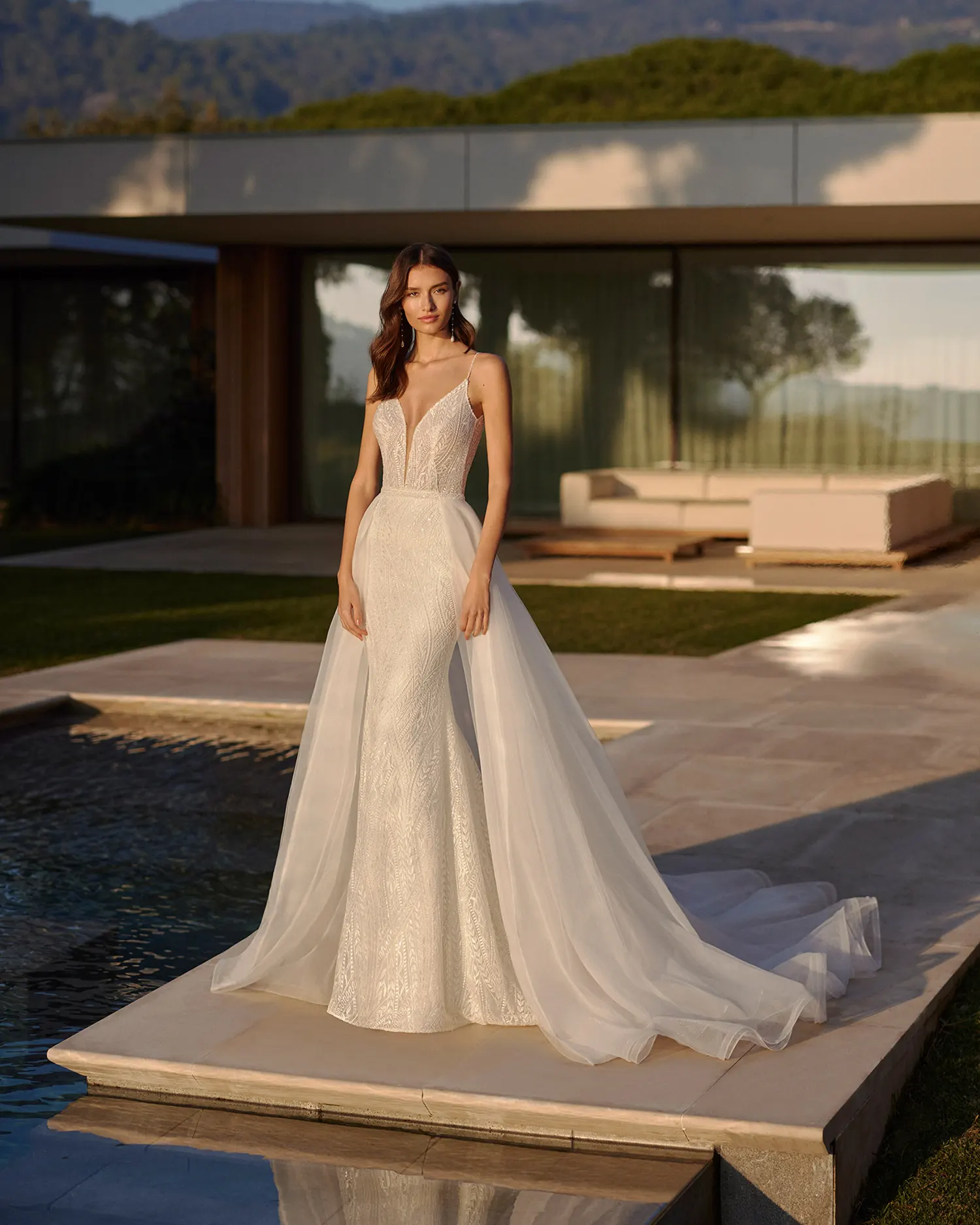 Das Brautkleid Isasi von Rosa Clará ist eine moderne Kombination zweier Entwürfe. Das schmale, vollständig mit grafischer Spitze aus glänzendem Garn Kleid besitzt eine betont schmale Silhouette. Pailletten lassen das Muster glitzern. Die filigranen Träger gehen über in einen tiefen Rückenausschnitt mit kleinem Keyhole-Detail. Ein Überrock aus Tüll kann hinzugefügt werden, der die Silhouette zu einer voluminösen A-Linie transformiert. Der Rock ergießt sich in eine weite Schleppe, die durch eine Crinolborte am Saum lebendig aufgeworfen ist.