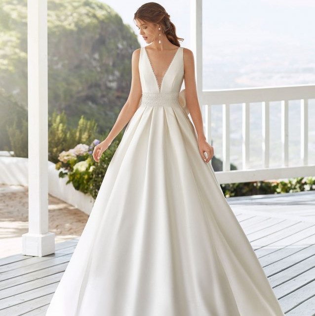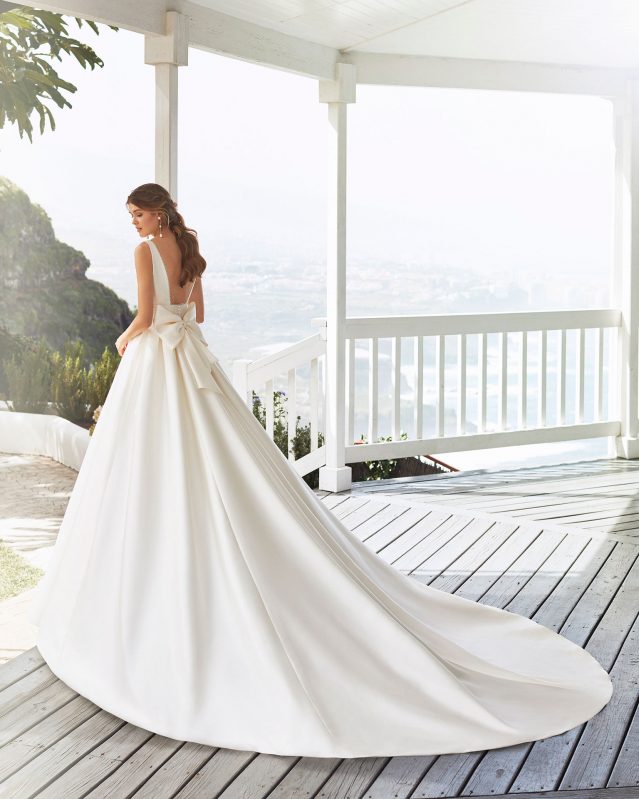 Das Brautkleid Cabak von Rosa Clará verströmt schlichten Glamour. Das aus weichem Sienna-Stoff gearbeitete Kleid offenbart seinen Charme besonders bei der Rückansicht: Auf einen tiefen Rückenausschnitt folgt ein breiter, strassbesetzter Taillengürtel aus Spitze mit einer elegant gearbeiteten Schleife auf der Rückseite. Ein in Kellerfalten gelegter Rock mit einer langen Schleppe aus verstärktem Sienna schließt sich an.