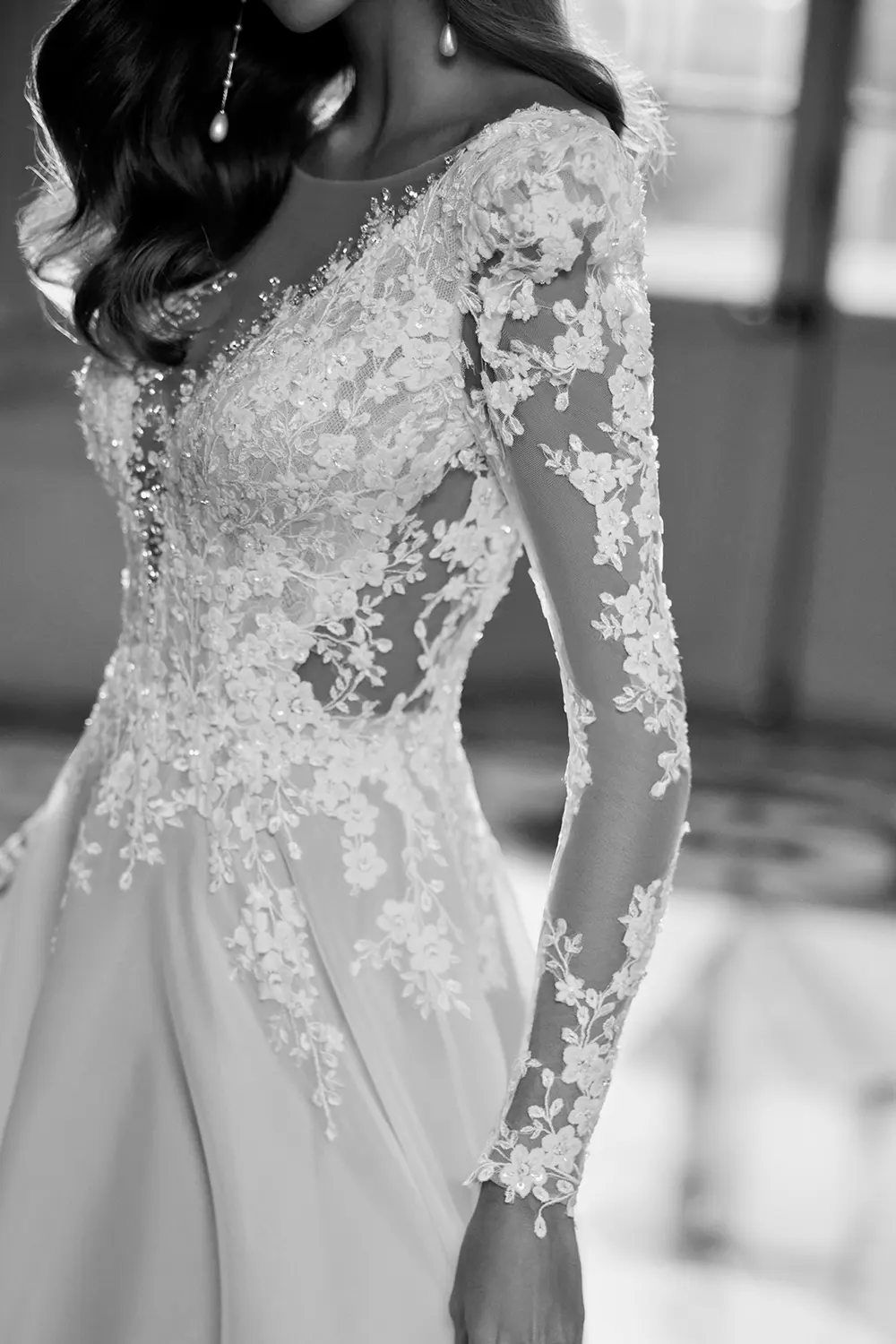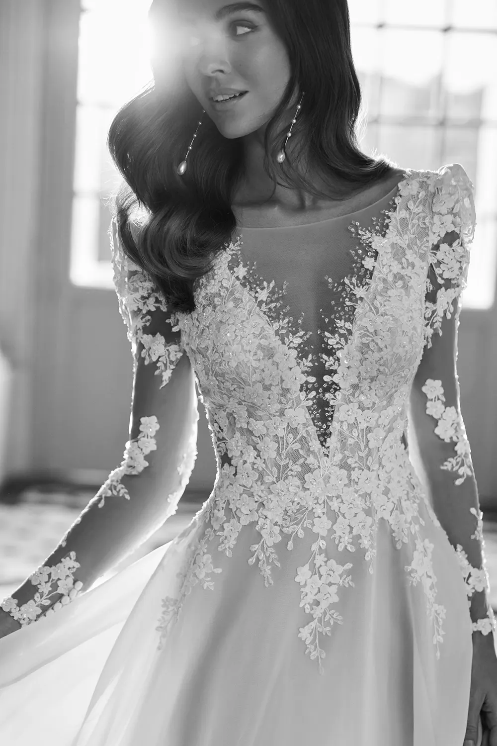 Das Brautkleid Ernest von Rosa Clará ist ein verspieltes A-Linien Brautkleid mit langen Puffärmeln und einem tiefen Ausschnitt.