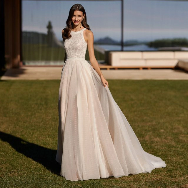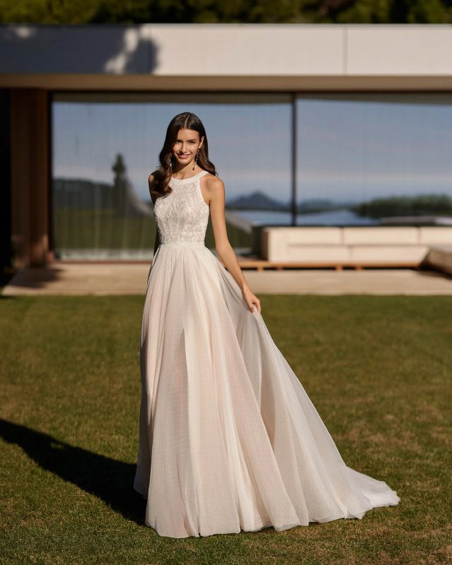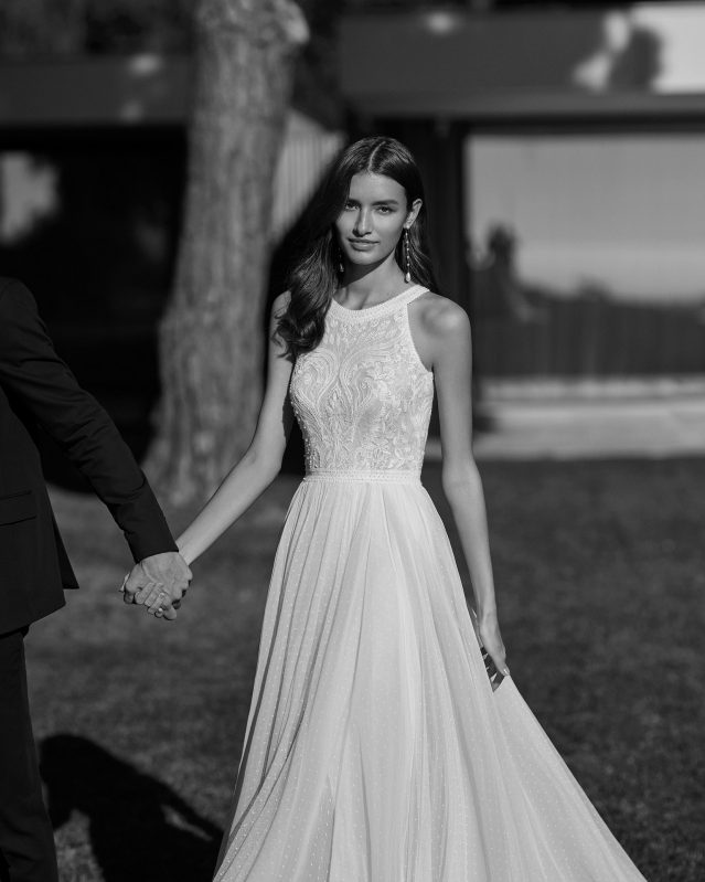 Ingmar von Rosa Clará ist ein Brautkleid mit Vintage-Charakter in modernem Schnitt. Während die Vorderseite hochgeschlossen ist, zeigt die Rückseite einen modernen, eckigen Ausschnitt. Symmetrische Vintage-Spitze bedeckt das Oberteil. Unter einem schmalen Taillenband wiegt sich der nudefarben gefütterte Rock aus Plumetistüll mit natürlichem Volumen im Wind.
