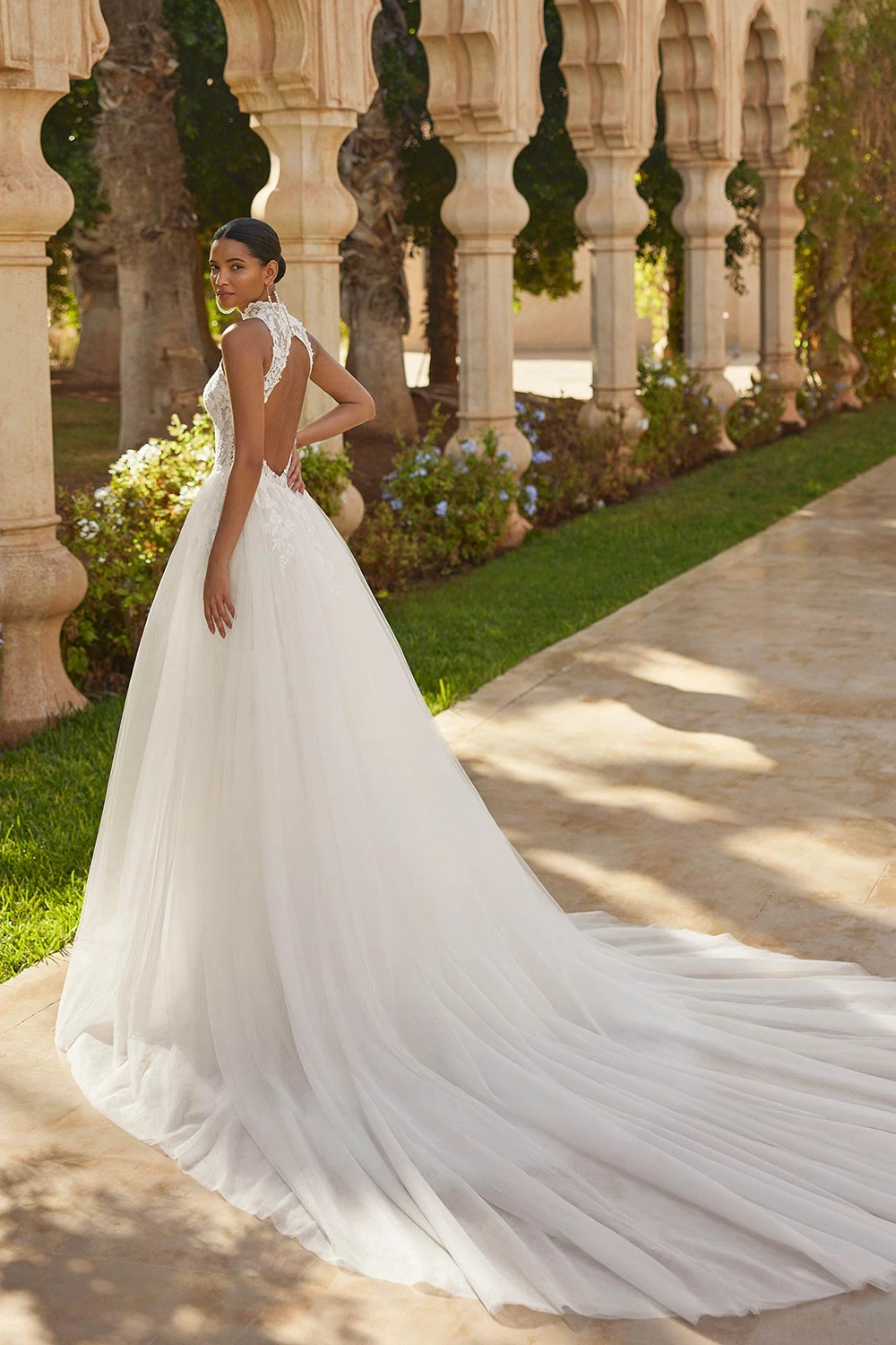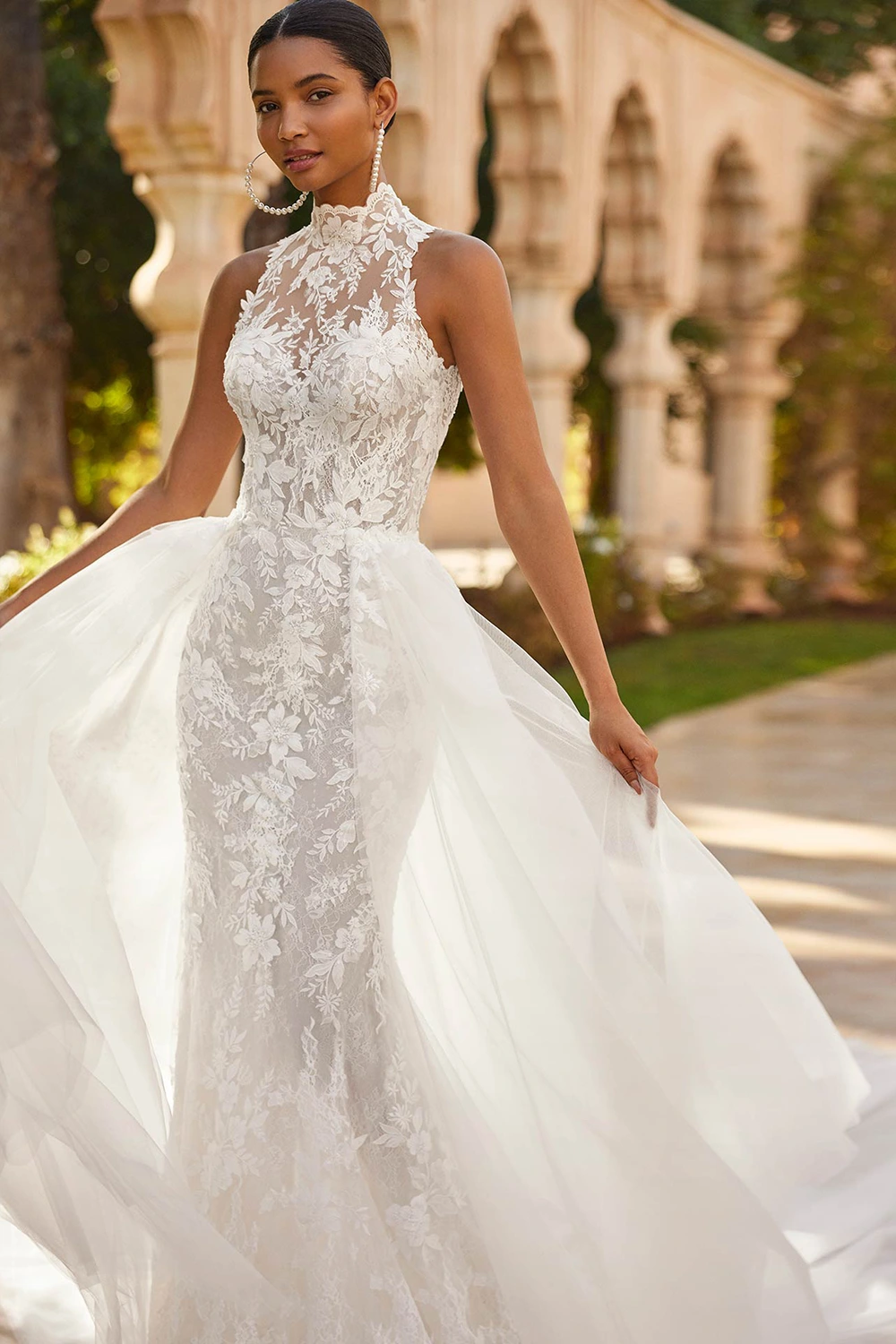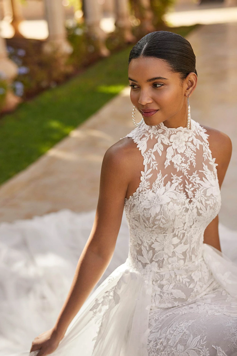 Das Modell Olite von Rosa Clara ist ein glamouröses Fit und Flare Brautkleid aus floraler Spitze und einem semitransparenten Oberteil mit Turtleneck .