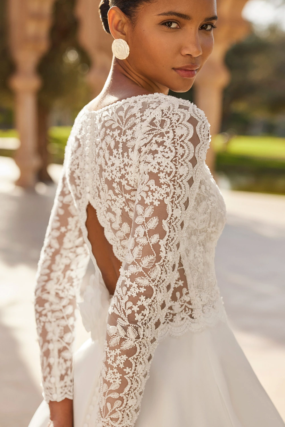Das Modell Onasis von Rosa Clara ist ein Brautkleid mit A-Linien-Schnitt mit langen Ärmeln aus Spitze.