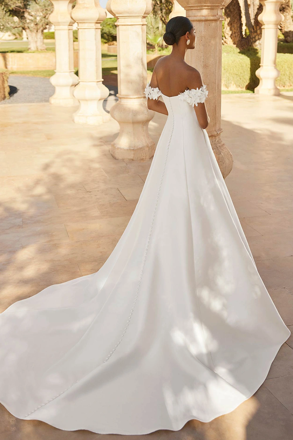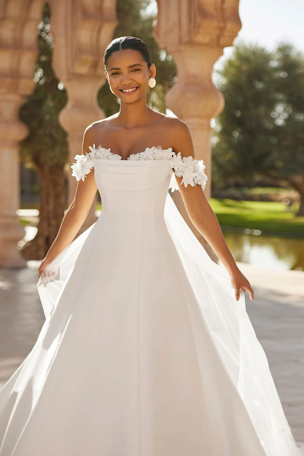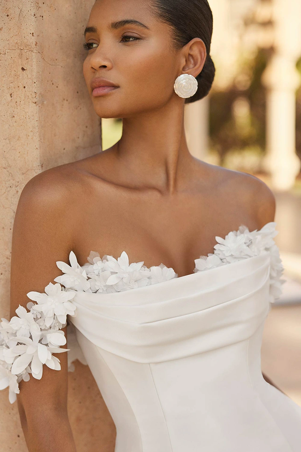 Das Modell Onelia von Rosa Clara ist ein cleanes Brautkleid mit floralen 3D-Applikationen vom Ausschnitt übergehend in den Carmenträger.