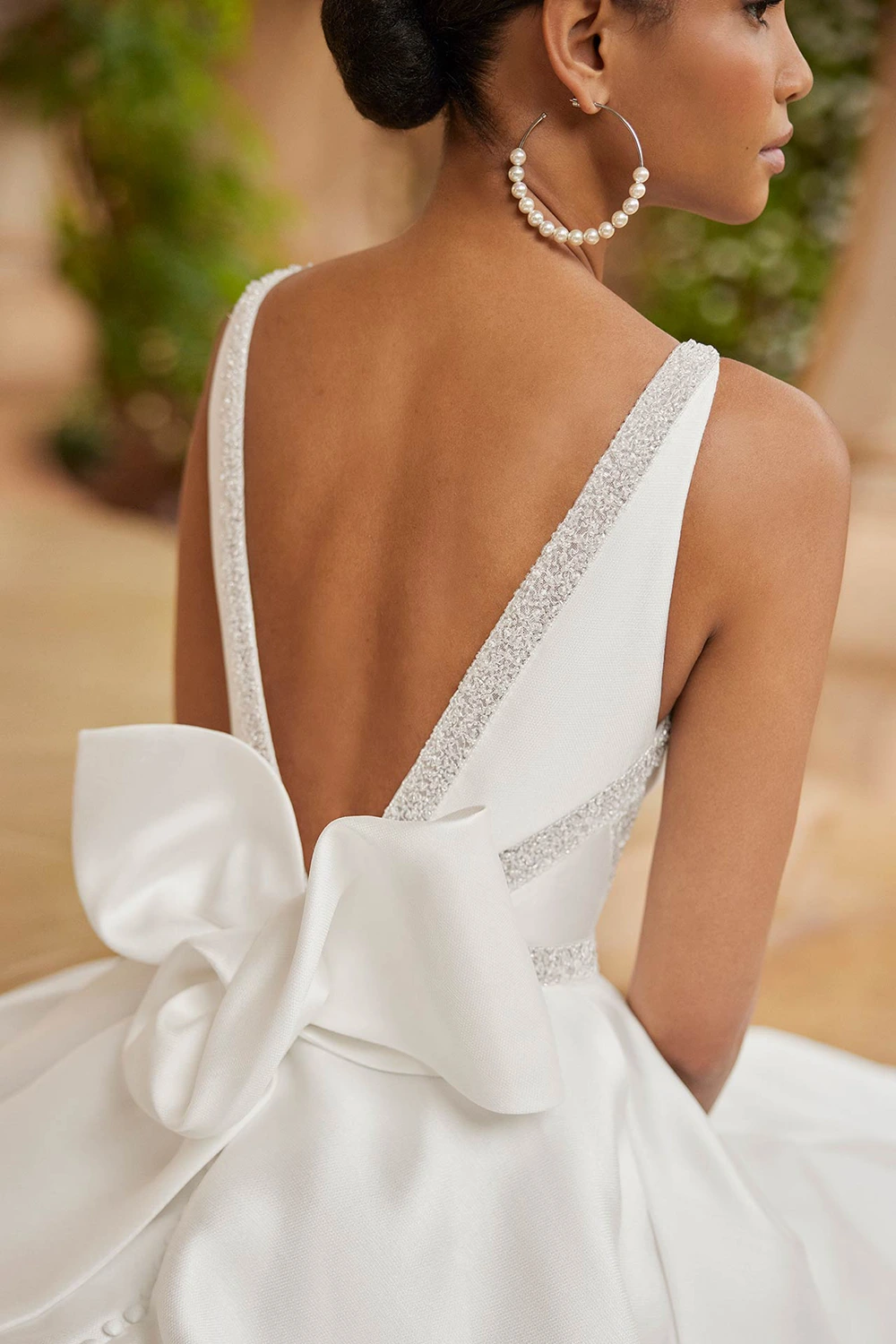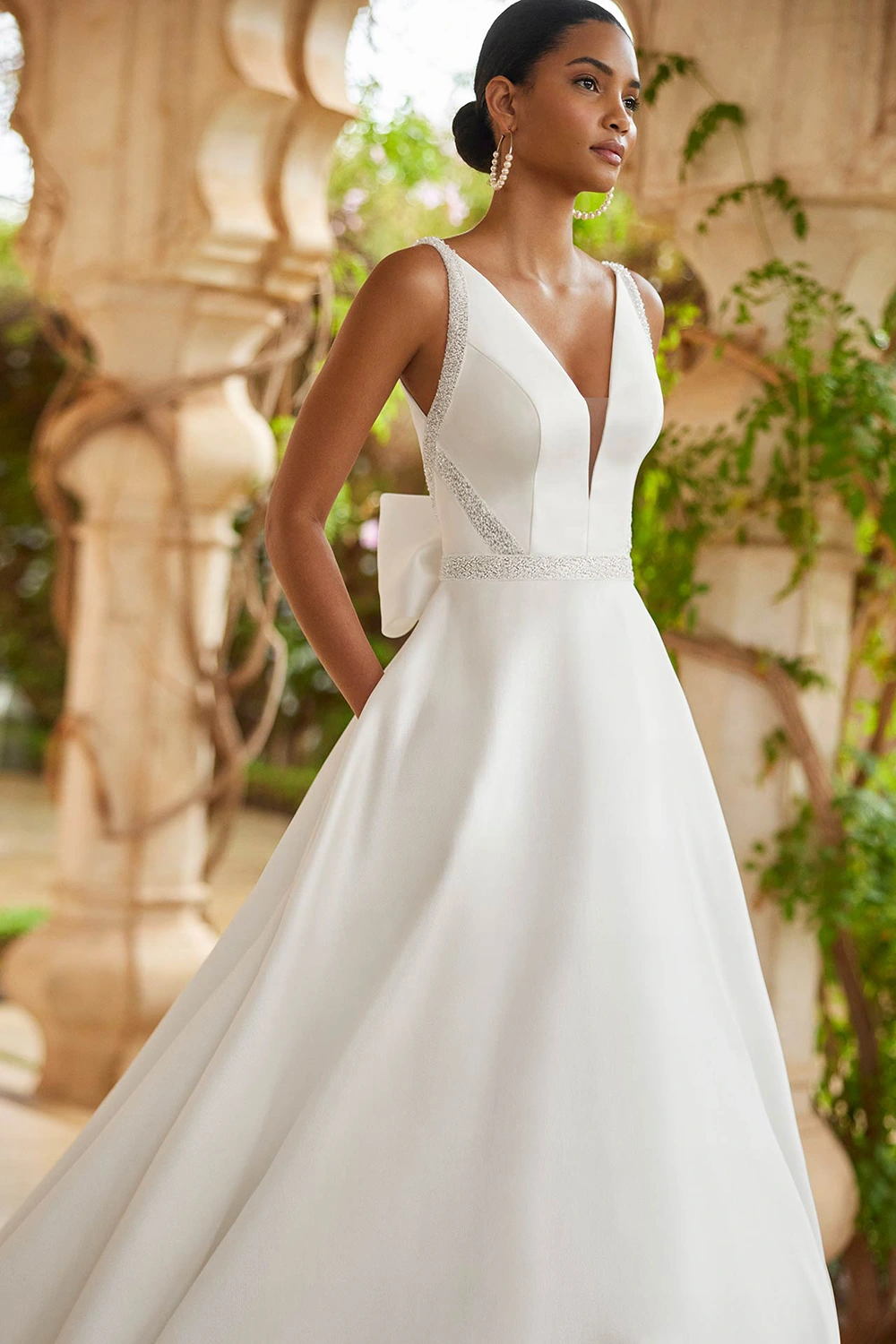 Das Modell Orfeo von Rosa Clara ist ein cleanes A-Linien Brautkleid mit tollen Highlights aus Glitzer an den Trägern und im Taillenbereich. Das Highlight ist eine Applikation im Rückenbereich.