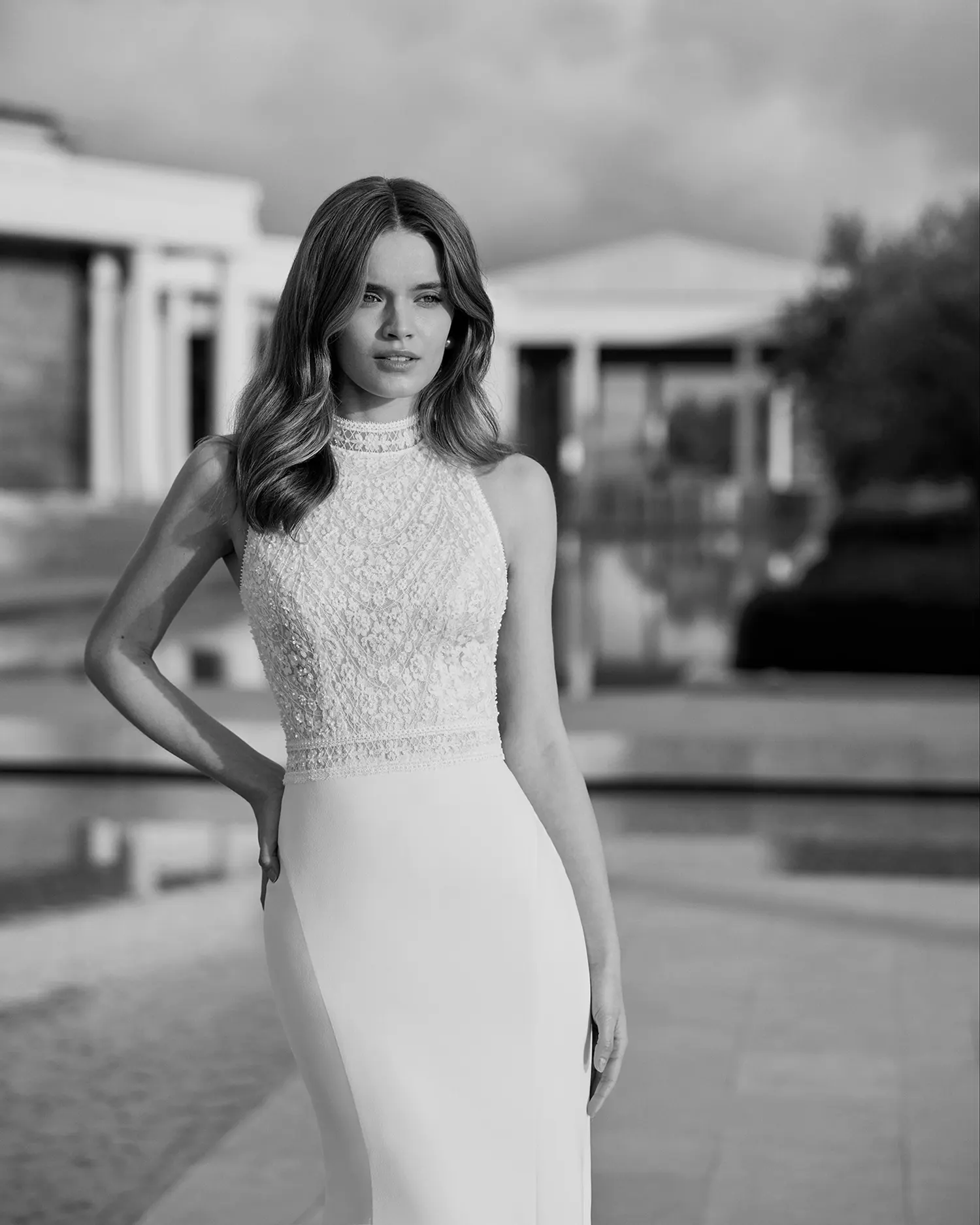Das Brautkleid Velia von Rosa Clará ist am Oberteil mit perlenbestickter Vintage-Spitze bedeckt, die an der transparenten Rückseite den großen, geknöpften Keyhole-Ausschnitt rahmt. Unter einem Taillenband fließt der geschmeidige Crêpe-Rock zu Boden und ergießt sich in eine glatte, ovale Schleppe.
