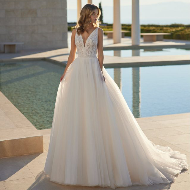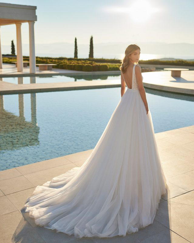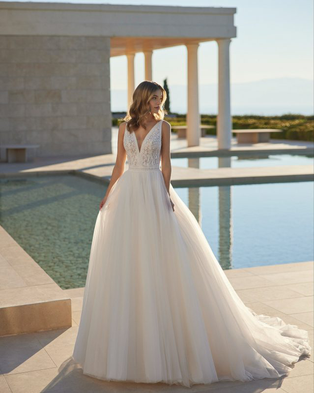 Vidya on Rosa Clará ist ein schlichtes und doch bezauberndes Brautkleid mit klassischer Silhouette. Das semitransparent gearbeitete Oberteil ist mit floraler, geschichteter Spitze bedeckt, die zusätzlich von Perlen verziert ist. Seitenschlitze und ein eckiger Rückenausschnitt verleihen dem Modell moderne Elemente. Unter einem schmalen Taillenband weitet sich der mehrlagige Tüllrock, ehe er in einer weitläufigen Schleppe endet.