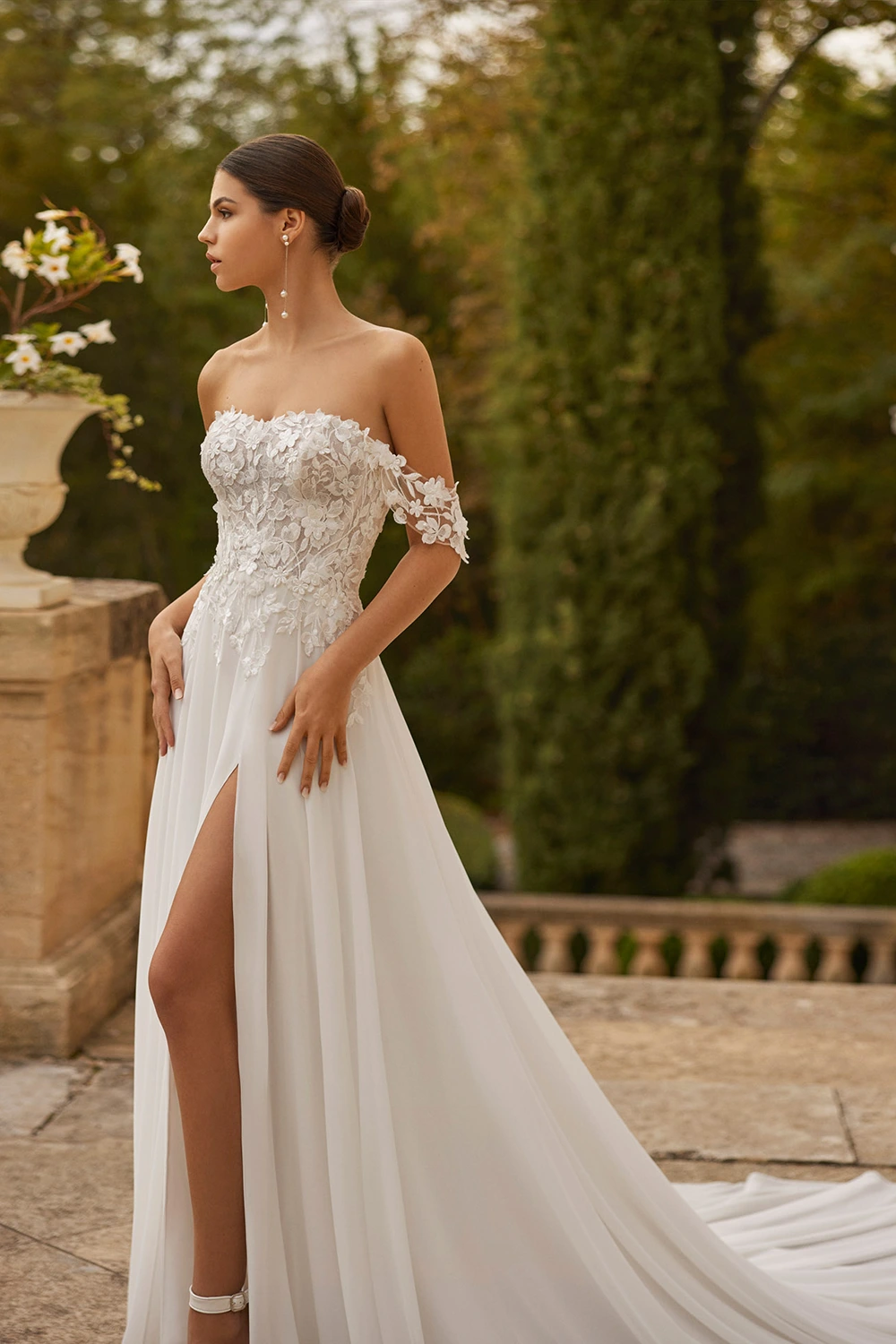 Das Modell Volney von Rosa Clara ist ein fließendes A-Linien Brautkleid mit optionaler Jacke.