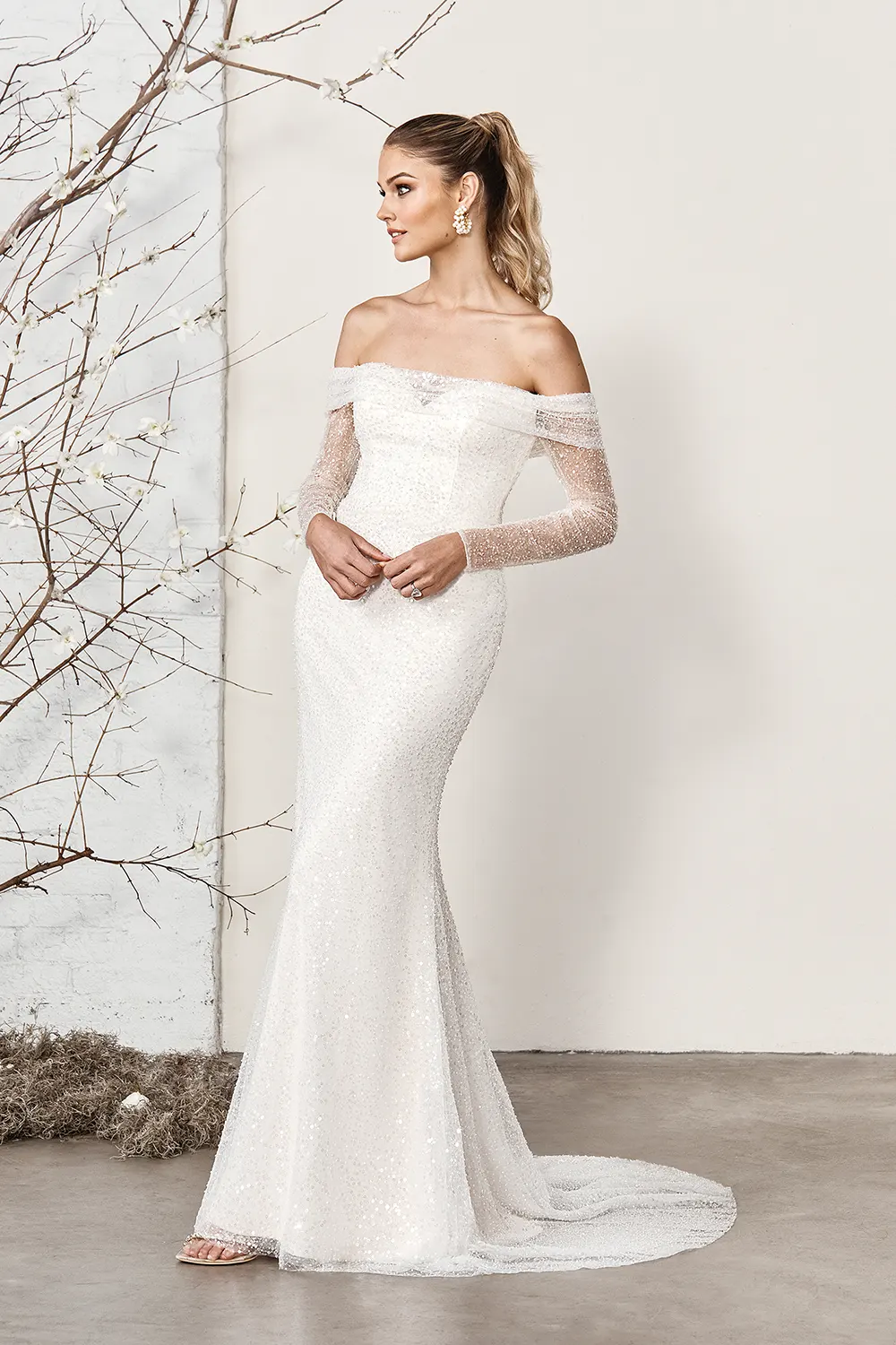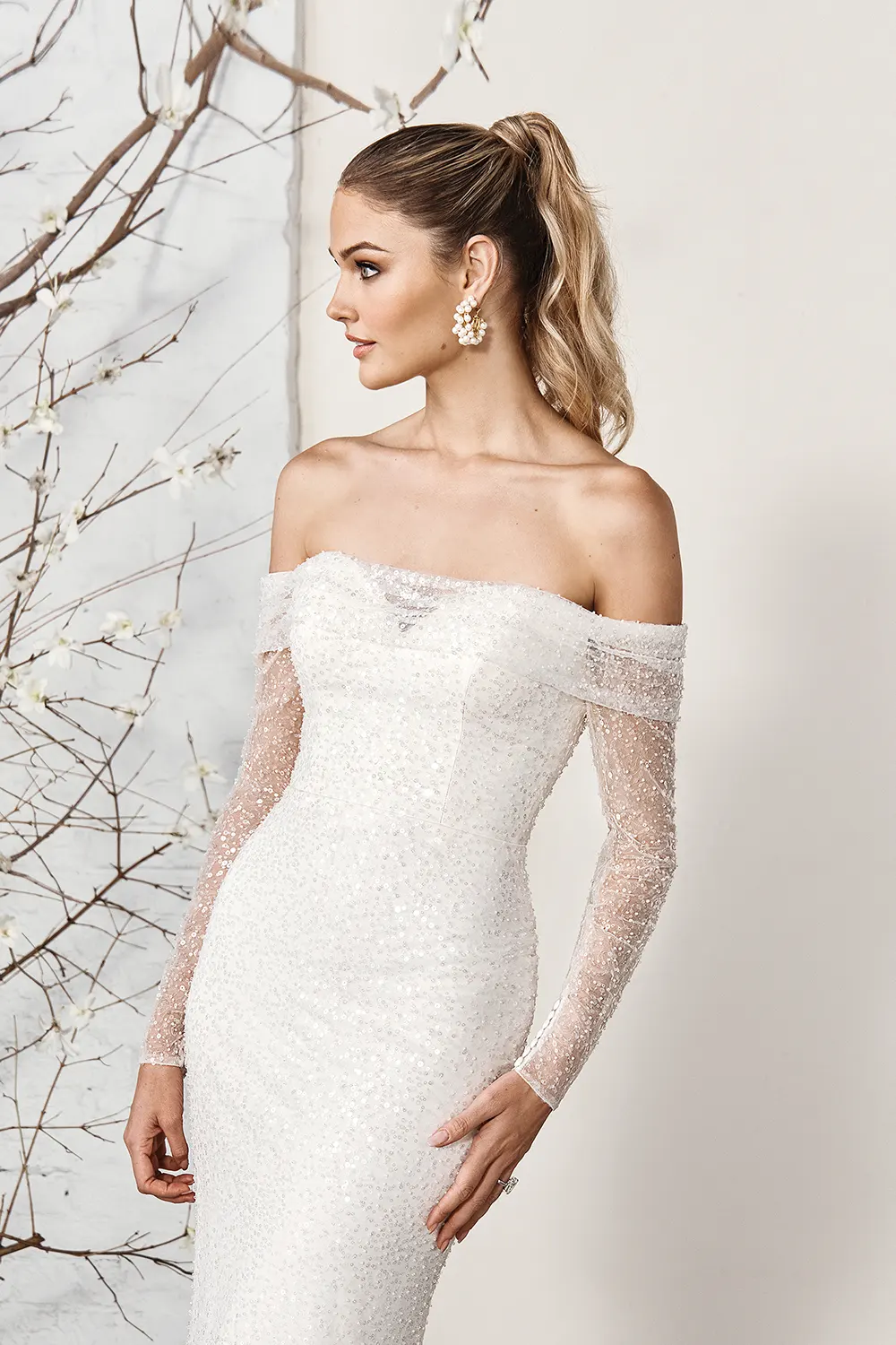 Das Brautkleid 44399 von Sincerity Bridal ist ein anmutiges Meerjungfrauen Brautkleid mit romantischem, schulterfreiem Ausschnitt und langen Ärmeln.
