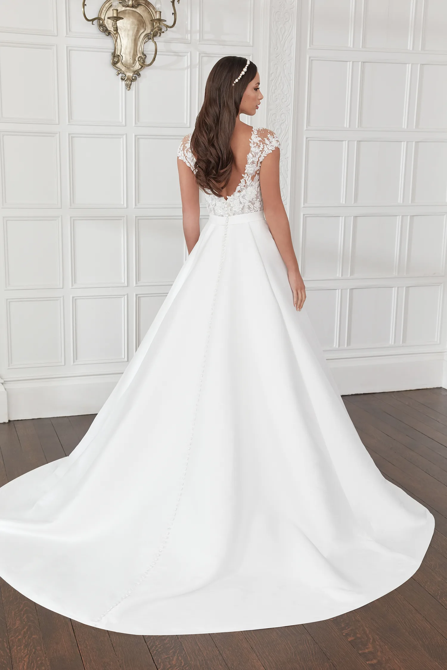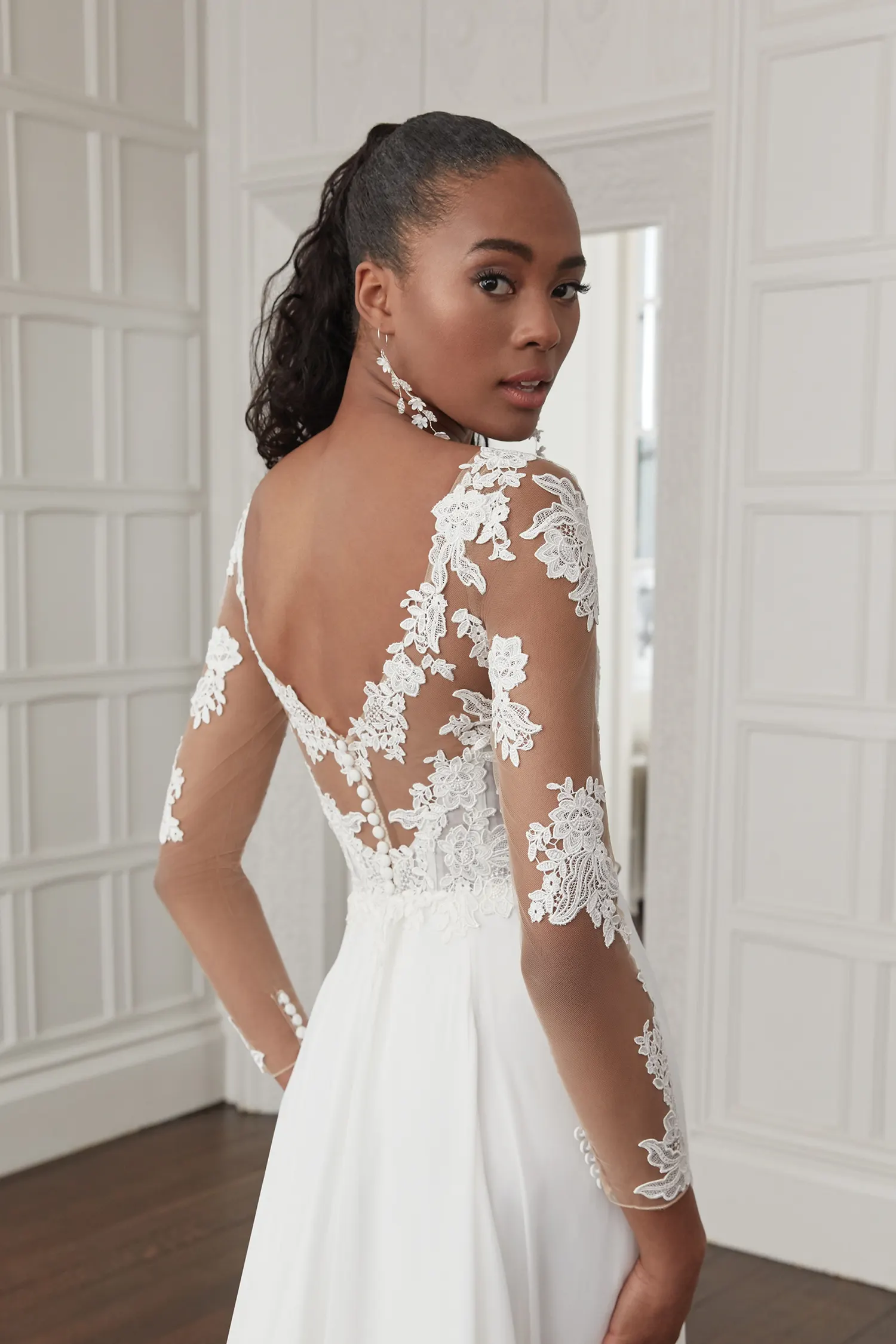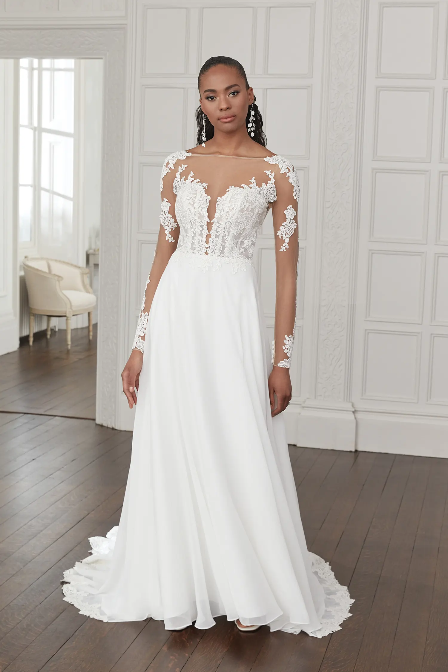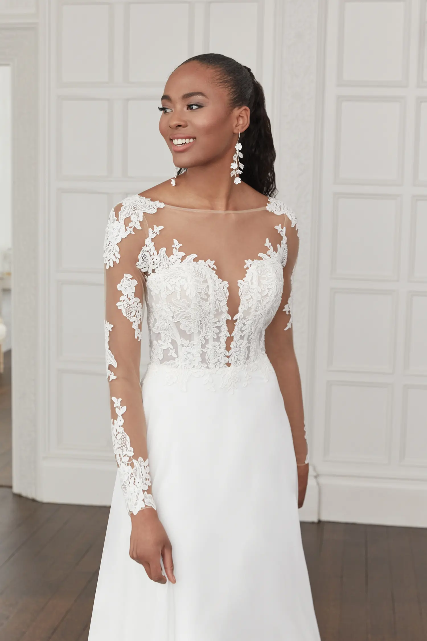 Das klassische Brautkleid 44353 von Sincerity ist am Oberteil mit romantisch-floraler Spitze bedeckt. Das Muster kommt durch den transparenten Organza besonders an den langen Ärmeln zur Geltung. An den Ärmelbündchen sowie an der Rückseite befinden sich kurze Knopfleisten. Sichtbar eingearbeitete Stäbchen verleihen einen modernen Korsagen-Look. Ab der Taille fließt der vorne glatte, hinten in leichte Falten gelegte Chiffonrock zu Boden. Der spitzenbestickte Saum der Schleppe greift das florale Muster des Oberteils auf.