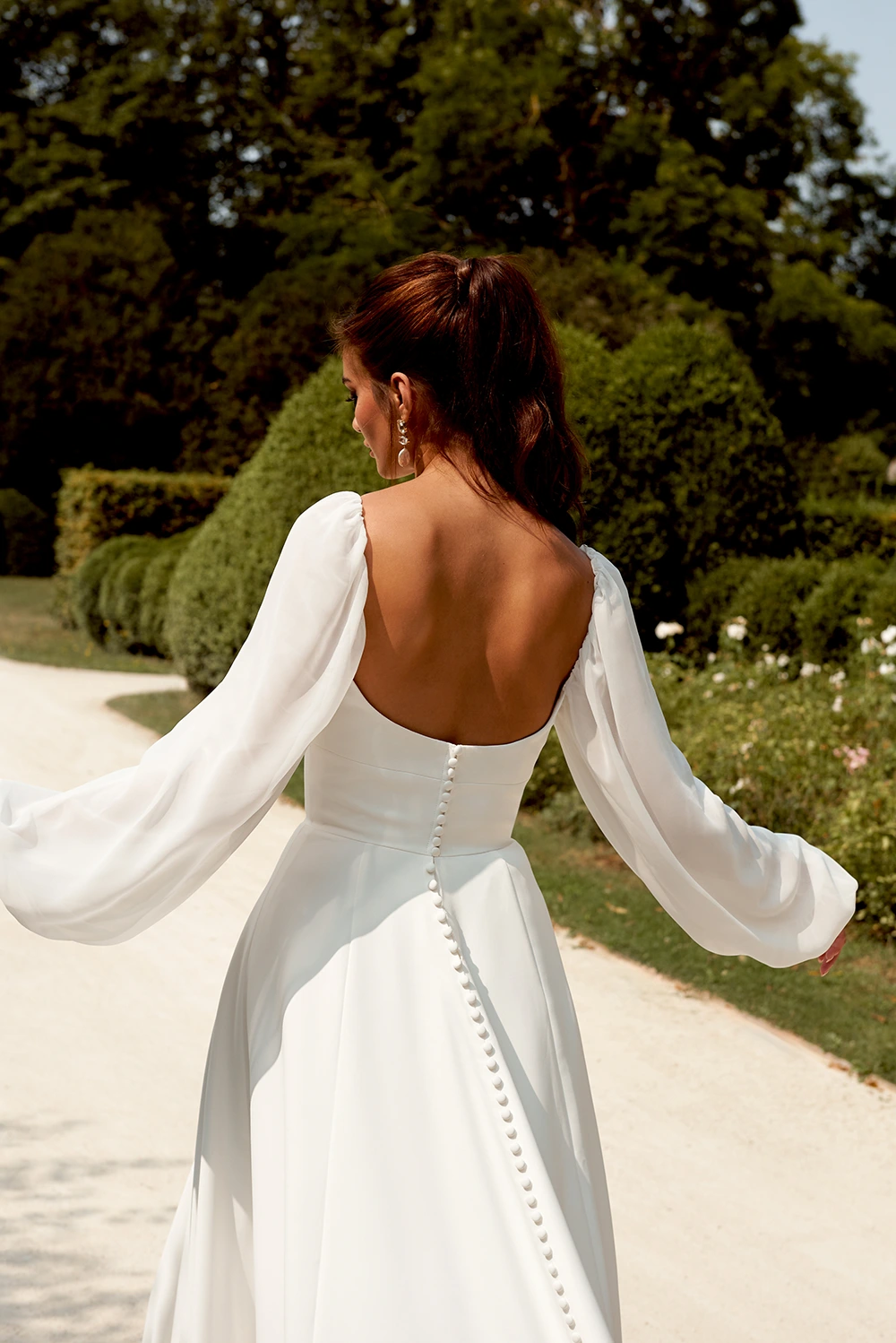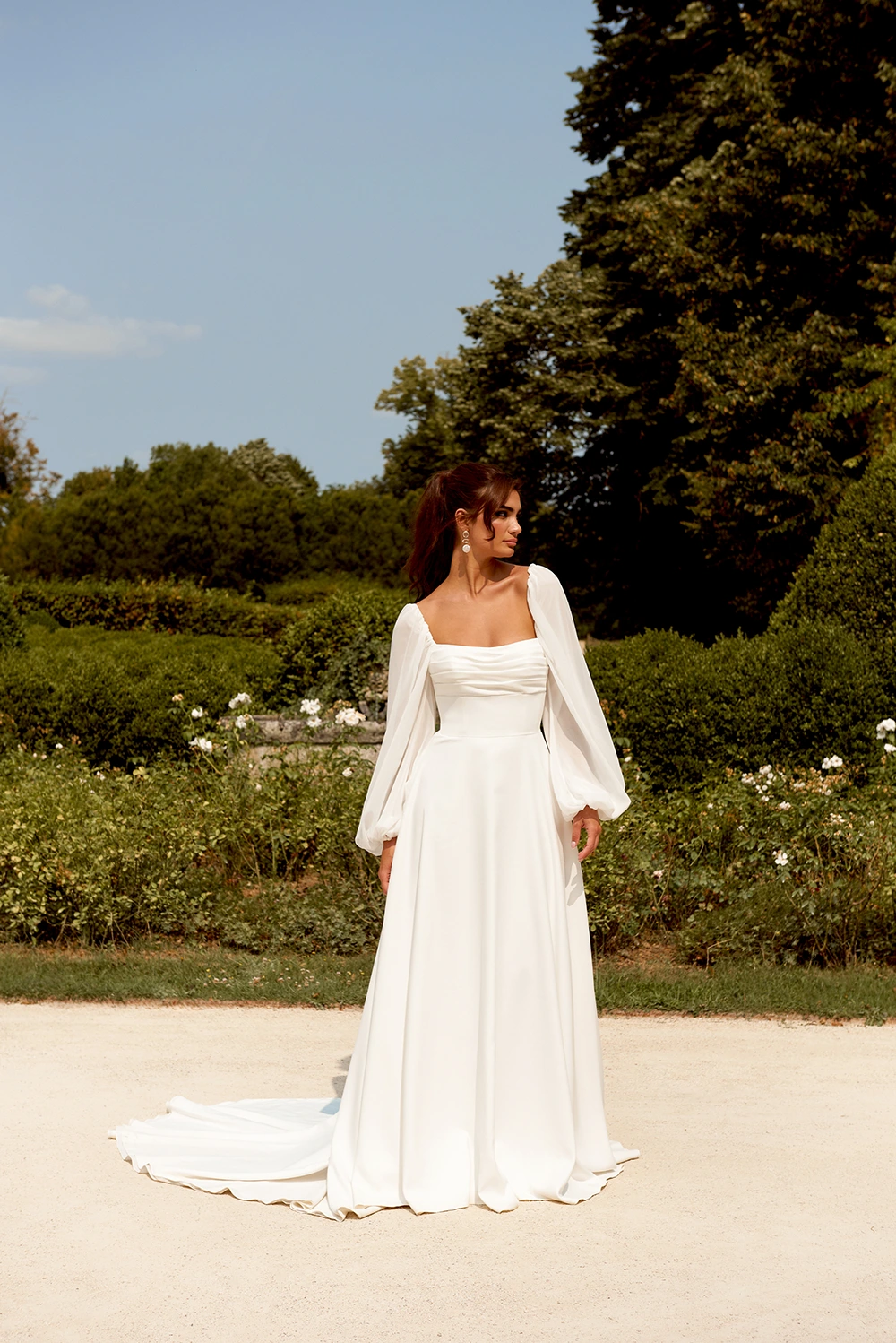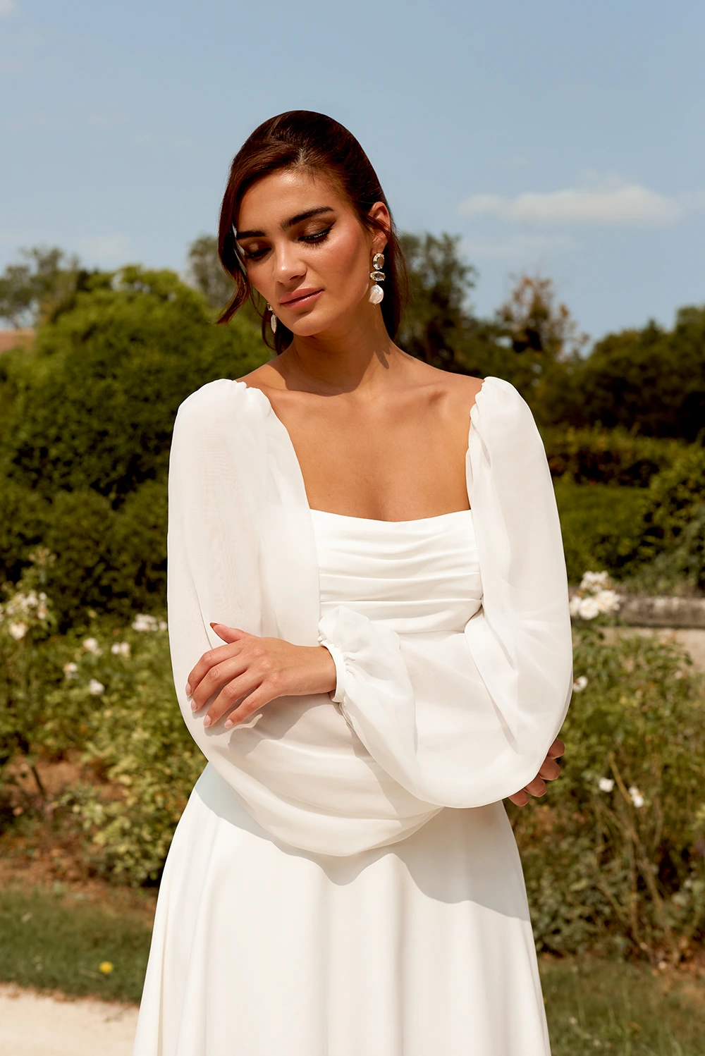 Das Modell 44509 von Sincerity ist ein weich fließendes A-Linien Brautkleid mit langen Ärmeln.