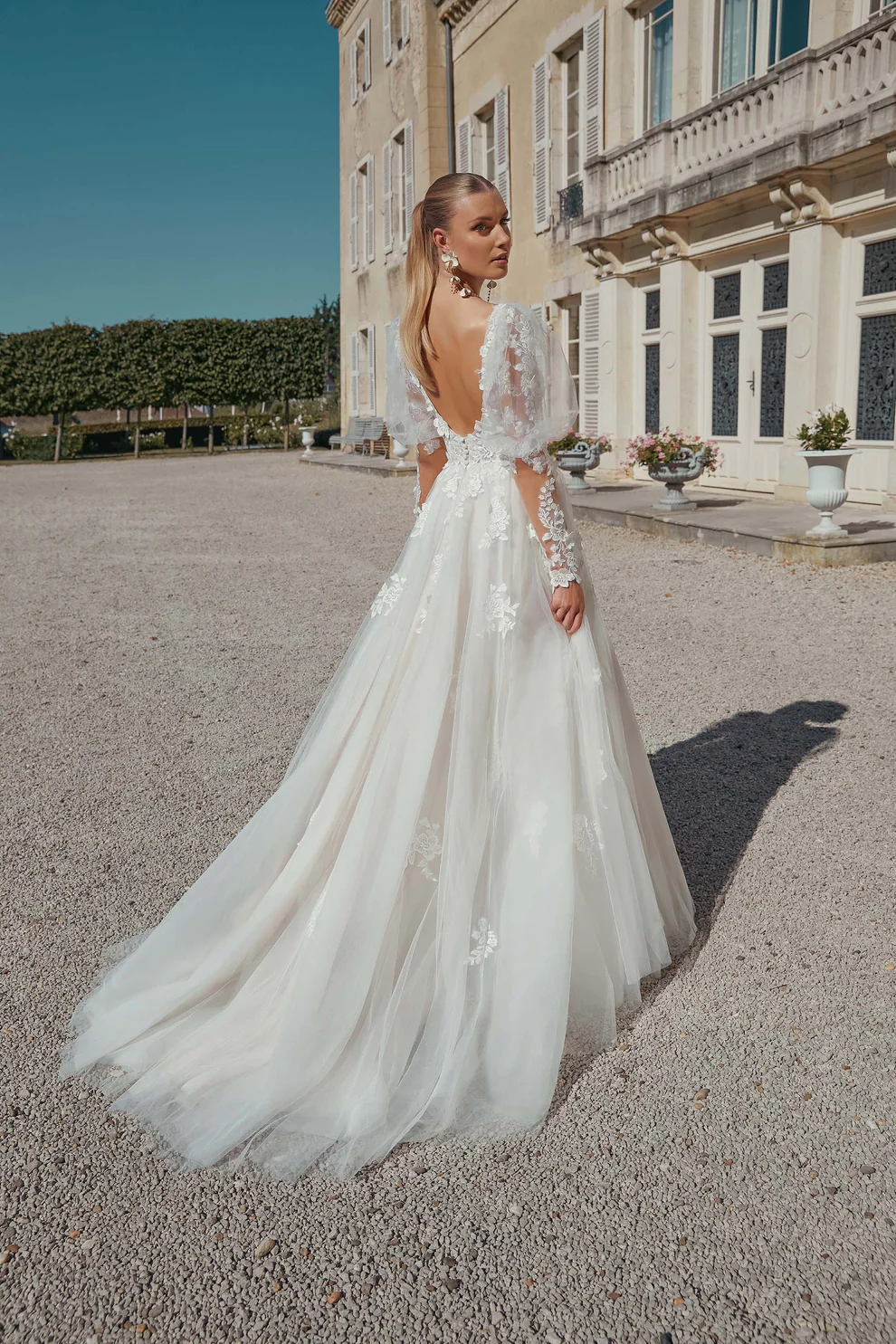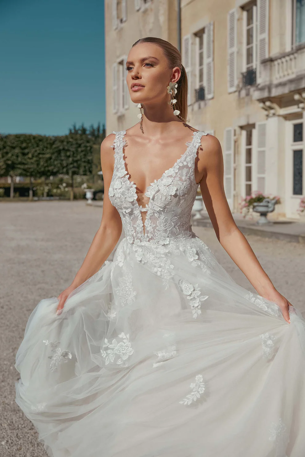 Das Brautkleid 44468 von Sincerity Bridal ist ein romantisches A-Linien Brautkleid mit tiefem Dekolleté und 3D besetzter Spitze.
