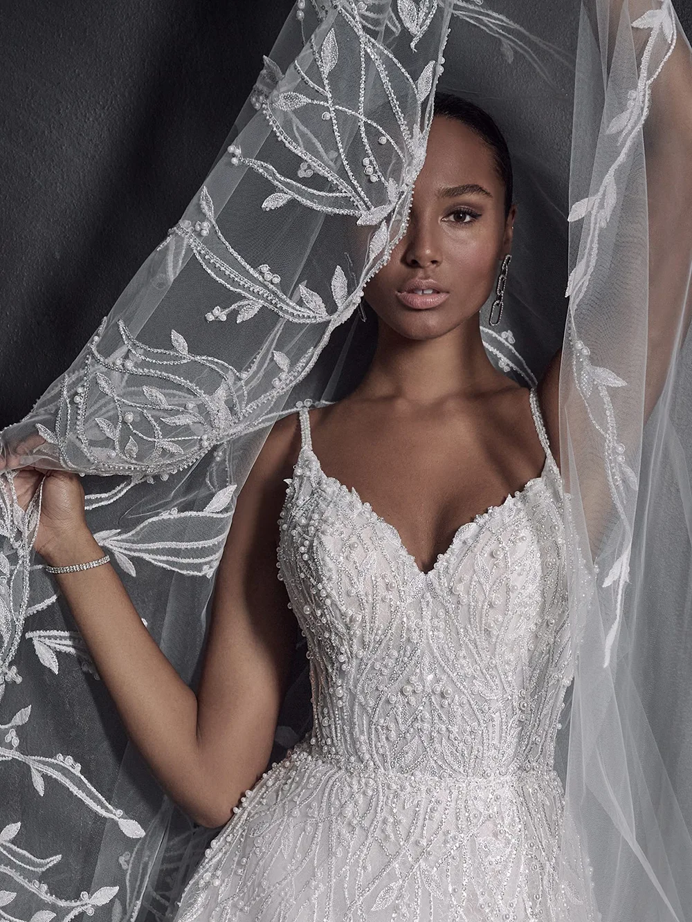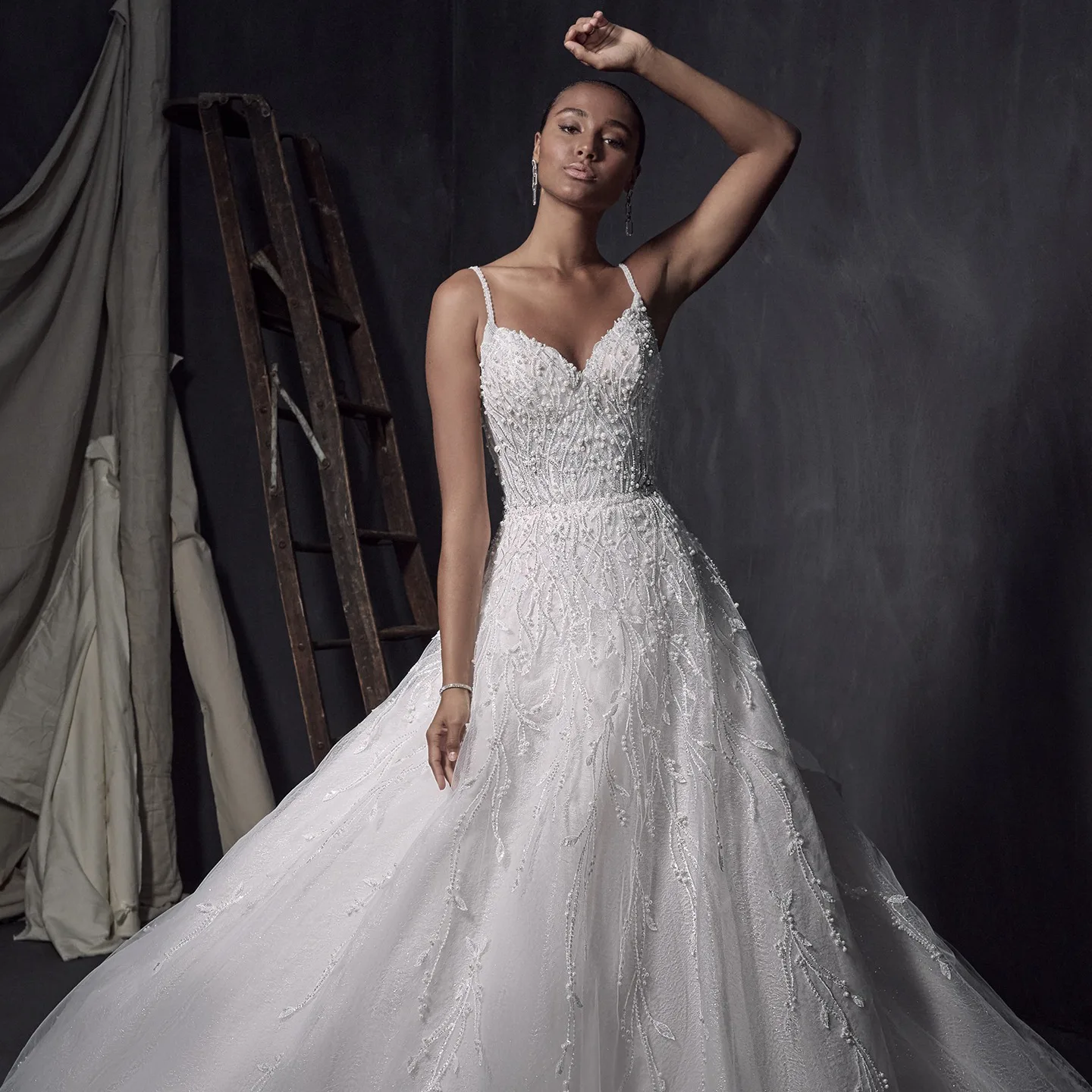 Marvine von Maggie Sottero präsentiert sich als überaus glamouröses, glitzerndes Brautkleid. Das am Oberteil symmetrisch verlaufende, vollständig mit Perlen und Pailletten bestickte Spitzenmuster verliert sich auf dem ausgestellten Rock. Auch die Spaghettiträger, die rückseitige Knopfleiste sowie das Taillenband sind mit Perlen bedeckt. Der mehrlagige Rock aus glitzerndem Tüll erhält durch seine moderne Textur besonders an der elegant drapierten Schleppe einen lebendigen Charakter.