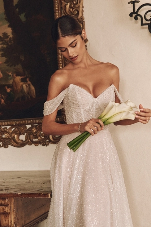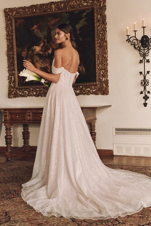 Das Brautkleid Monica von Sottero and Midgley ist ein glitzerndes A-Linien Brautkleid, mit besonderen Raffungen im Oberteil.