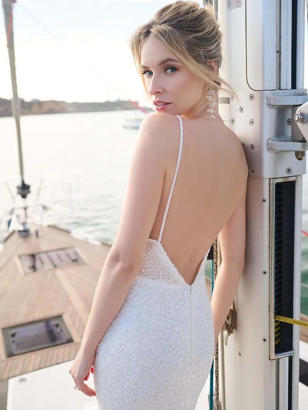Das Brautkleid Topaz von Sottero and Midgley ist ein sexy, perlenbesetztes Meerjungfrauen-Brautkleid mit tiefem V-Ausschnitt, oberschenkelhohem Beinschlitz und sexy V-Rückenausschnitt.