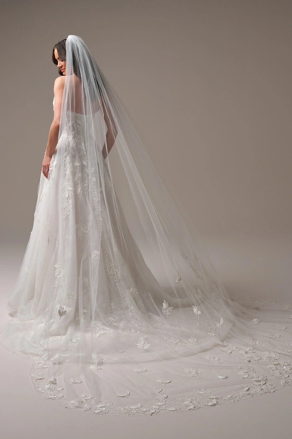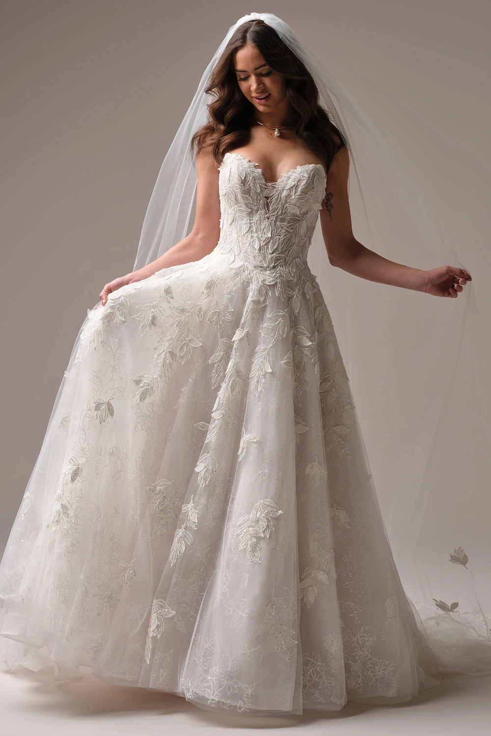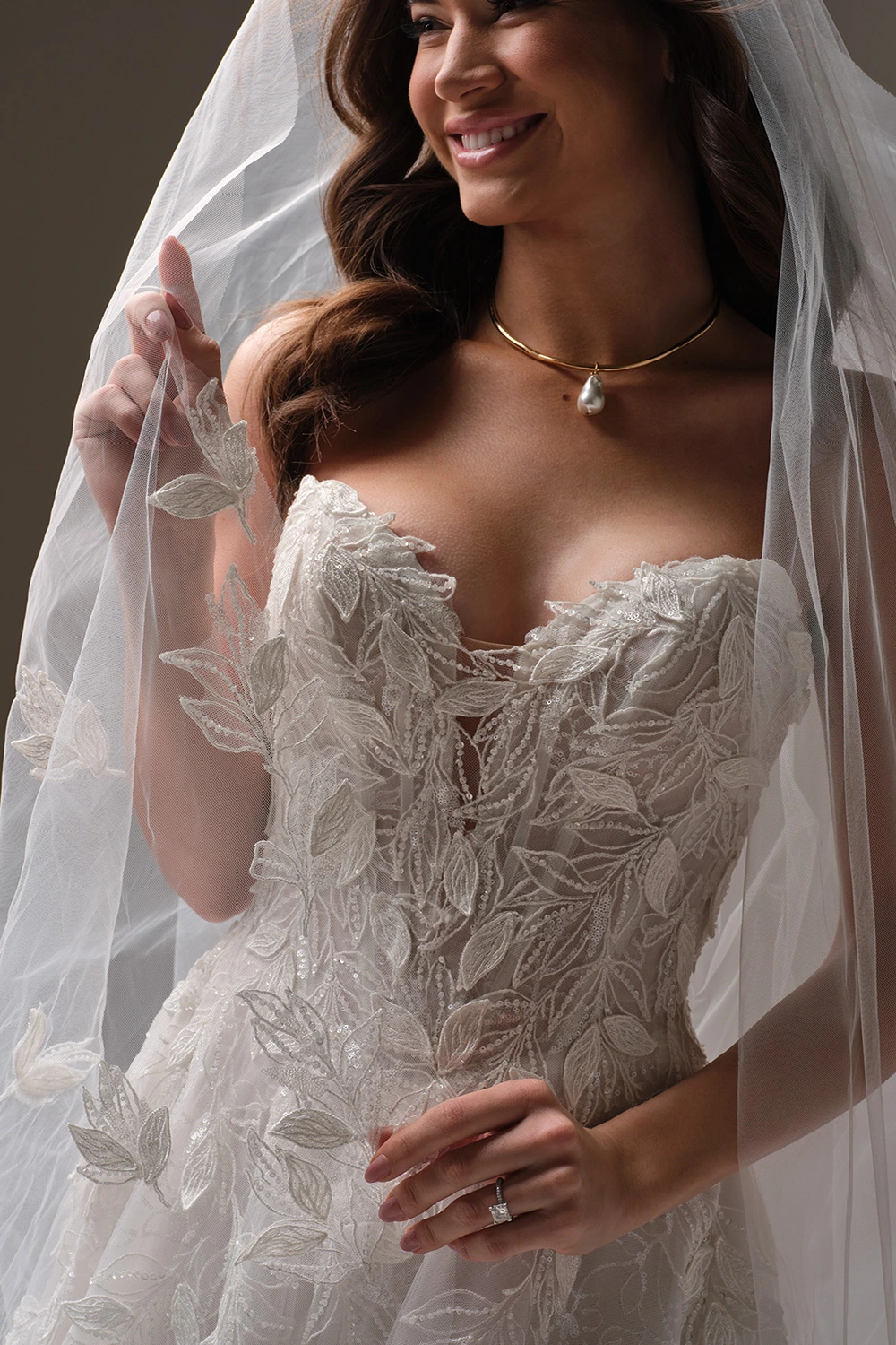 Das Modell Maritza von Sottero und Midgley ist ein floral schimmerndes A-Linien Brautkleid mit floralen Spitzenapplikationen.