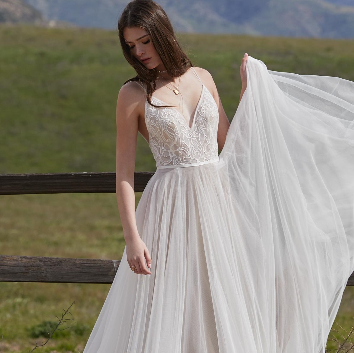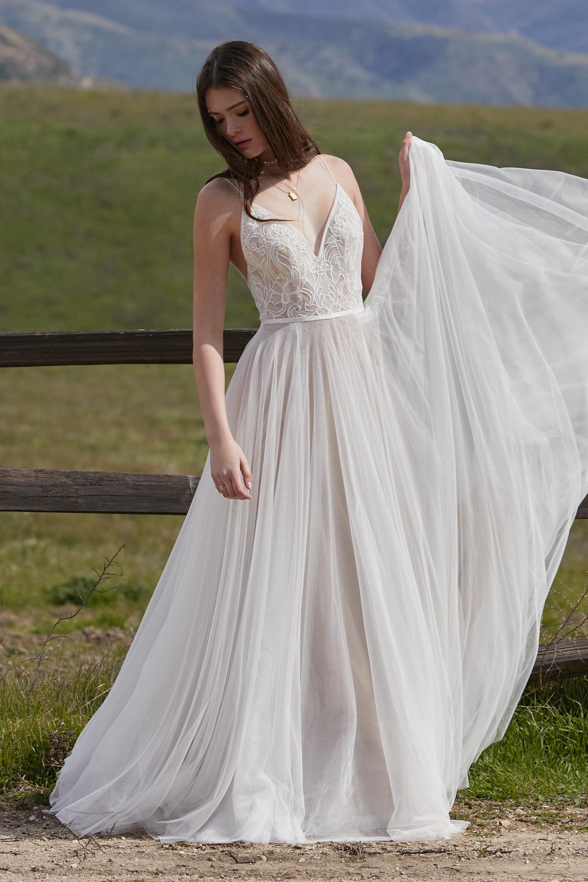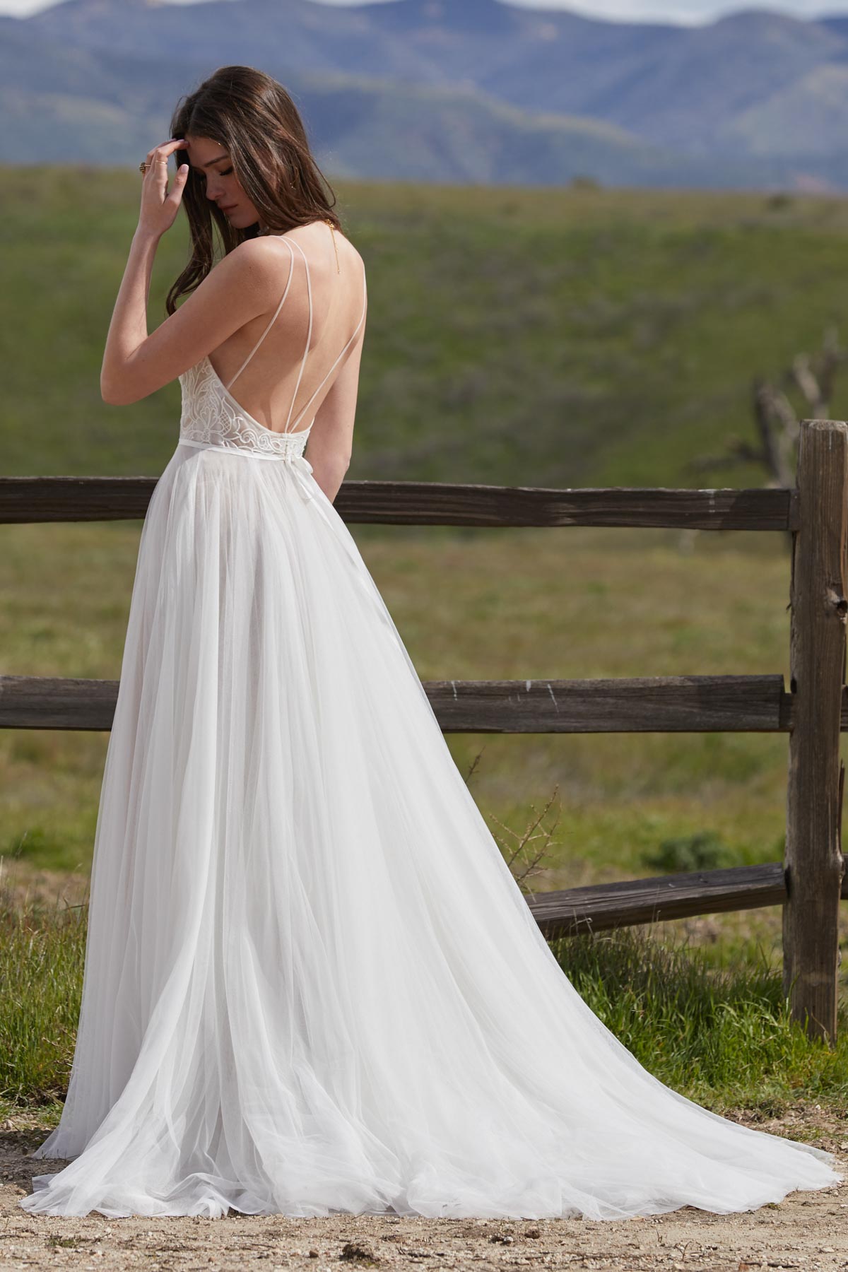 Die minimalistische Formgebung des Brautkleids Harper bringt durch die schmalen, sich über der Schulter aufteilenden Trägerriemchen besonders den freien Rücken zur Geltung. Das Oberteil aus besticktem Organza ist semitransparent und durch ein Taillenband, das hinten zur Schleife gebunden werden kann, vom Rock abgesetzt. Der sanft fließende Tüllrock formt auf dem Boden eine Hofschleppe.