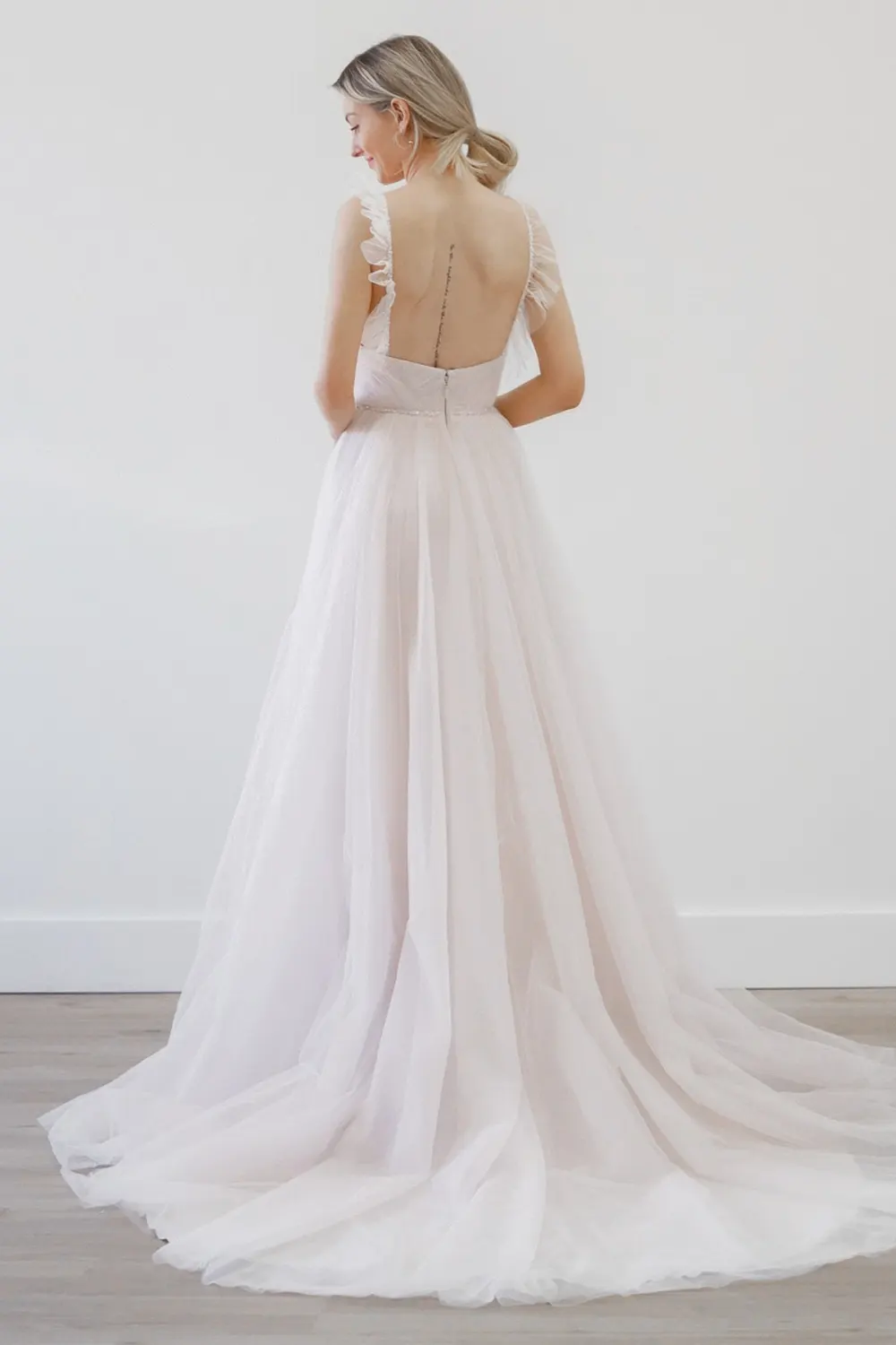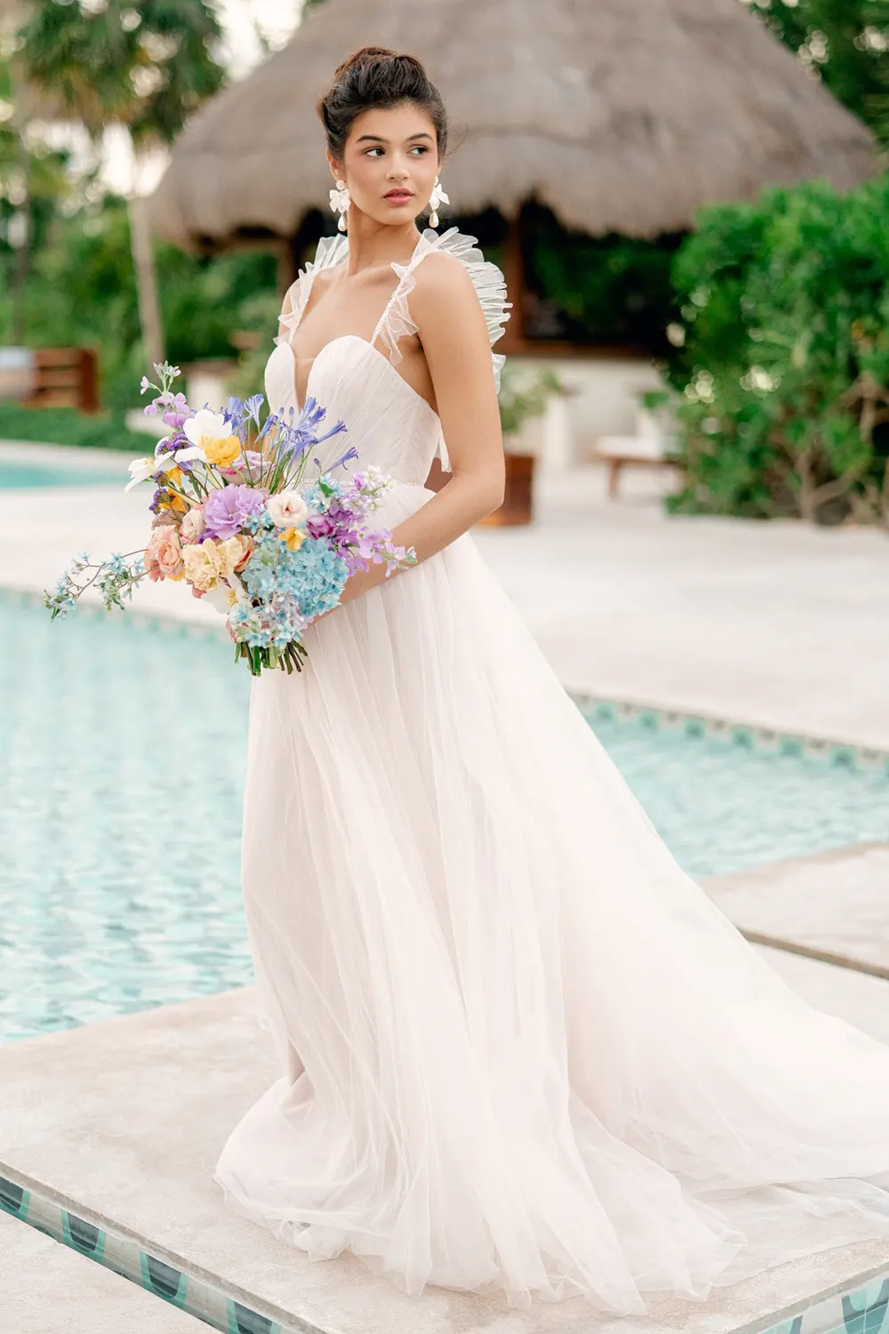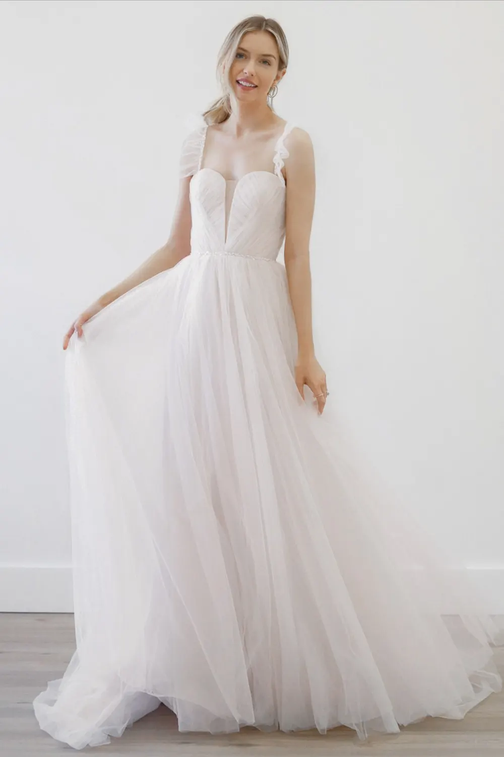Das Brautkleid Lilly von Watters Wtoo ist ein romantisches A-Linien-Brautkleid mit plissierten und gerüschten Tülldetails, die dich in eine romantische Braut verwandeln.