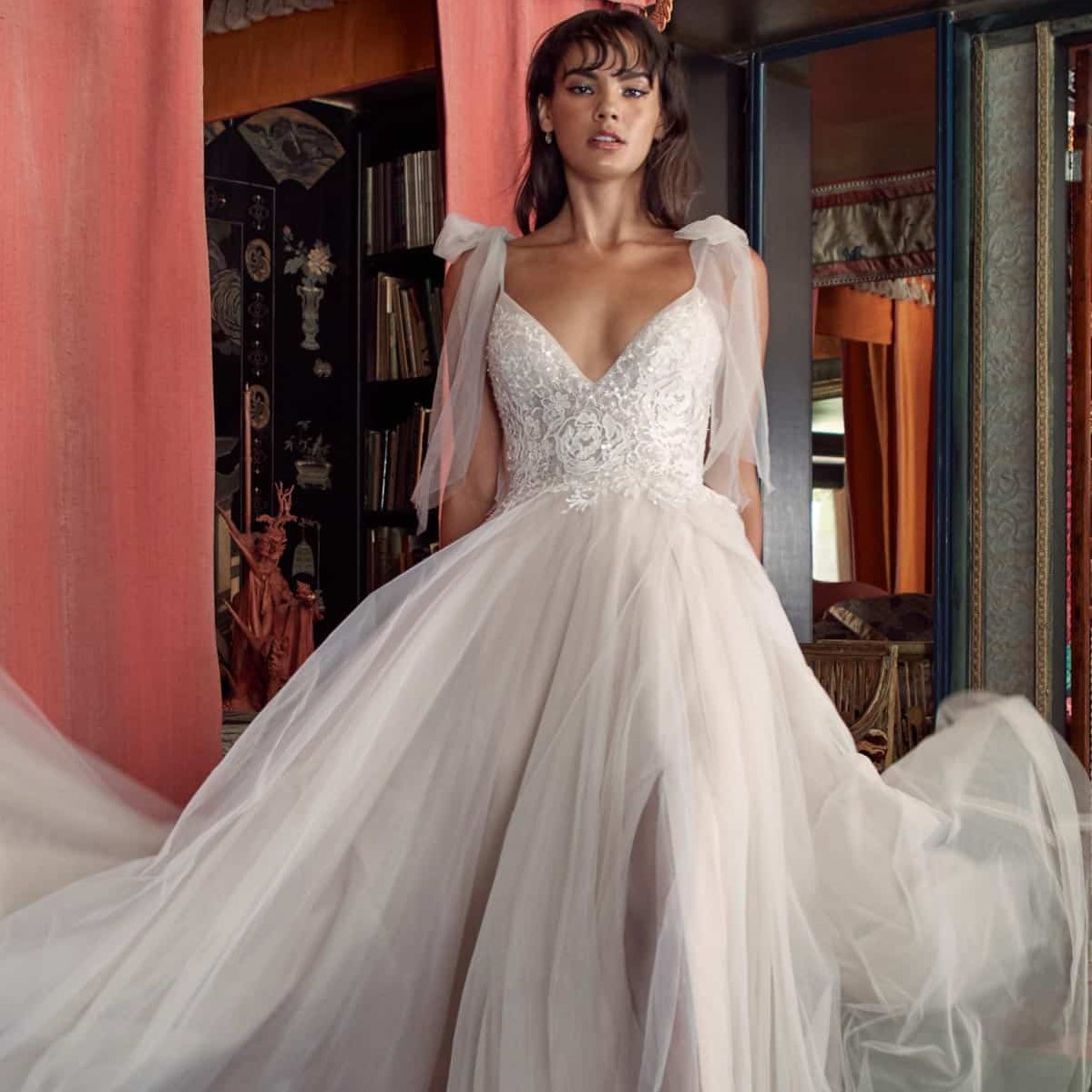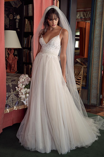 Truvy ist die perfekte Kombination aus süß und romantisch. Das aus Tüll und Organza gefertigte Brautkleid ist am Oberteil mit Spitze und Perlen in großflächigen Blütenmotiven verziert. Schmale Spaghettiträger gehen über in einen tiefen Rückenausschnitt. Ein langer seitlicher Schlitz im Rock mit Kapellenschleppe garantiert Bewegungsfreiheit. Das Taillenband und die Schleifen an den Trägern sind optional und können selbst gebunden werden.