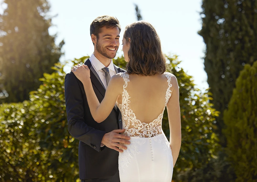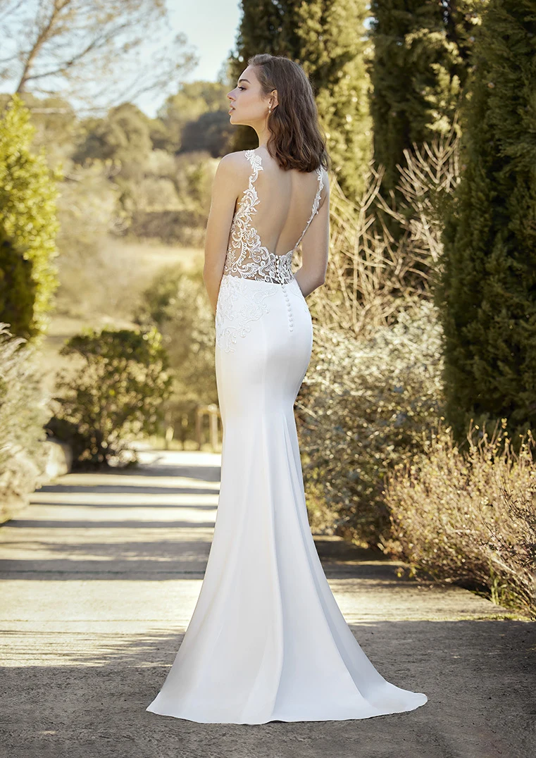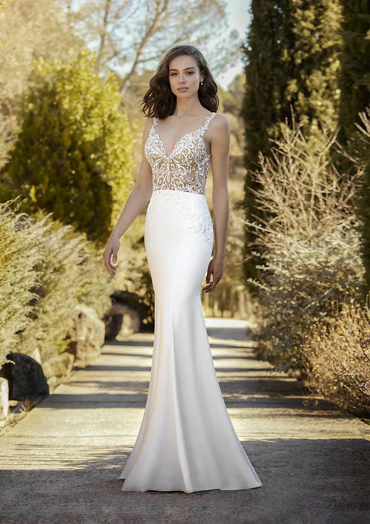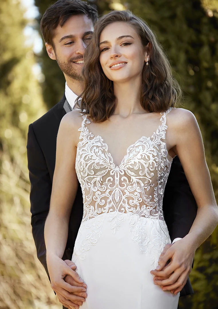 Das Brautkleid Admiration von White One bietet den Kontrast aus aufregendem Top und schlichtem Rock. Barocke Spitze bedeckt in symmetrischen Muster das transparente Oberteil sowie gemeinsam mit Pailletten den Übergang zur Rockpartie. Am tiefen Rückenausschnitt setzt zudem eine Knopfleiste an. Der schmale, glatte Satinrock bildet mit dezentem Schimmer das ruhige Element dieses Entwurfs.