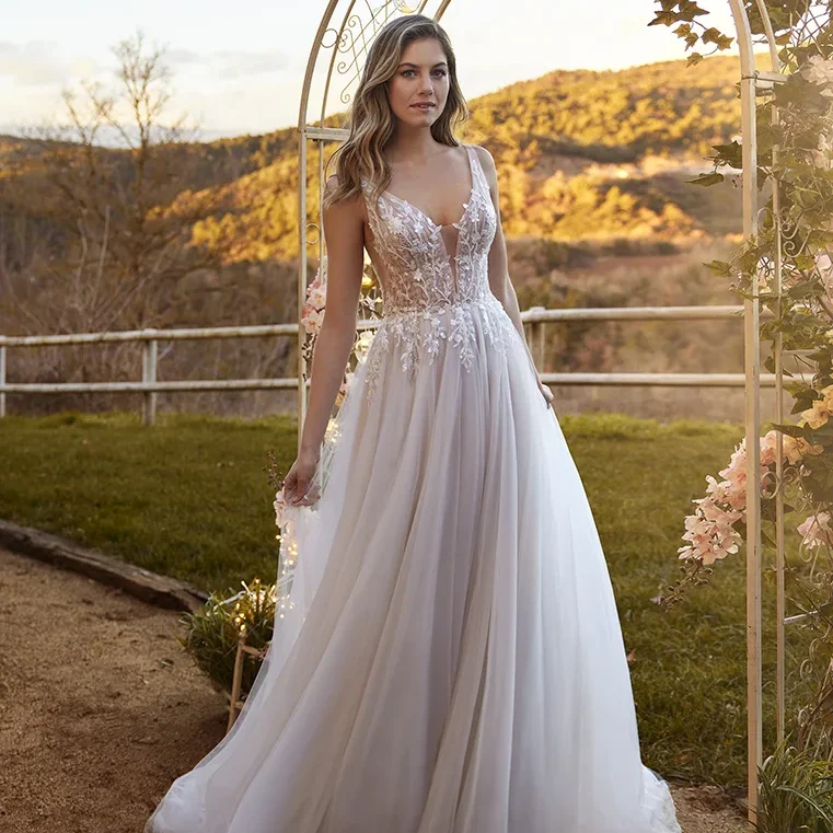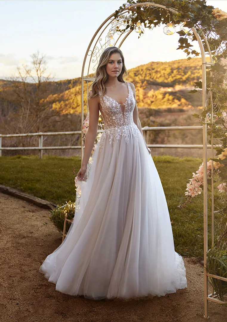 Anpu von White One ist ein Brautkleid mit klassischem Schnitt und romantisch-modernem Boho-Look. Perlen- und Paillettenbestickte Spitze bedeckt sein Oberteil aus transparentem, gerafftem Tüll und läuft anschließend in der Rockpartie aus. Mit Netzstoff stabilisierte Seitenschlitze komplementieren das tiefe Dekolleté. Ab der Taille weitet sich der zartrosa gefütterte Rock aus weichem Tüll und ergießt sich schließlich in eine lange, mehrlagige Schleppe.