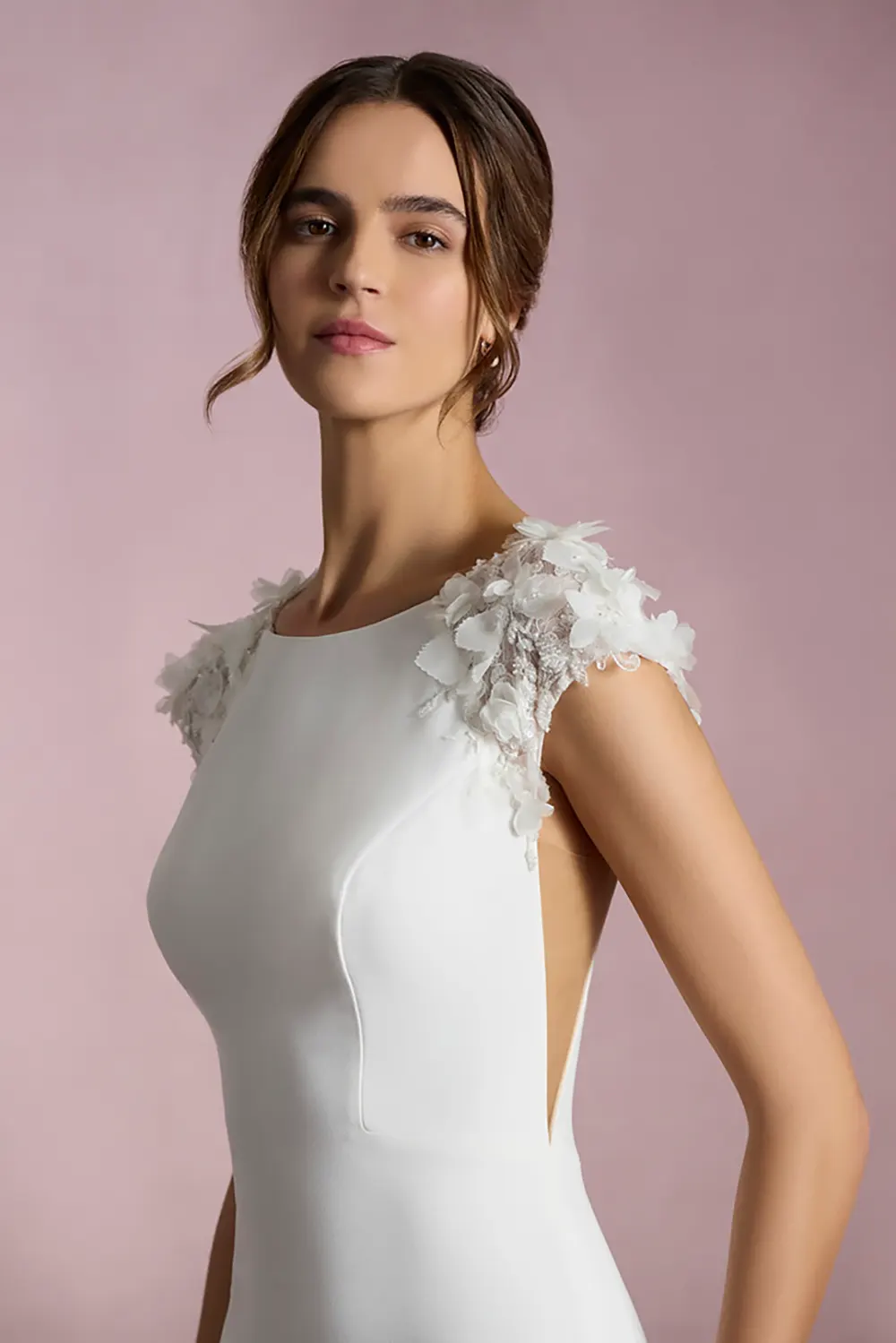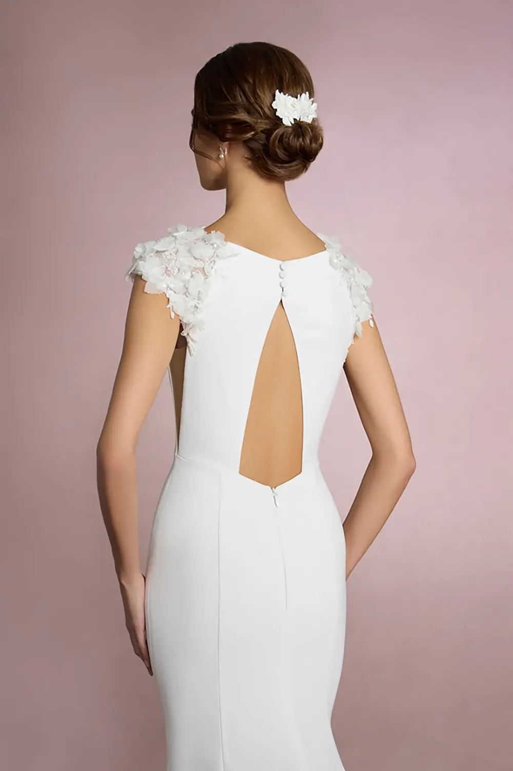 Das Brautkleid Atsuko von White One ist ein schlichtes, figurbetontes Kleid mit aufregenden Blütendeatils an den Schultern und einem Schlüssellochausschnitt am Rücken.