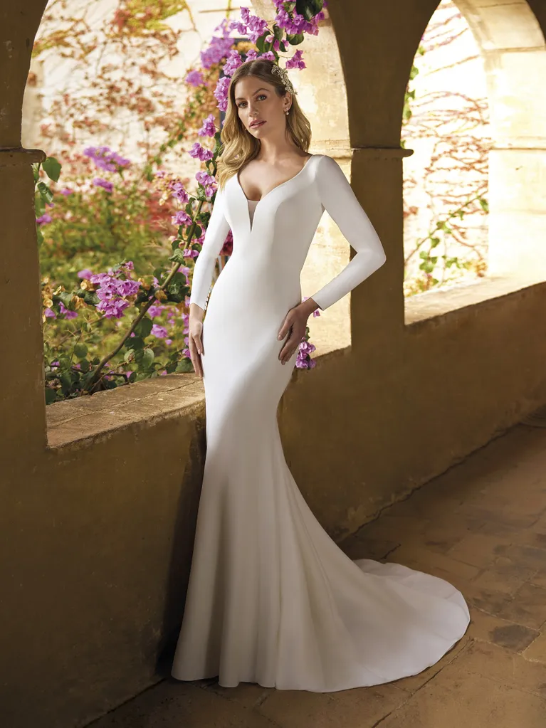 Das Brautkleid Carlton von White One ist ein minimalistisches, formelles Meerjungfrauen-Brautkleid mit eleganten Schlüssellochrücken.